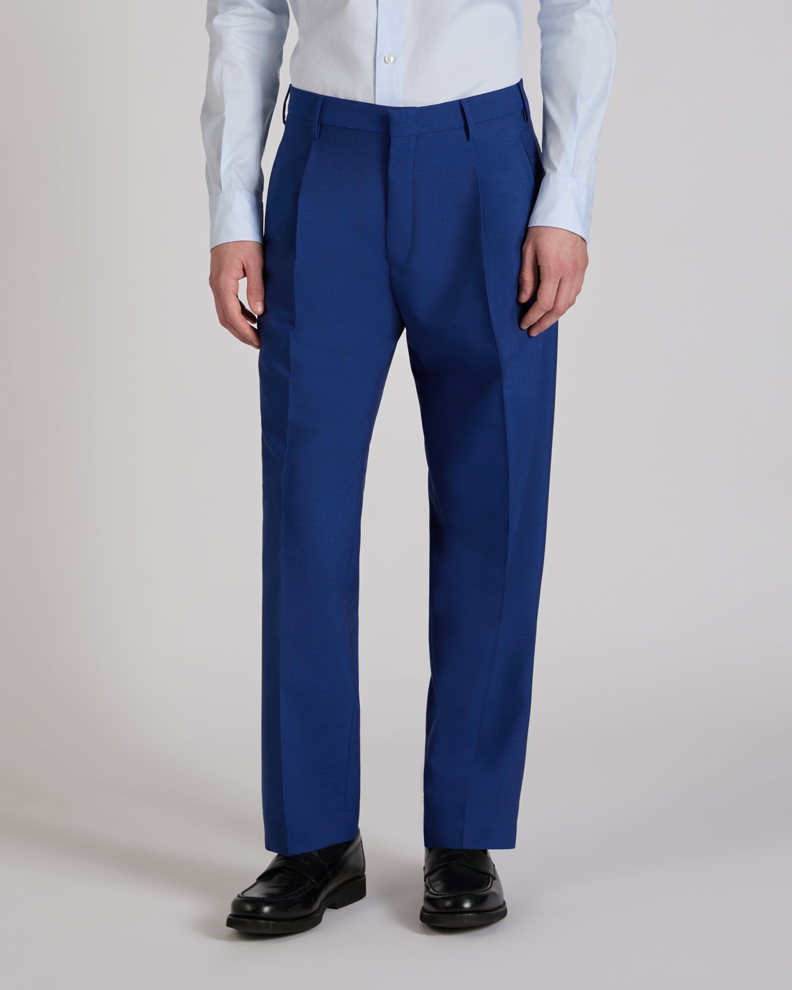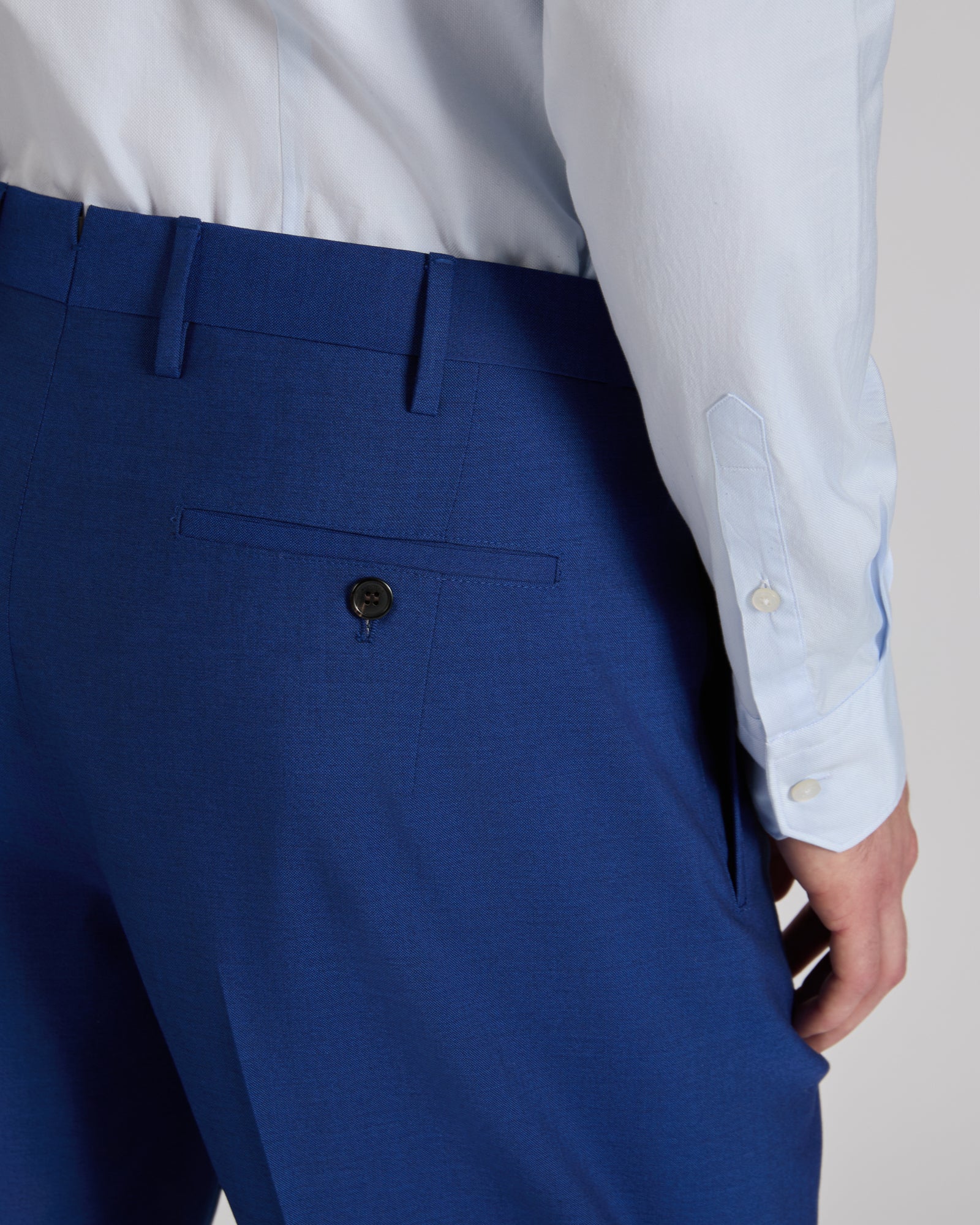 - Die Hose hat einen selbstsichernden Reißverschluss, einen Innenhaken am Gürtel, Leistentaschen vorne, Gesäßtaschen mit Einzelnaht und Knopf und eine über die Tasche hinausgehende Aufnahme sowie eine Bundfalte vorne.