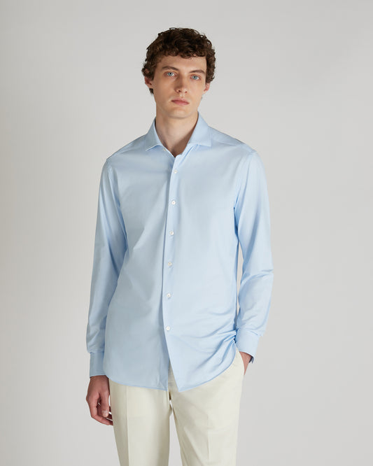 „Chinolino“ ist ein innovativer, sehr dünner Batavia-Stoff, der aus einer kostbaren Mischung aus Leinen und Baumwolle hergestellt wurde: Die atmungsaktiven Eigenschaften von Leinen werden mit der Weichheit von Baumwolle kombiniert, um ein frisches und sommerliches Kleidungsstück zu erhalten. Darüber hinaus wurde das Gewebe durch ein zertifiziertes Verfahren hergestellt, das die Sicherheit von Mensch und Umwelt und die Minimierung der Verwendung schädlicher Chemikalien in allen Produktionsphasen gewährleistet. Das Modell ist das ikonische Modell 39, das die gleichen Eigenschaften wie das Modell 30 in einer regulären Passform aufweist.