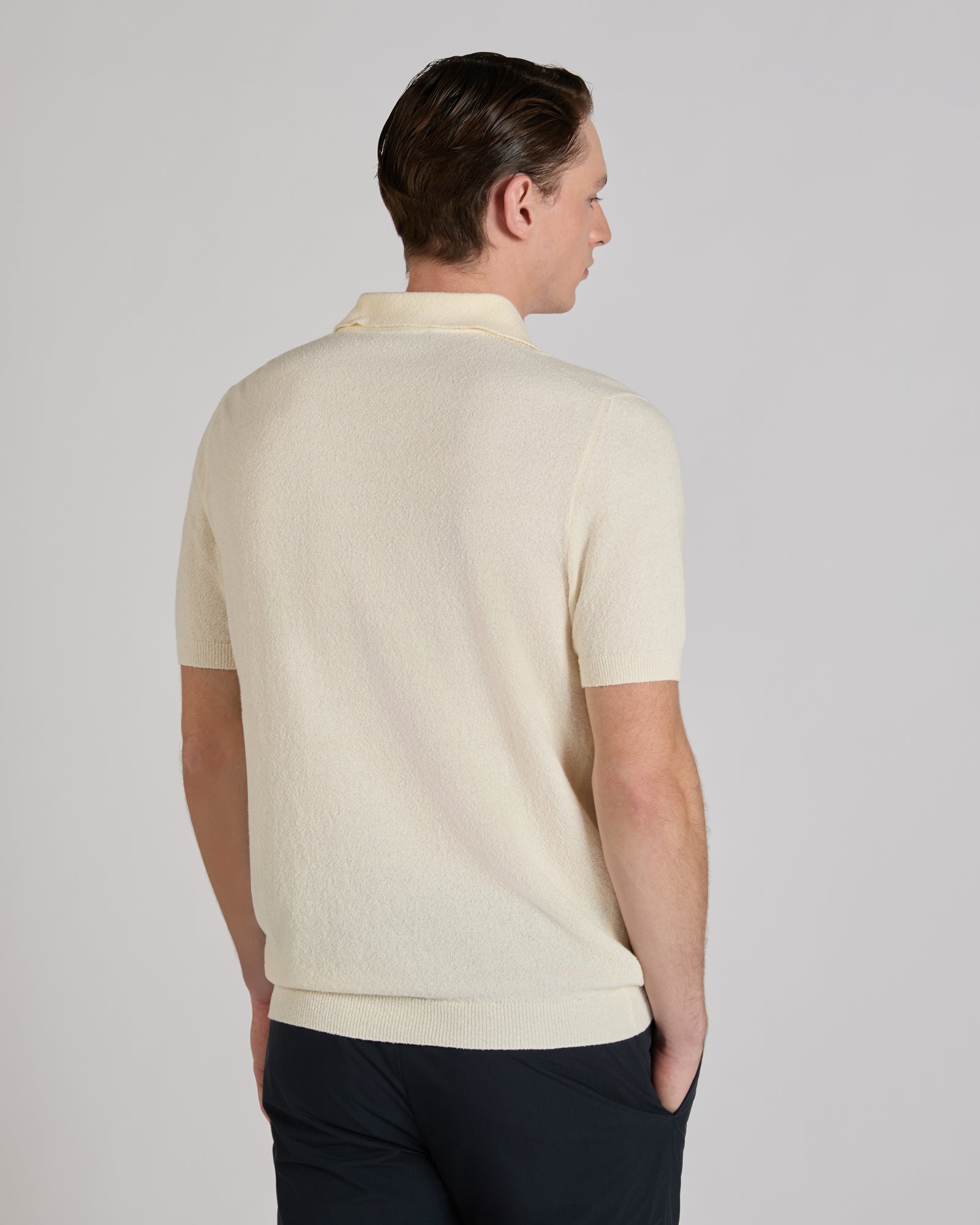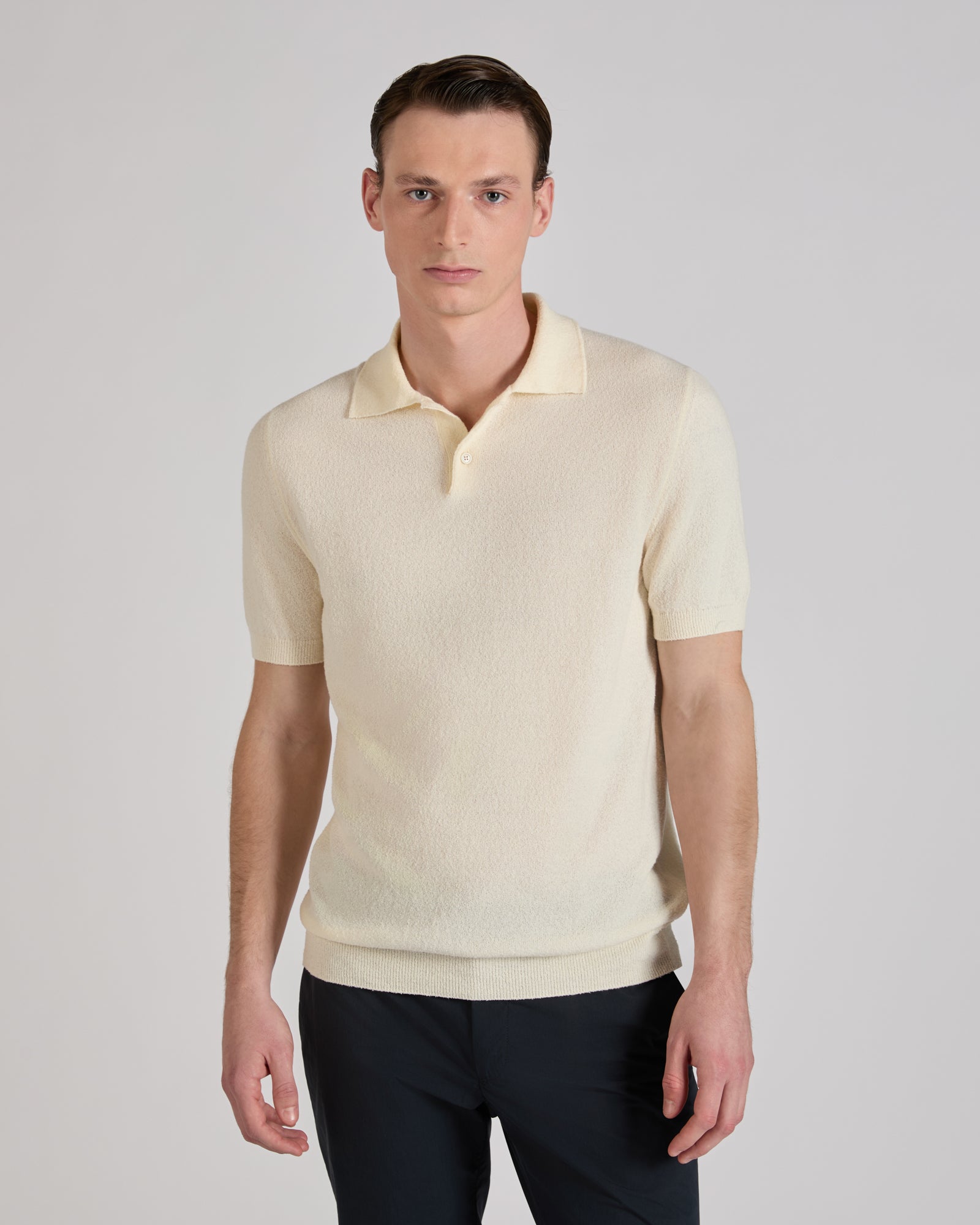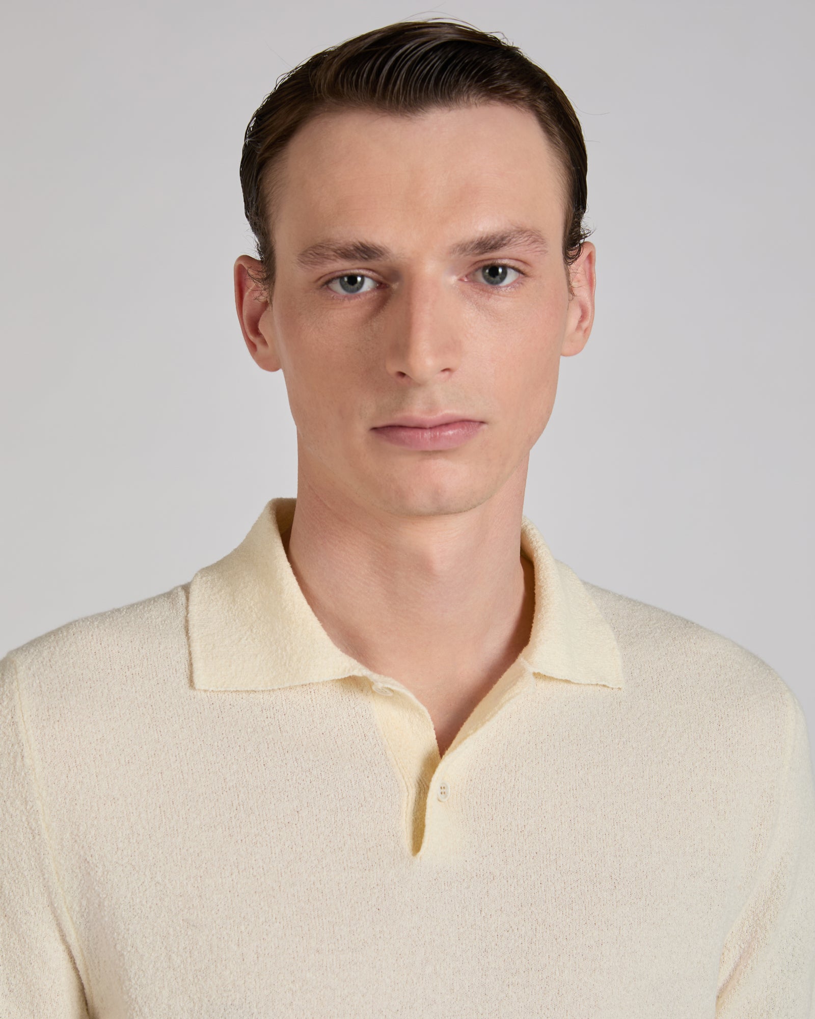 Dieses Poloshirt mit schmaler Passform interpretiert einen Klassiker der Garderobe mit einer materiellen und zeitgemäßen Note neu. Es ist aus Baumwollbouclé gefertigt, einer Webart, die sich durch kleine Ringe und Knoten auszeichnet, die eine unregelmäßige und dreidimensionale Oberfläche schaffen. Dieser besondere Effekt verleiht dem Kleidungsstück Tiefe, Weichheit und eine unverwechselbare Ästhetik. Der Stoff ist eine weiche Baumwolle, die durch ein zertifiziertes Verfahren hergestellt wird, das die Sicherheit von Mensch und Umwelt in allen Produktionsphasen gewährleistet.