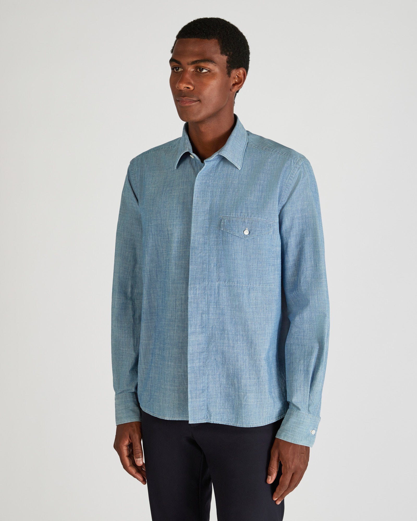 In high-quality shirts, chambray has a place of honour. Highly valued for its durability yet lightweight nature, it is used here in a casual fit design. The inserted pocket detail is original, with a flap that can be hidden inside, to easily switch from casual to more formal uses. The fabric has been produced through a certified process that ensures worker safety and respect for the environment at all stages of production.