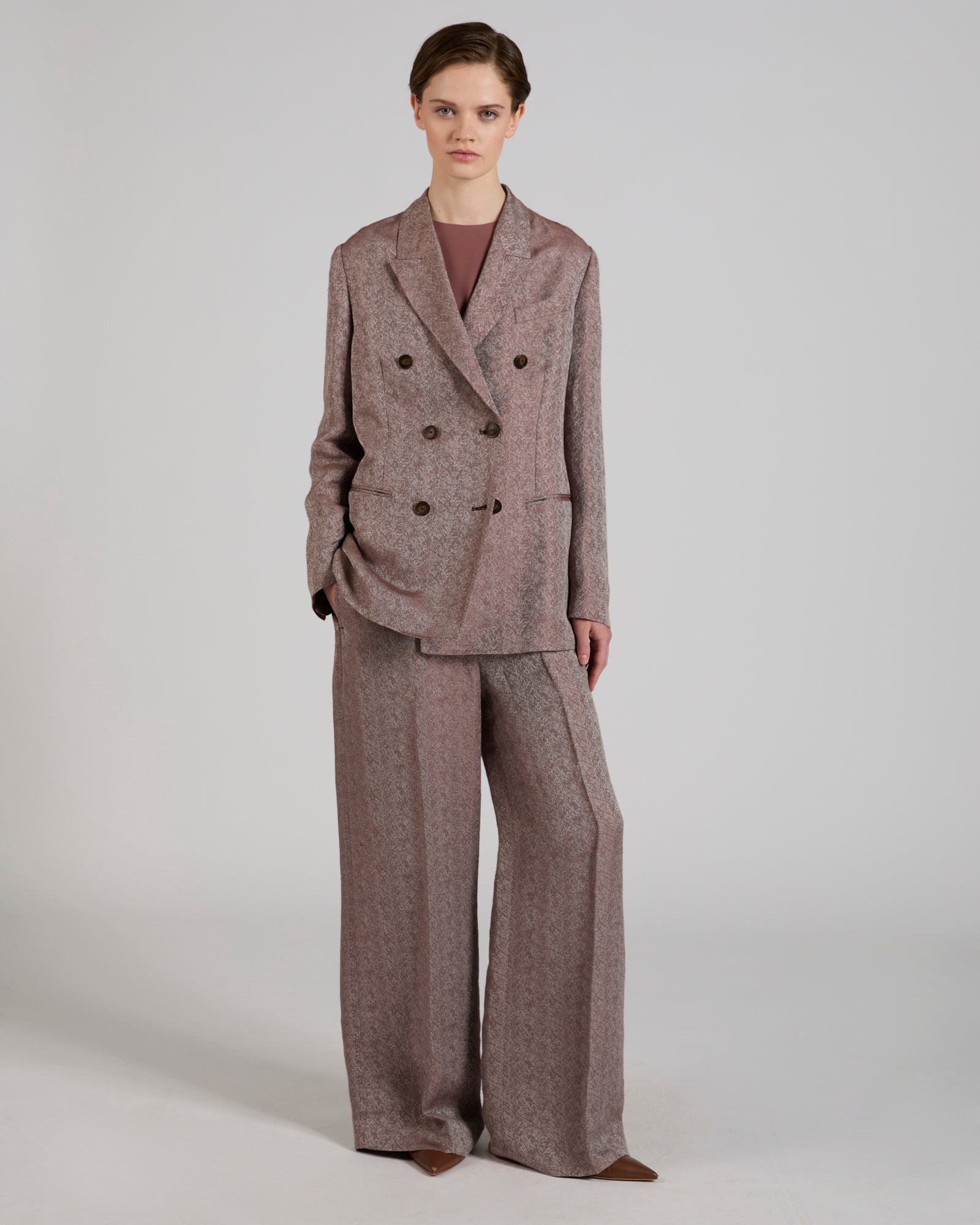 With its sophisticated, contemporary character, these trousers are crafted from an exclusive linen and viscose herringbone weave. The fabric is created using an interwoven herringbone jacquard construction, an original technique that results in a graphic, textured surface with rich visual depth and refined tactility. The double-colour yarn-dyeing enhances the texture's effect, creating a subtly iridescent result that plays with the light and lends the garment a distinctive character. The combination of linen and viscose ensures a cool, fluid hand, structured lightness and breathable comfort, ideal for accompanying the season with natural elegance. The trousers can be paired with the blazer made from the same fabric, for a highly original suit.
