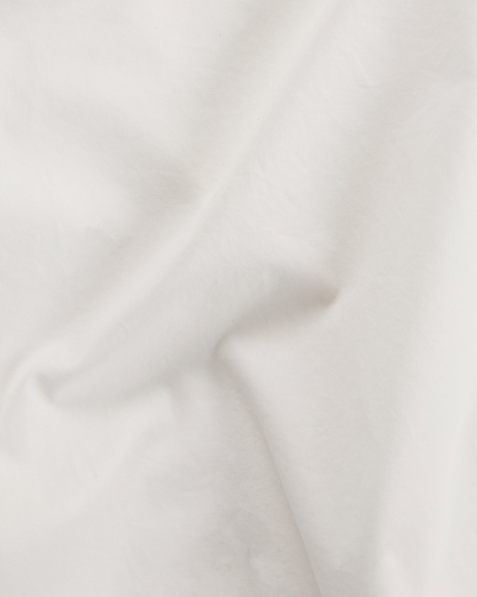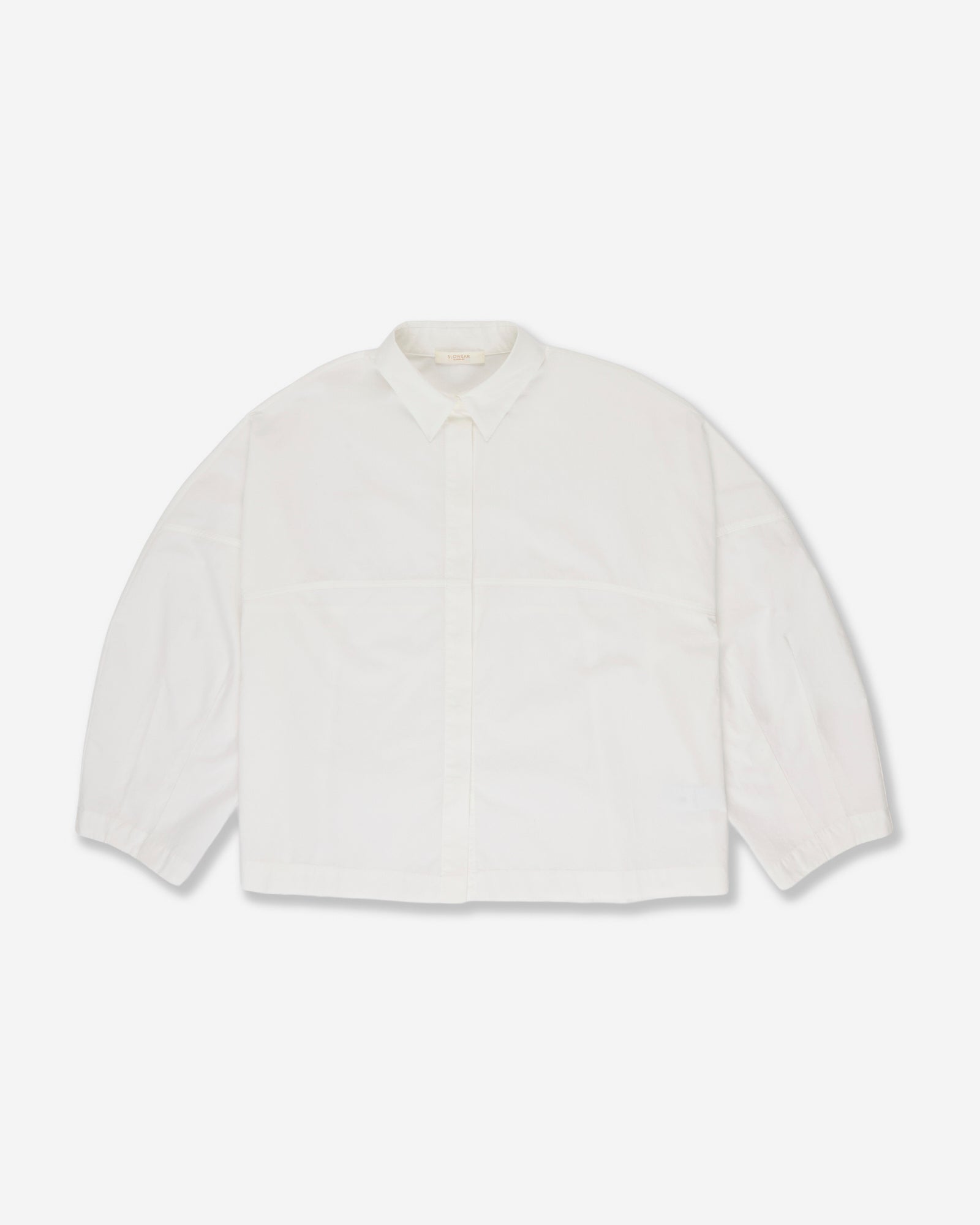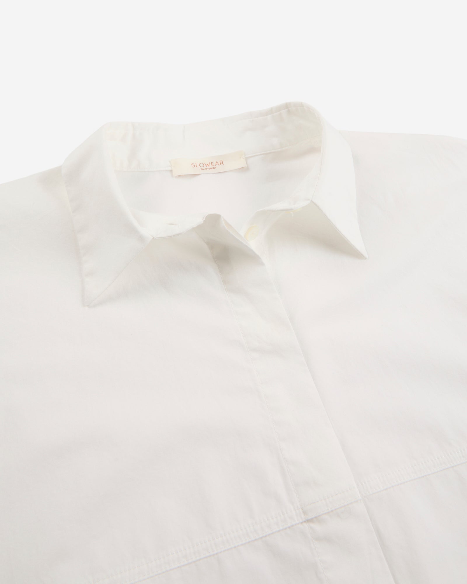 This shirt expresses the full originality of women's dressing, thanks to its oversized fit and refined details such as the yoke extending along the sleeve, finished at the cuff with small darts that give the shape a distinctive character. It is made of cotton poplin, a compact and lightweight fabric, which is distinguished by its cool feel, smooth surface and durable yet breathable structure. Moreover, the fabric has been produced through a certified process that ensures worker safety and respect for the environment at all stages of production.