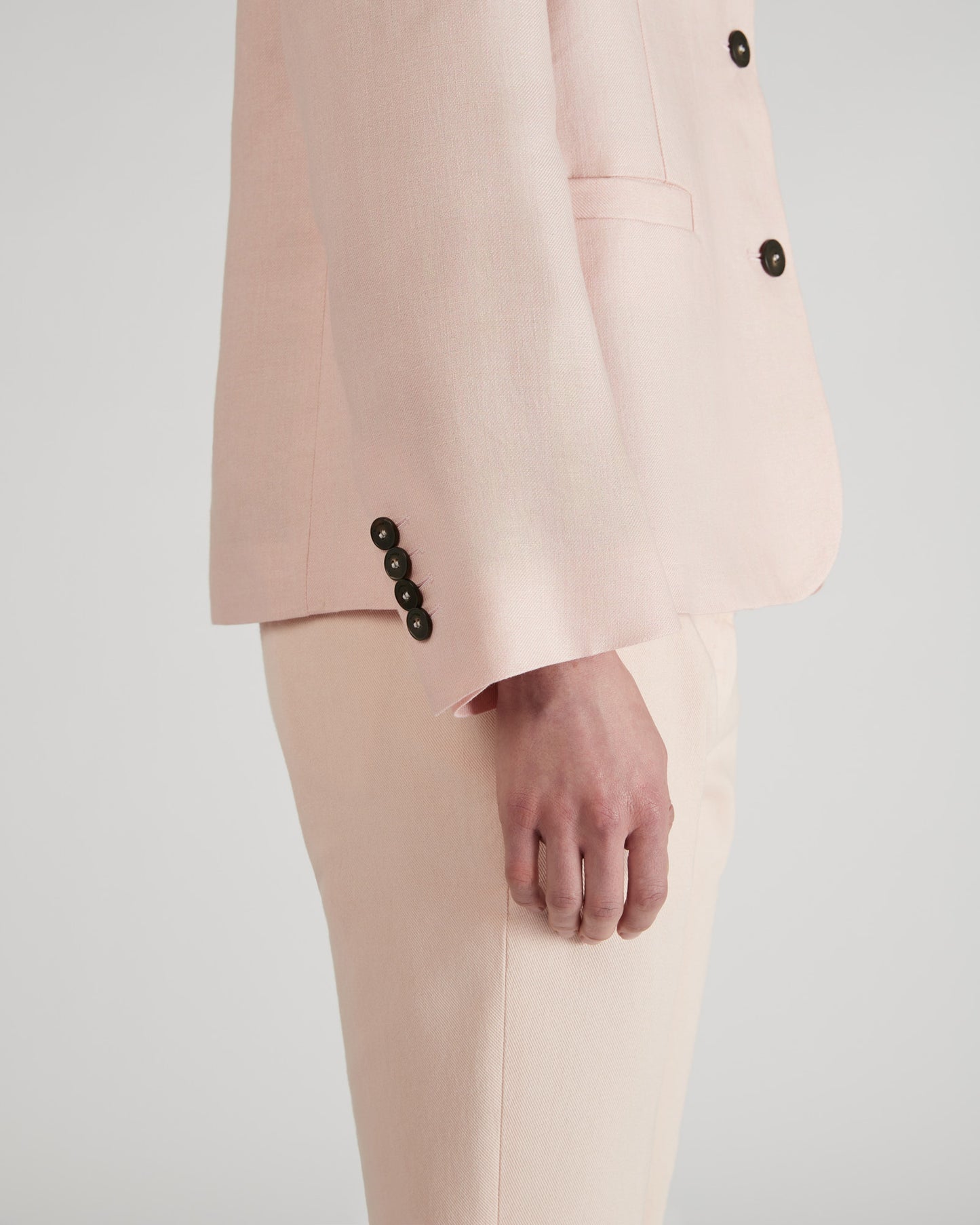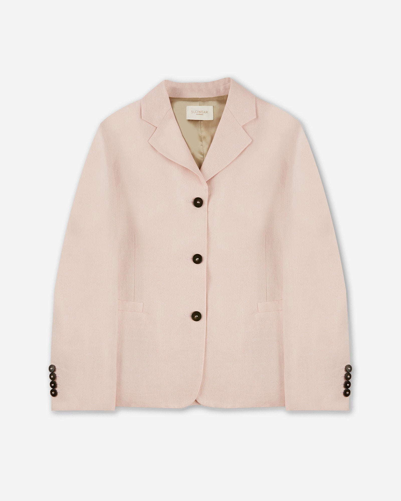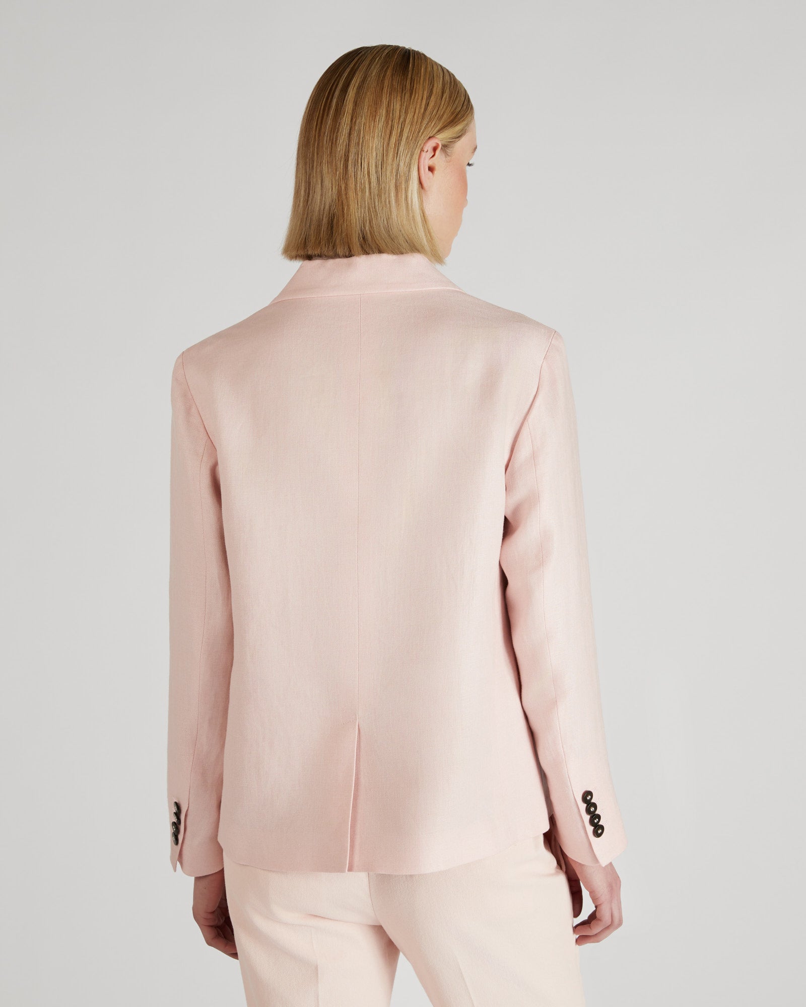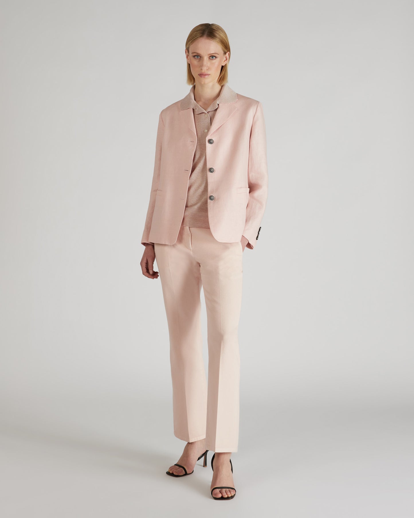Linen is one of the world's oldest textile fibres. Centuries of innovation and research have consolidated its prominent role in women's dress. Much favoured for its subtly iridescent appearance, it is lightweight yet resilient and extremely pleasant to wear throughout the day. It is combined with the timeless style of the single-breasted blazer to create an extremely versatile garment. The jacket can be combined with trousers made of the same fabric, for a refined suit effect.