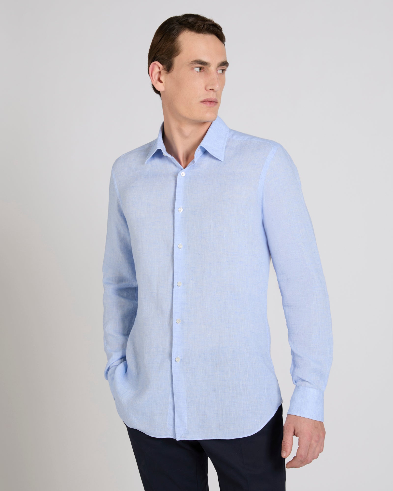Linen is one of the world's oldest textile fibres. Centuries of innovation and research have ensured its role as one of today's premium shirt fabrics: lightweight yet durable, with a slightly iridescent appearance, it is very pleasant to wear throughout the day. Here it is used on a regular-fit shirt and proposed in refined shades, a perfect expression of summer lightness.