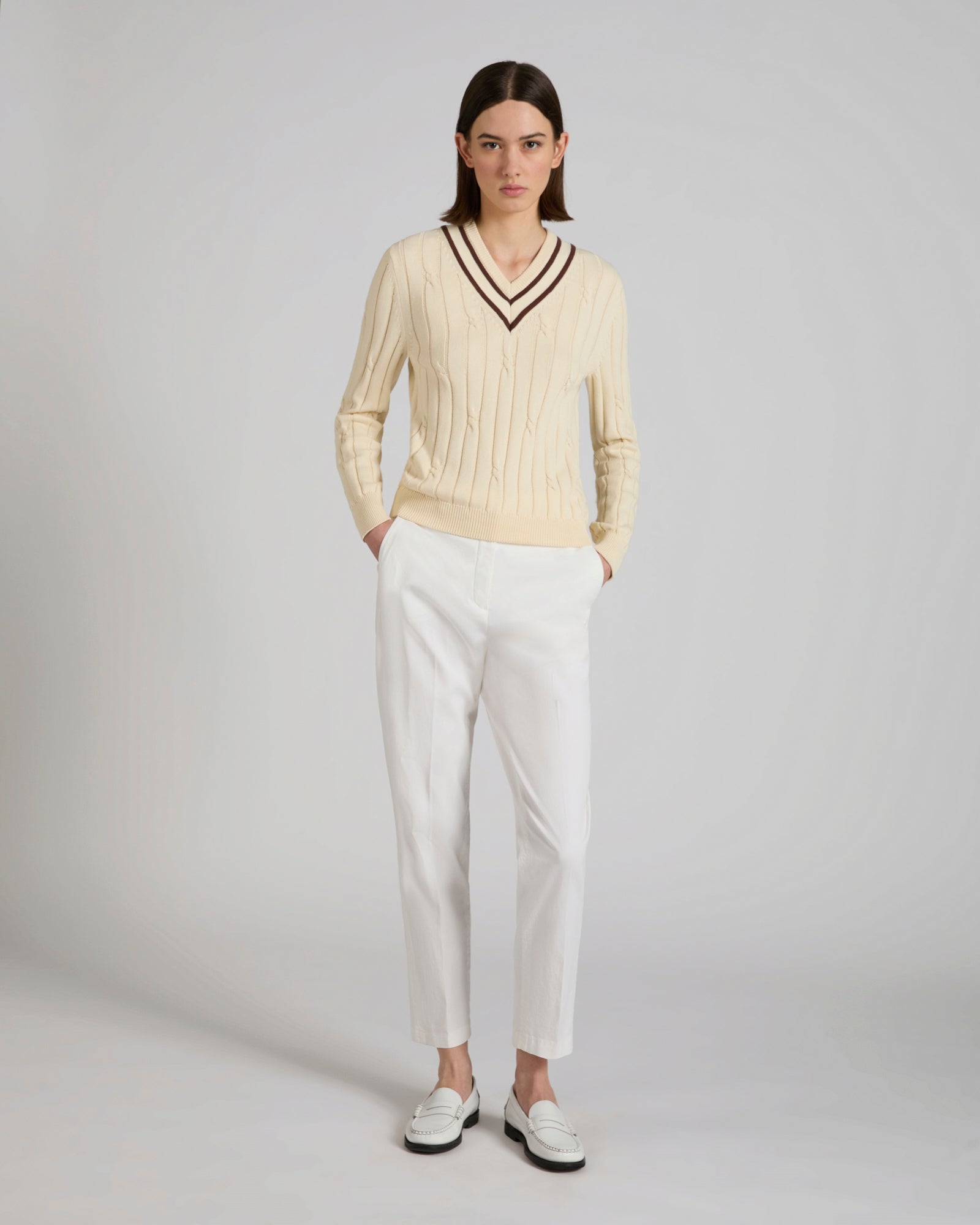 A stylistic nod to the sophistication of the most exclusive sports clubs, this piece of knitwear combines high-quality materials with extremely elegant taste. The fabric chosen is organic cotton produced through a certified process that guarantees the safety of people and the environment and minimises harmful chemicals in all stages of production. The asymmetric braided detailing adds texture and originality, likewise the contrasting collar detail.