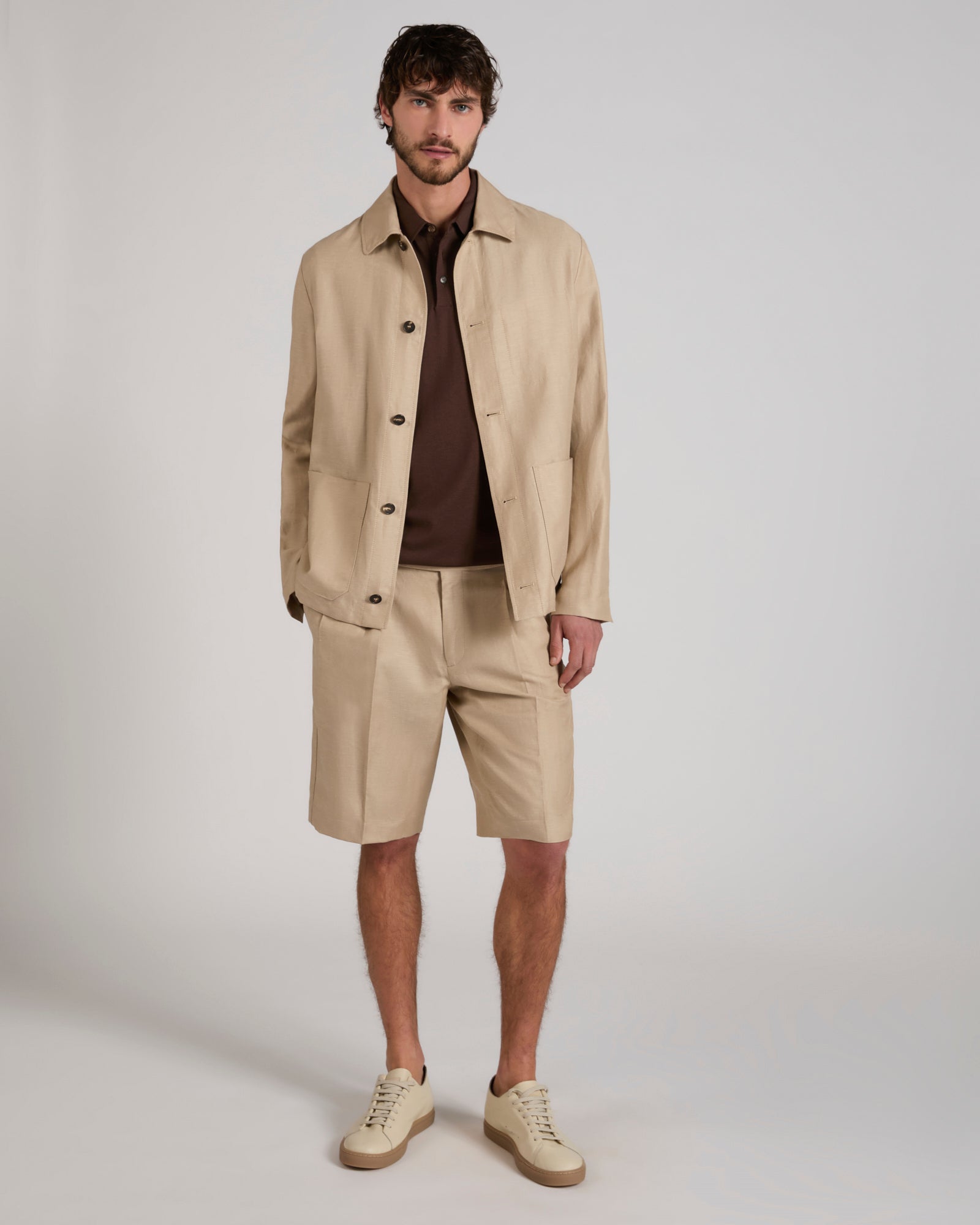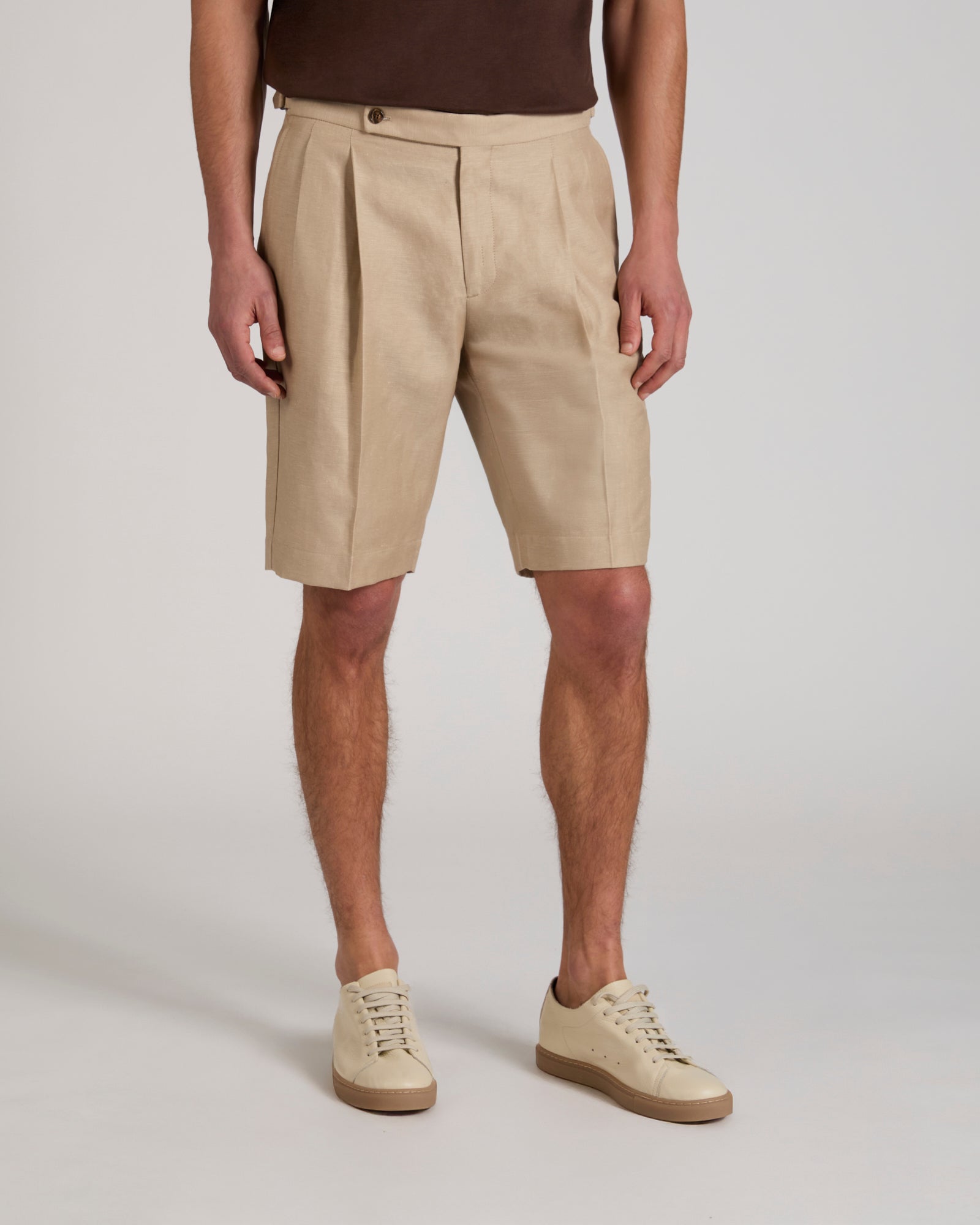 A garment with a resolutely sartorial soul, these Bermuda shorts stand out for their impeccable construction and details that enhance their sophistication: the double front pleat adds volume and definition to the silhouette, while the extended waistband adds a touch of contemporary refinement. A fine blend of wool and linen, the fabric is extremely light and airy, ideal for delivering comfort and freshness without compromising on elegance. The Bermuda shorts can be paired with the blouse of the same fabric, for informal occasions where individuality counts.