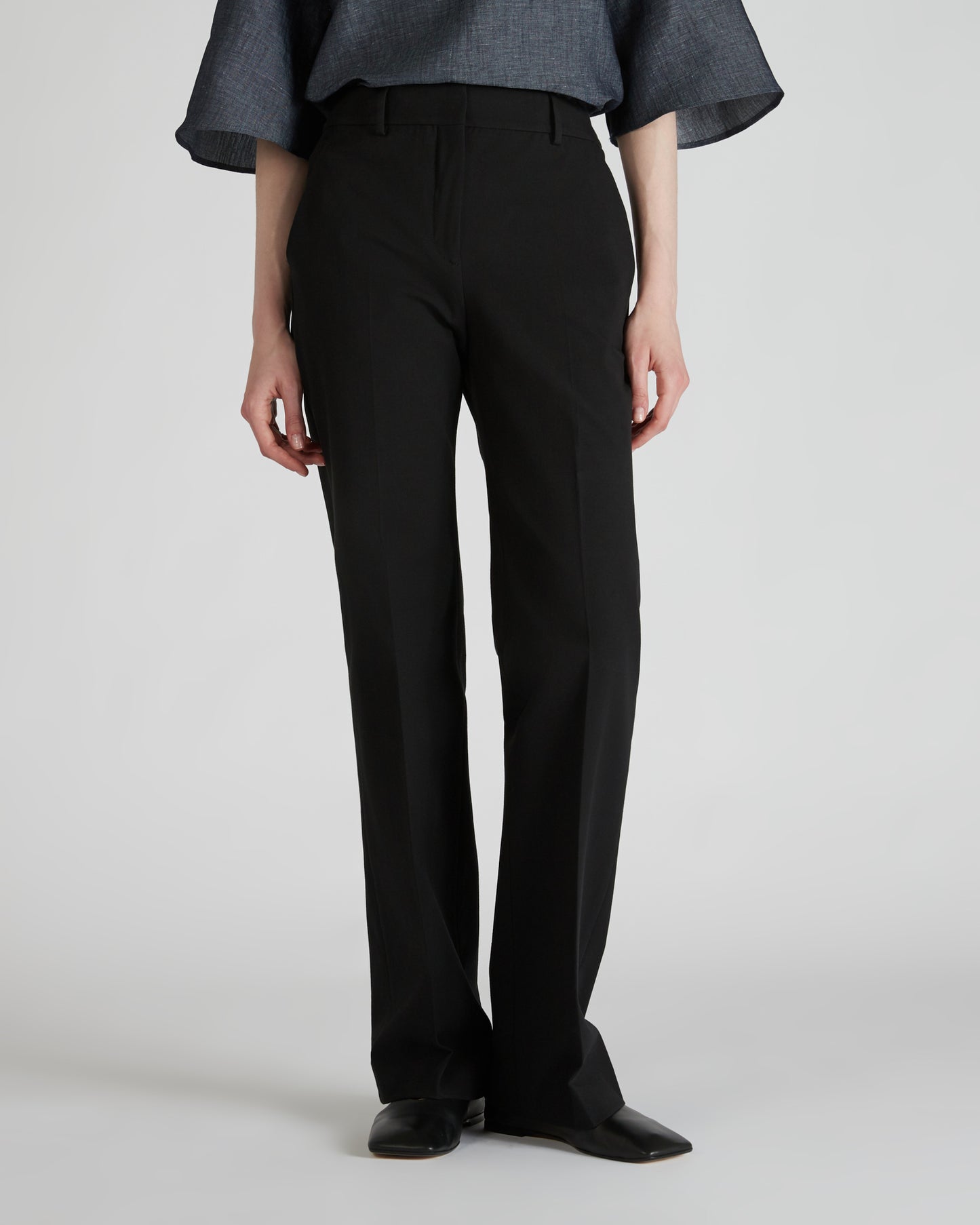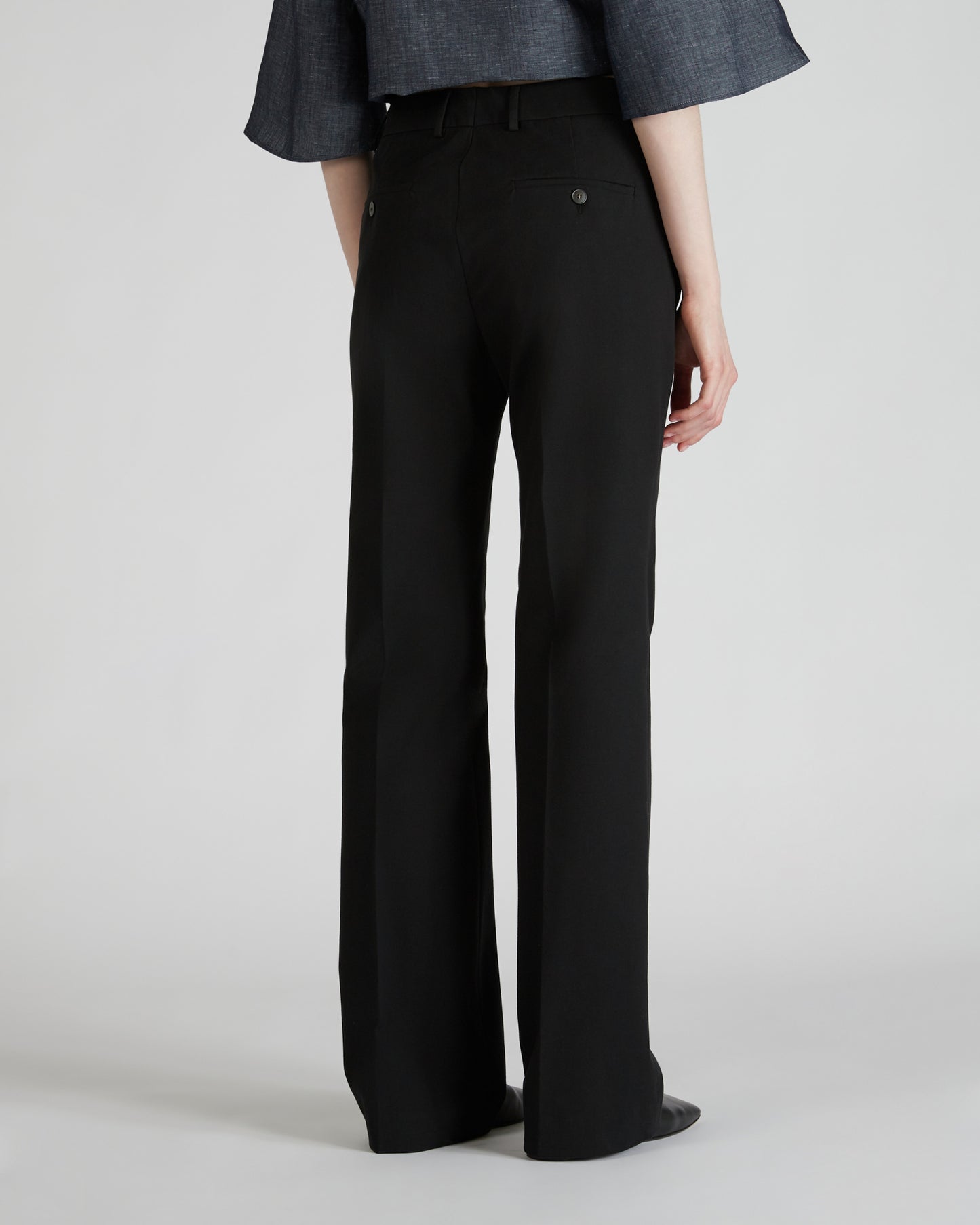 • The trousers have slash front pockets, single-welt back pockets and flared leg hems.