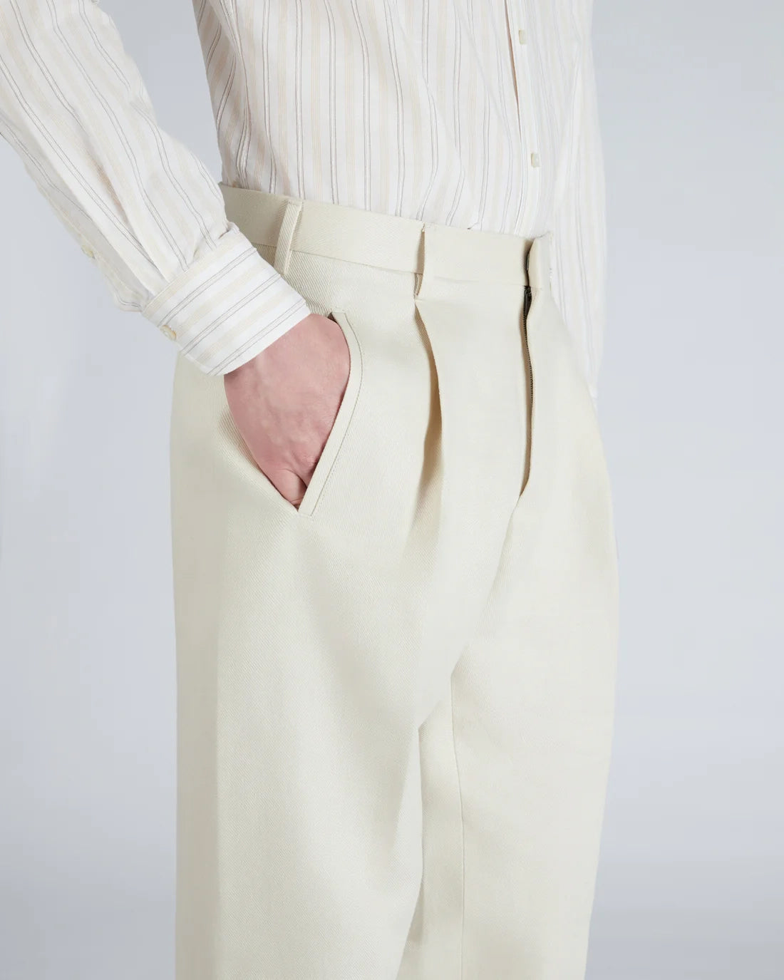 The ultimate expression of refined style and high tailoring, these trousers encapsulate the quintessence of the brand. The model is a sophisticated seamless one: without the seam on the outer leg, it presents a surface continuity that contributes to making the volumes extremely soft and contemporary. The fabric is a luxurious linen, chosen for its superior quality and enhanced with a finish that makes it particularly shiny and elegant. The trousers can be paired with the jacket made from the same fabric.