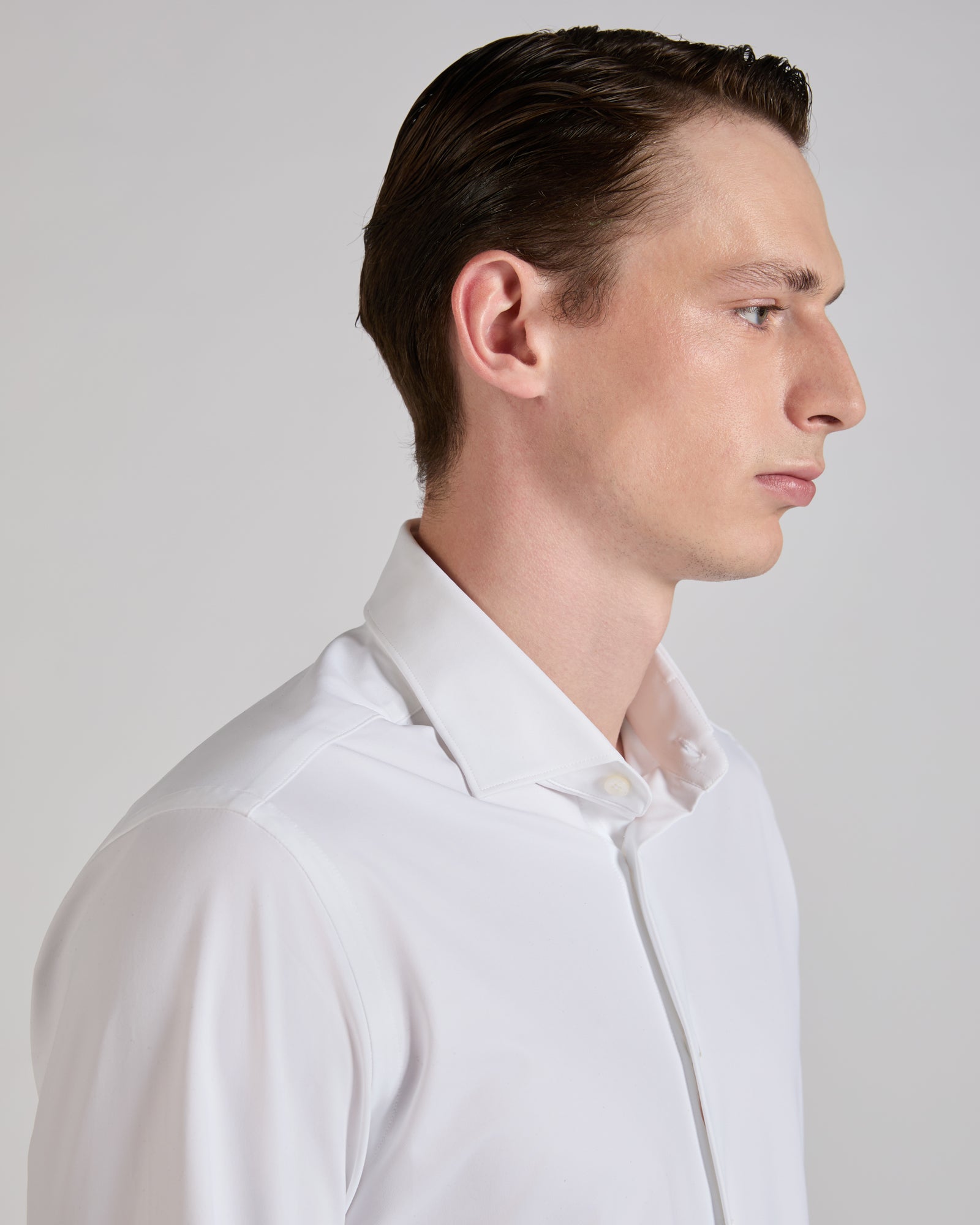 Wash & Wear and no-iron technology are this shirt's key features, combining a technical fabric inspired by the sportswear world with the aesthetic elegance of a tailored shirt. This material is crease-resistant and extremely elastic. You can wash it conveniently at home; it dries extremely quickly and does not require ironing. Moreover, it has been produced through a certified process that ensures worker safety and respect for the environment at all stages of production.