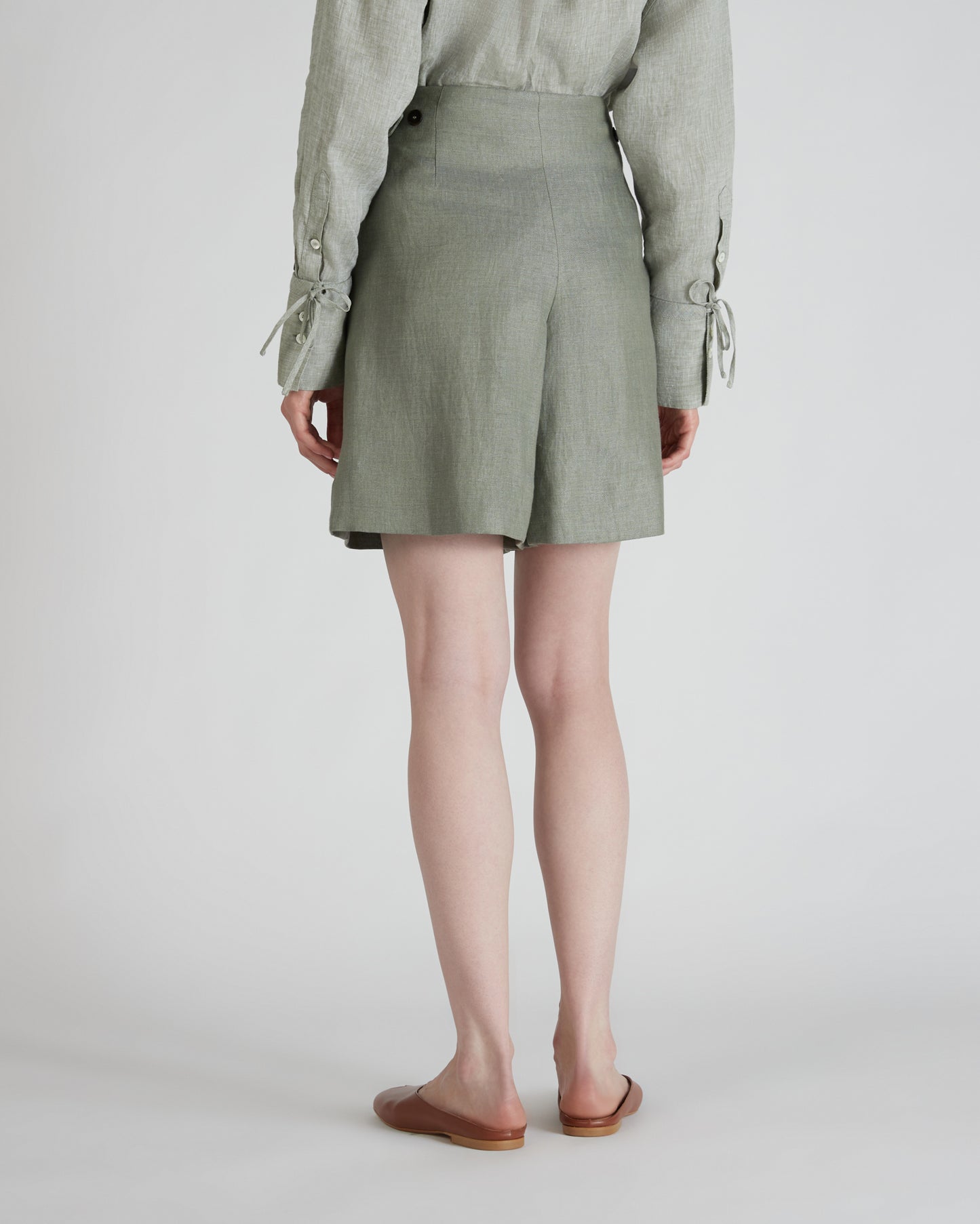 • The bermuda shorts feature single-pleat rear pockets, a high waist with side waistband, and a double welt pocket on the front