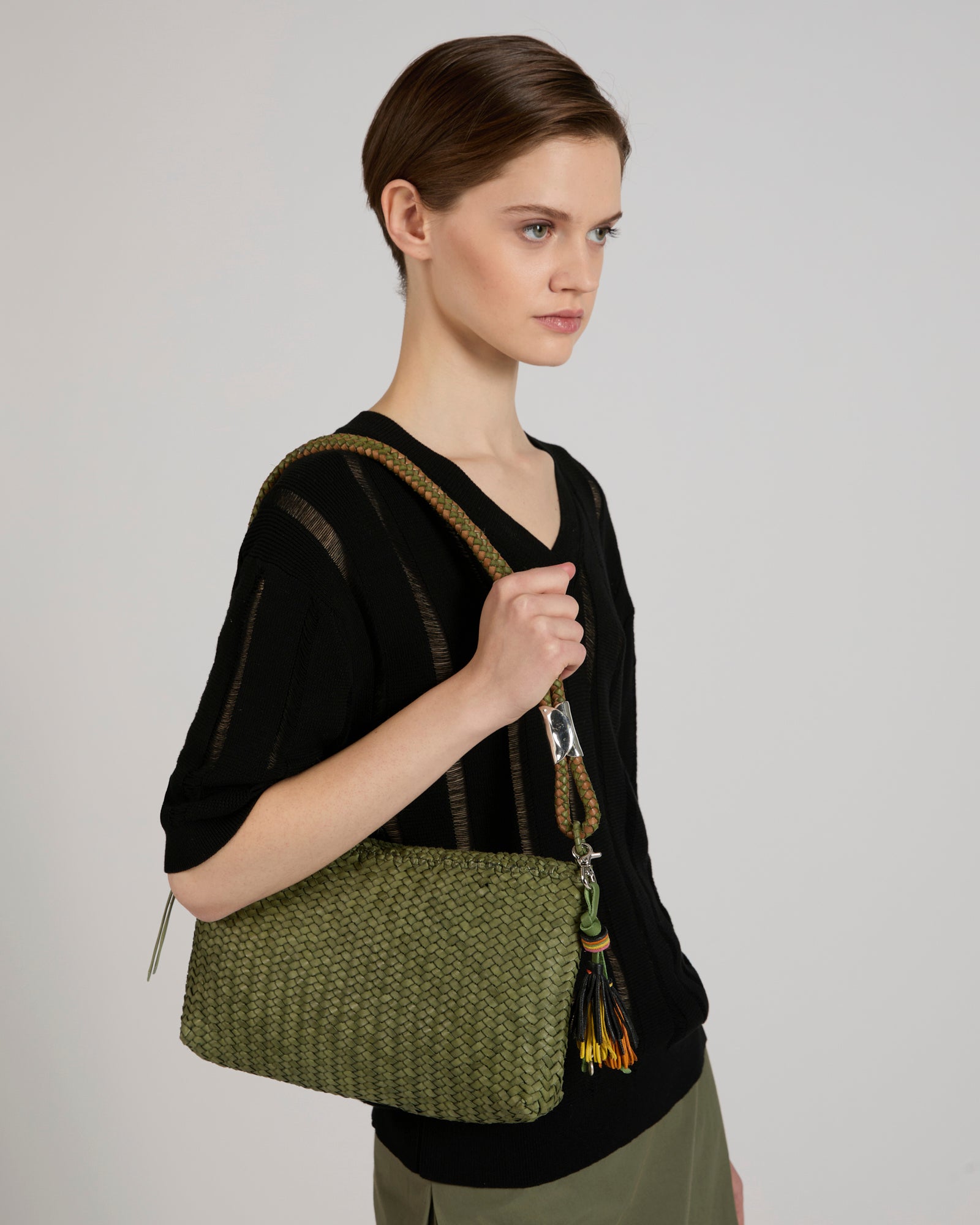 The originality of unique pieces, the quality of Italian craftsmanship. Products by Massimo Palomba embody the experience and tradition of ancient know-how. The Frida bag features a minimal and clean design. Its compact size and practical shoulder handle ensure comfort. Fully lined, it includes an internal pocket and a secure zip closure. The exquisite woven craftsmanship gives it a truly distinctive and original look.