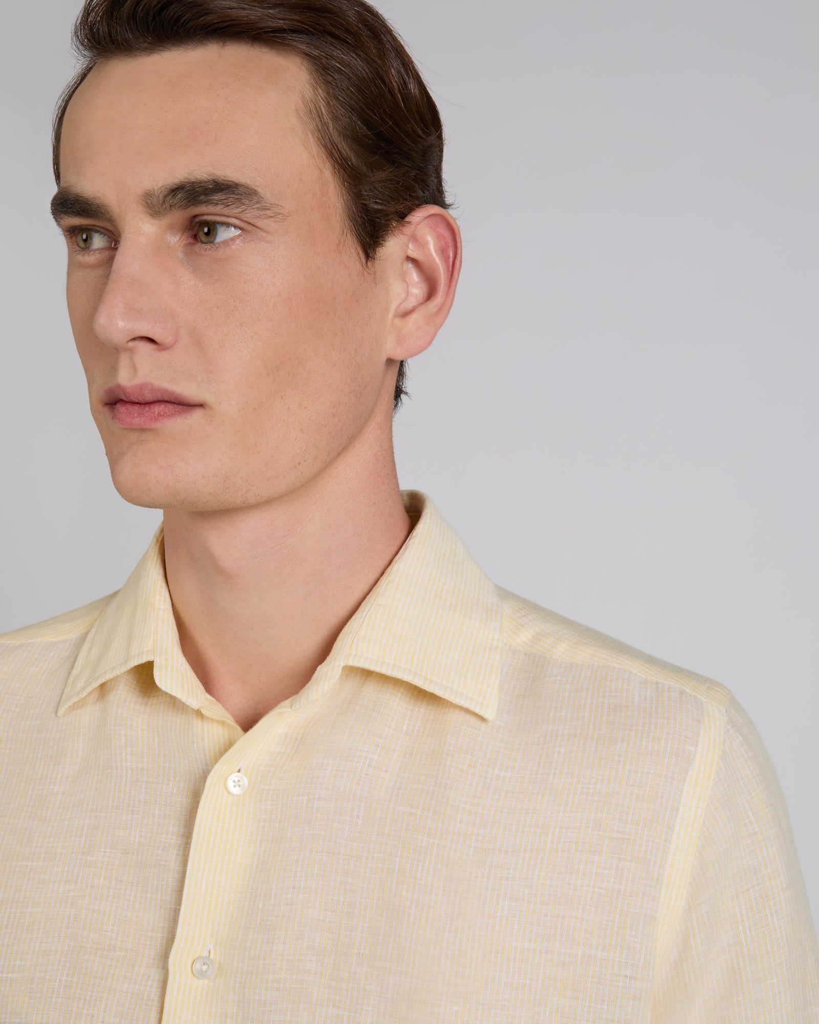 Linen is one of the world's oldest textile fibres. Centuries of innovation and research have ensured its role as one of today's premium shirt fabrics: lightweight yet durable, with a slightly iridescent appearance, it is very pleasant to wear throughout the day. Here it is used on a regular-fit shirt and proposed in refined shades, a perfect expression of summer lightness. Moreover, the fabric has been produced through a certified process that ensures worker safety and respect for the environment at all stages of production.