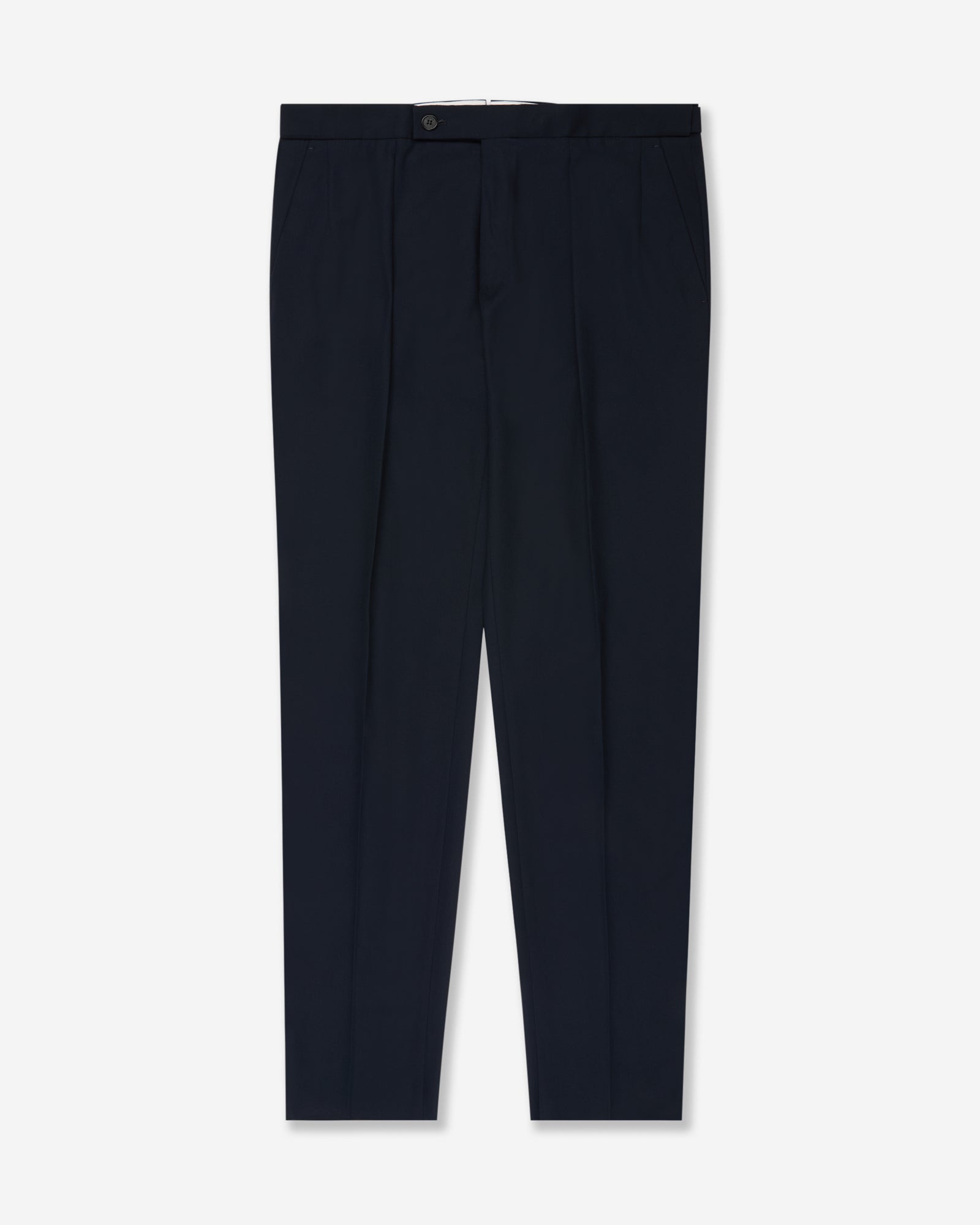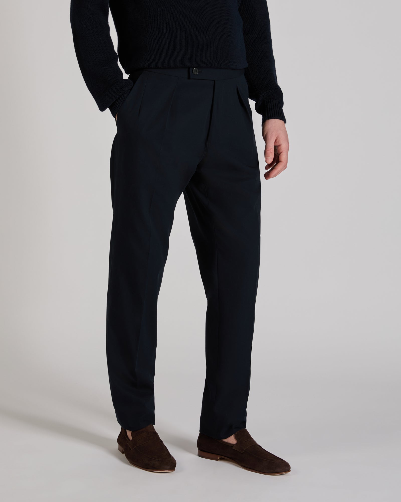 • The trousers feature a self-locking zip, square belt extension with internal hook, full belt on the back and adjuster on the sides, front slash pockets, back pockets with flap, and double front pleat.