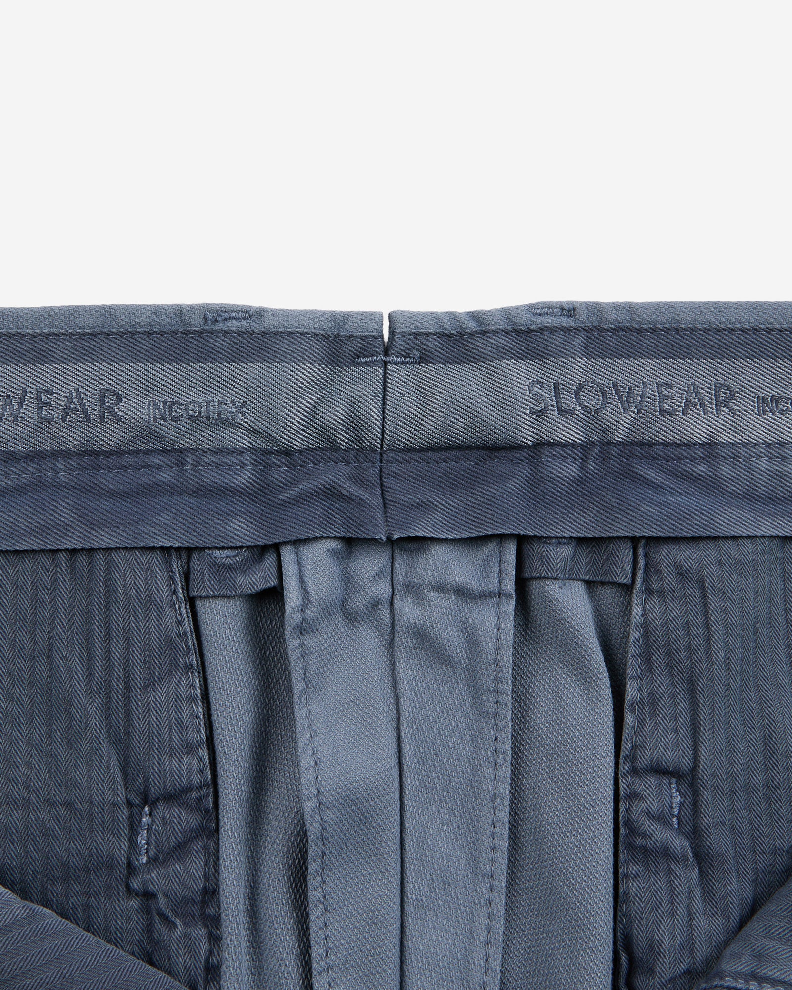 - The trousers feature a self-locking zip, front slash pockets, and double-welt back pockets with a flap that can be left in sight or inserted inside the pocket.