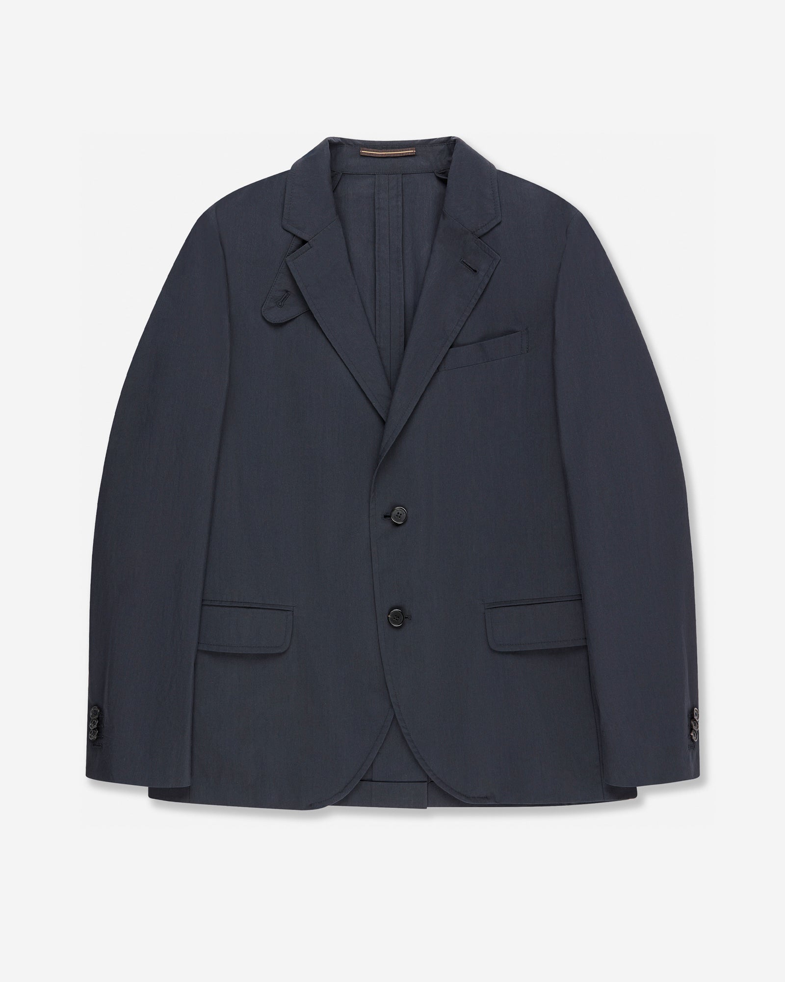 - The jacket is unlined with lined sleeves and has a single-breasted two-button closure, flap pockets, a small chest pocket, an inside pocket inserted in the placket and a small pocket, and a back vent.