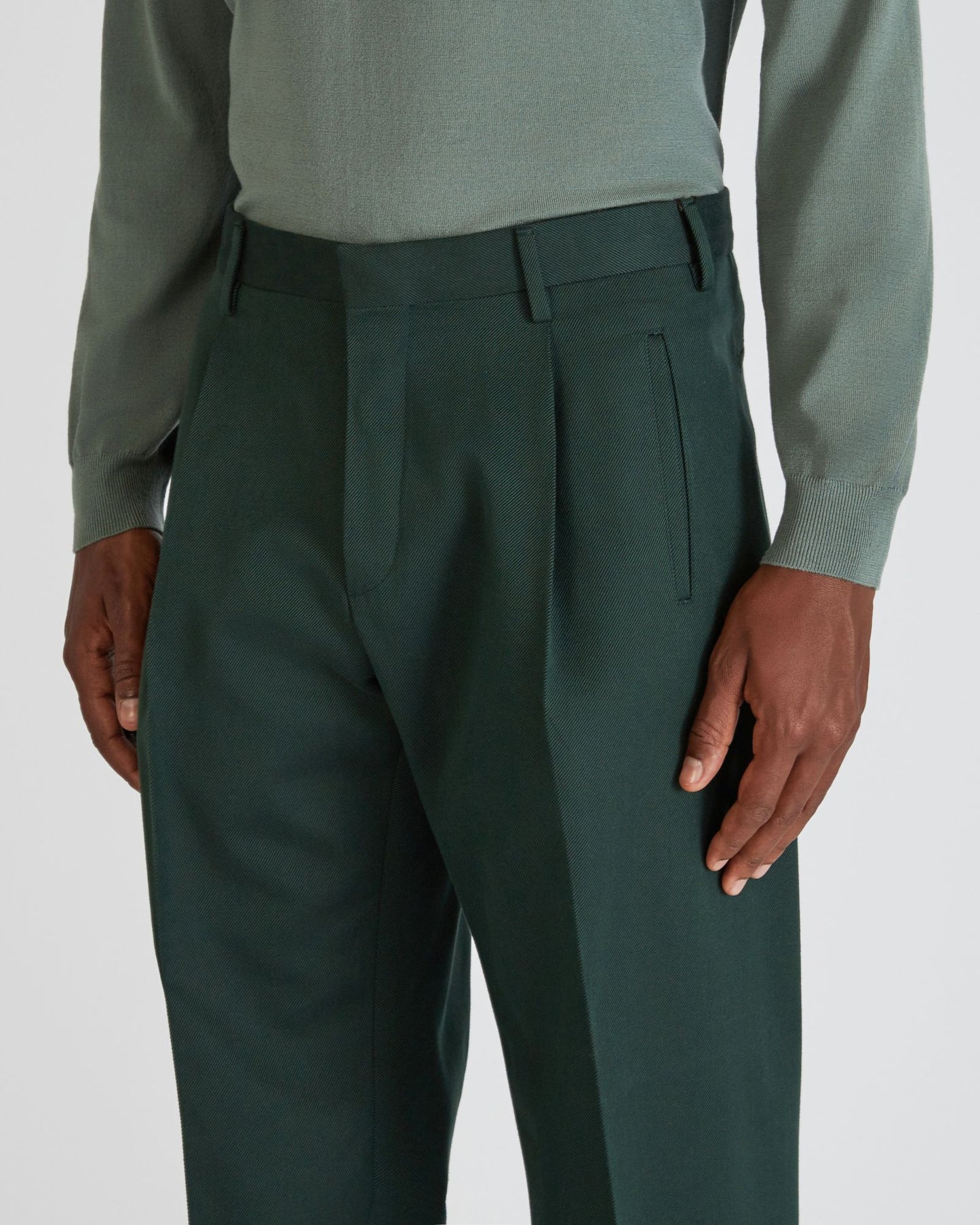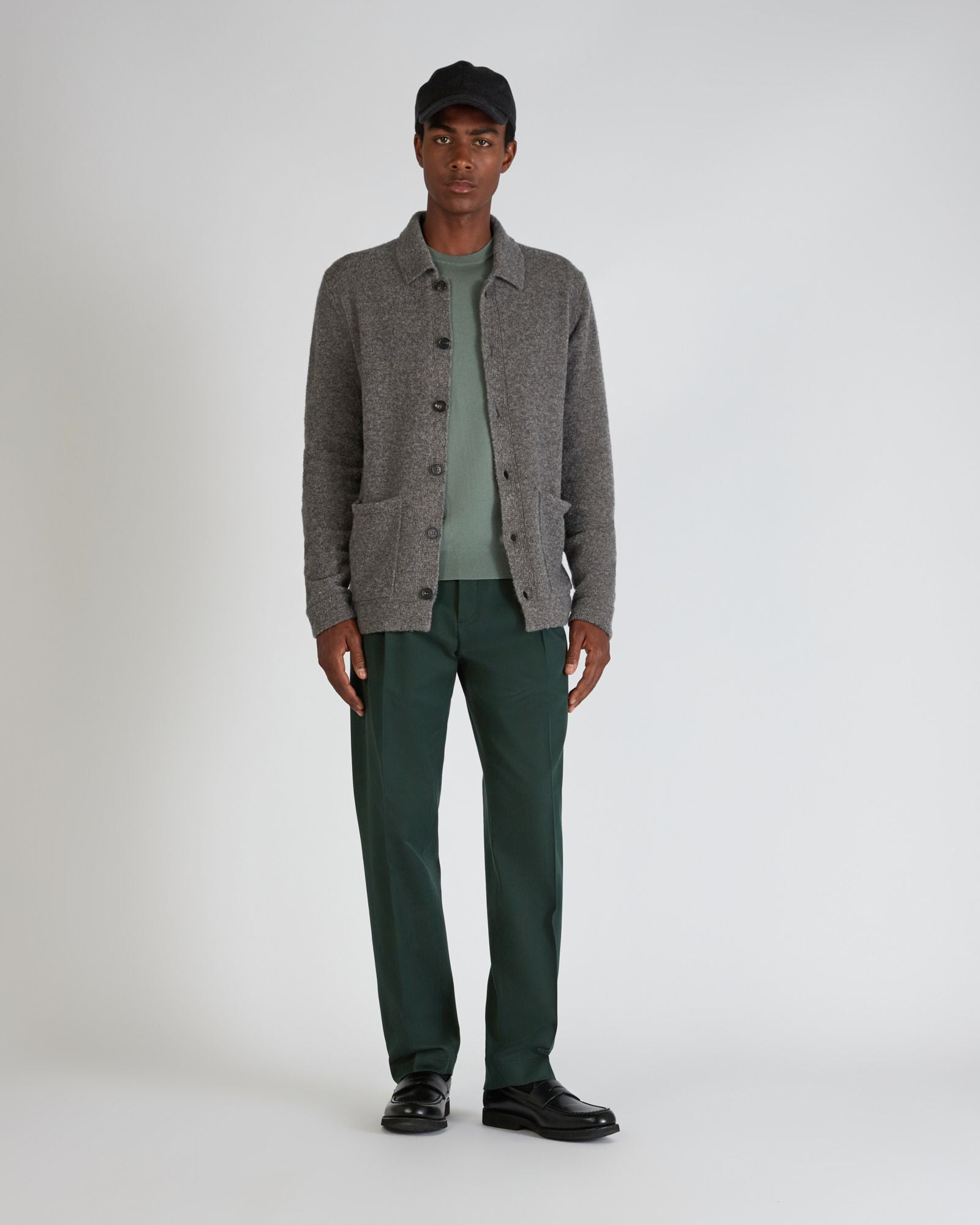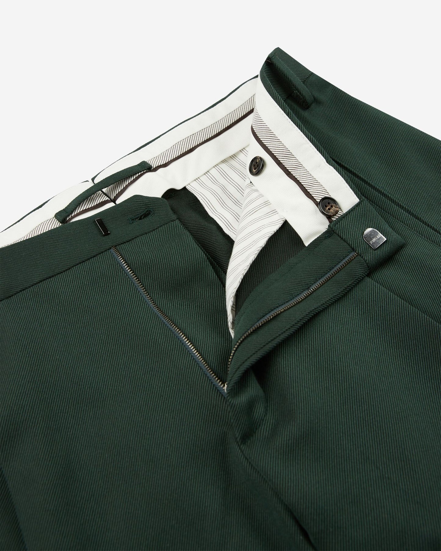 The ultimate expression of refined style and high tailoring, these trousers encapsulate the quintessence of the brand. The model is a sophisticated seamless one: without the seam on the outer leg, it presents a surface continuity that contributes to making the volumes extremely soft and contemporary. The chosen fabric is a precious blend of wool and yarn-dyed cotton, ensuring durability as well as protection and comfort.