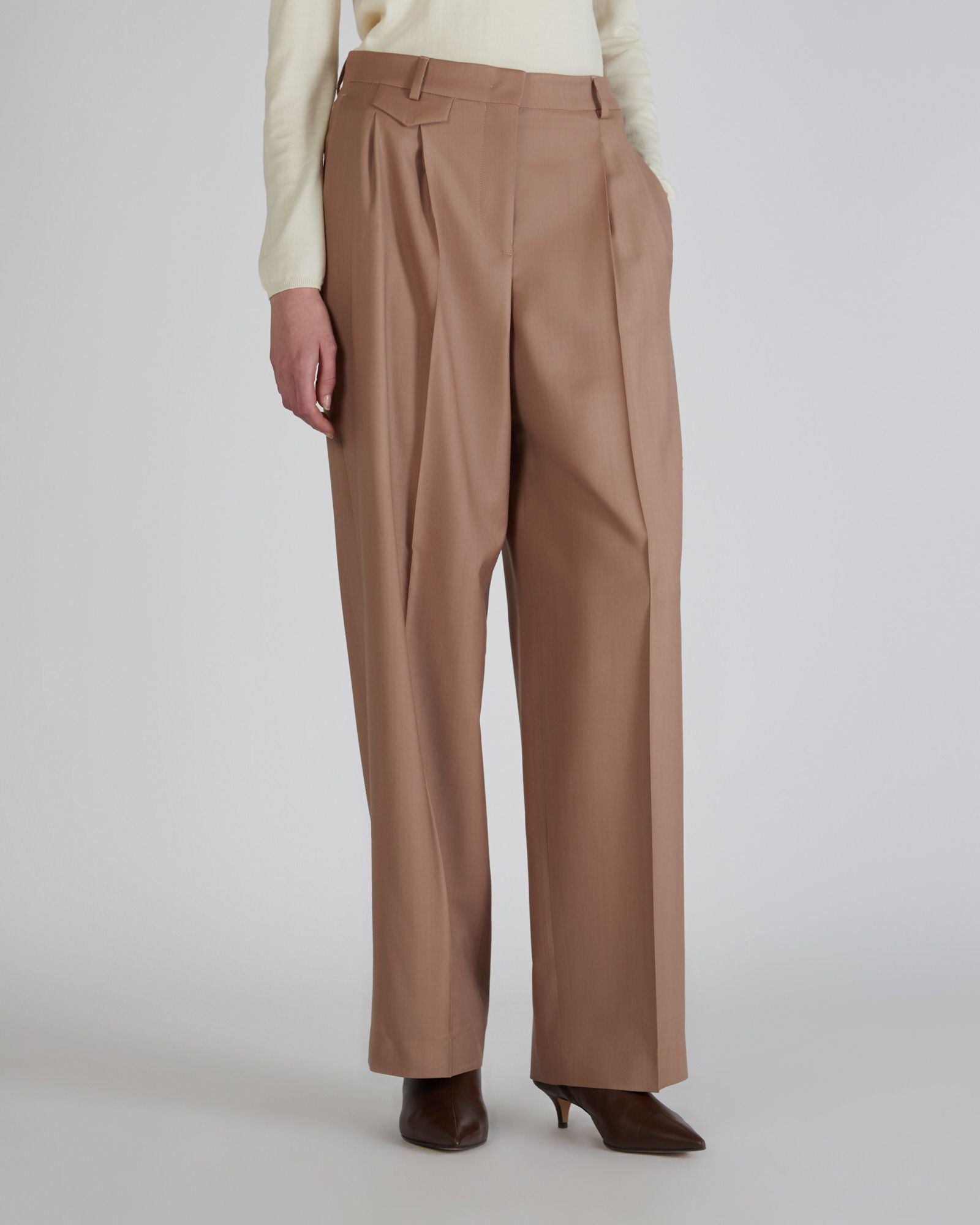 - The trousers have a double front pleat, slash pockets and a small front flap pocket, single-welt back pockets with button.