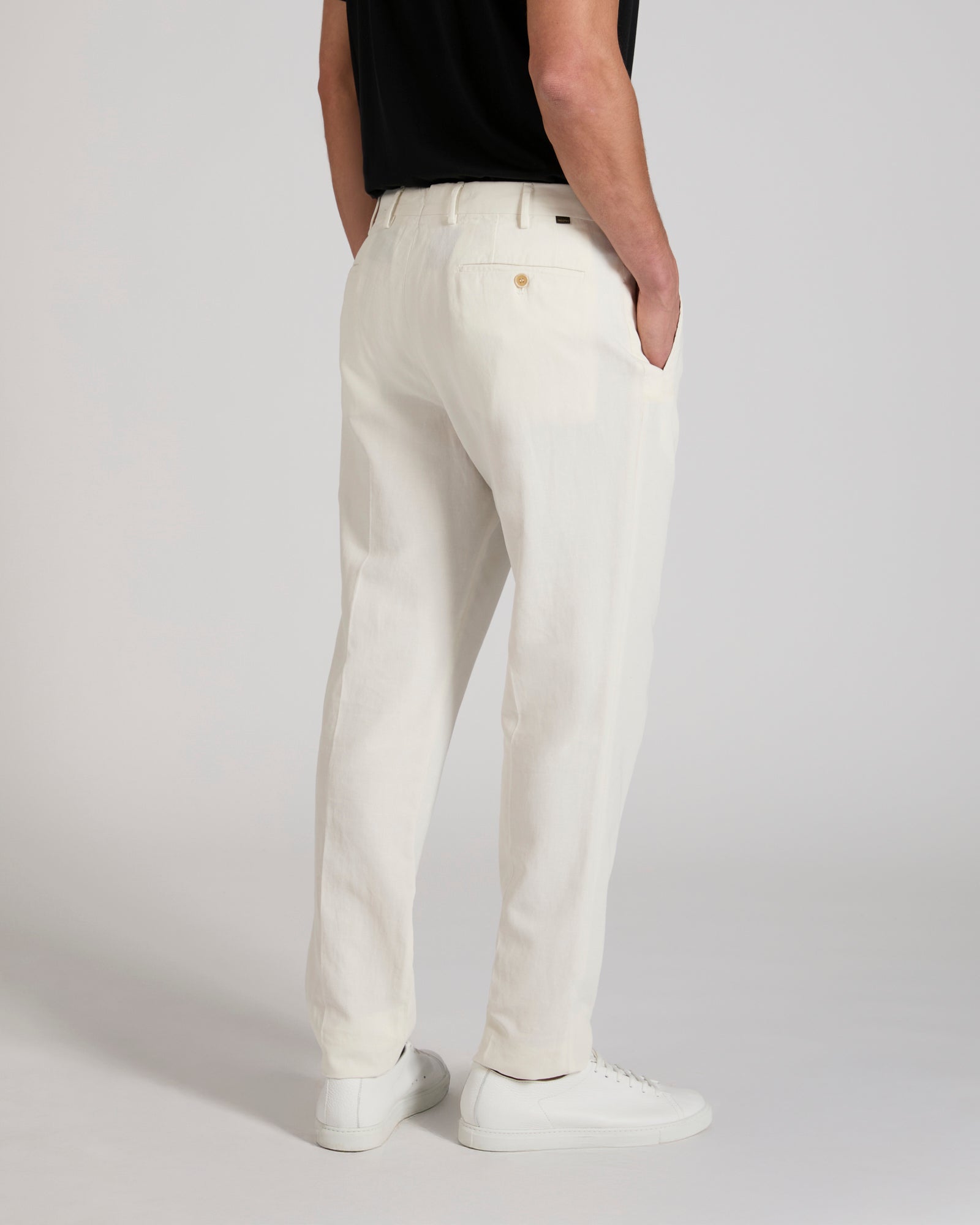The 541 model is a long-standing model in the brand's range, an example of sartorial mastery and timeless style. Its distinctive feature is undoubtedly the ample volumes of the waist, given by the tapered fit combined with the front pleat. Here it is proposed in an ice crêpe cotton, which is by nature characterised by a crinkled and at the same time light and summery feel. Moreover, the fabric is produced through a certified process that ensures worker safety, respect for the environment and minimal use of harmful chemicals at all stages of production.
