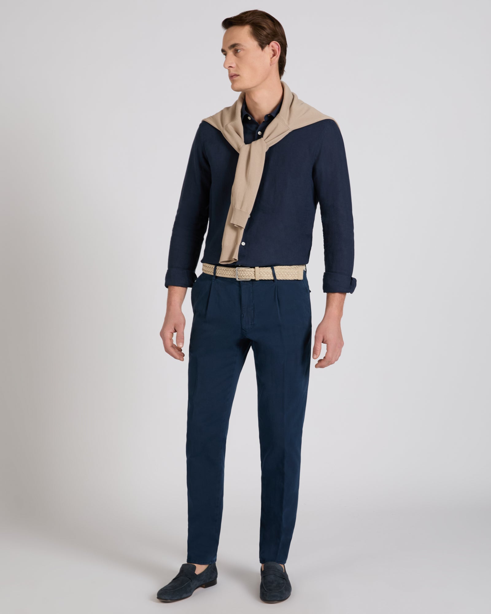 A summer wardrobe essential, designed to combine lightness, comfort and impeccable style. These tapered-fit trousers are crafted from an exquisite blend of cotton and linen, offering breathability, freshness, and a pleasantly soft feel against the skin. The tapered silhouette flatters the leg line without sacrificing comfort, making it an extremely versatile style. Moreover, the organic fabric is produced through a certified process that ensures worker safety, respect for the environment and minimal use of harmful chemicals at all stages of production.