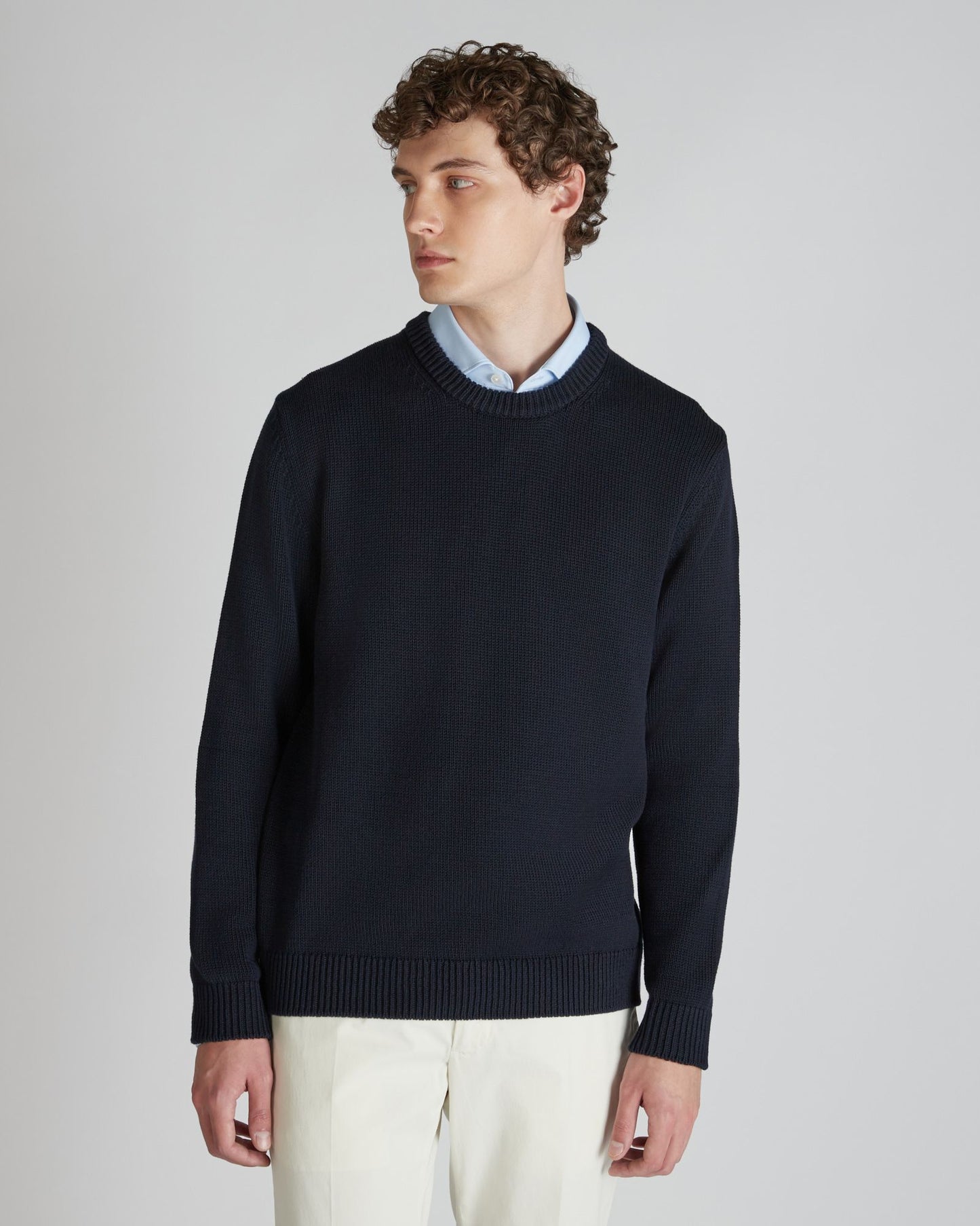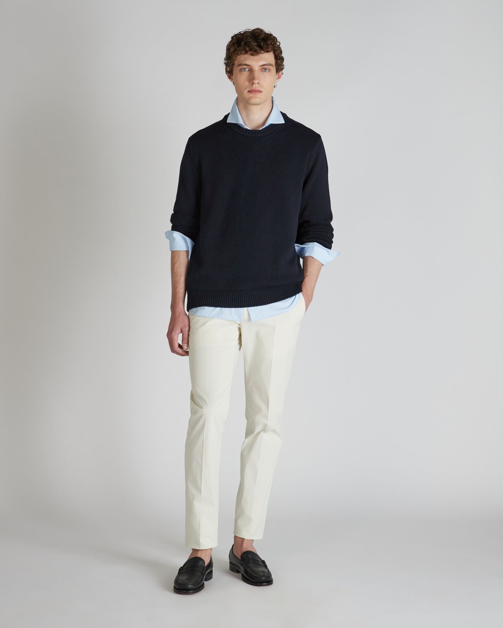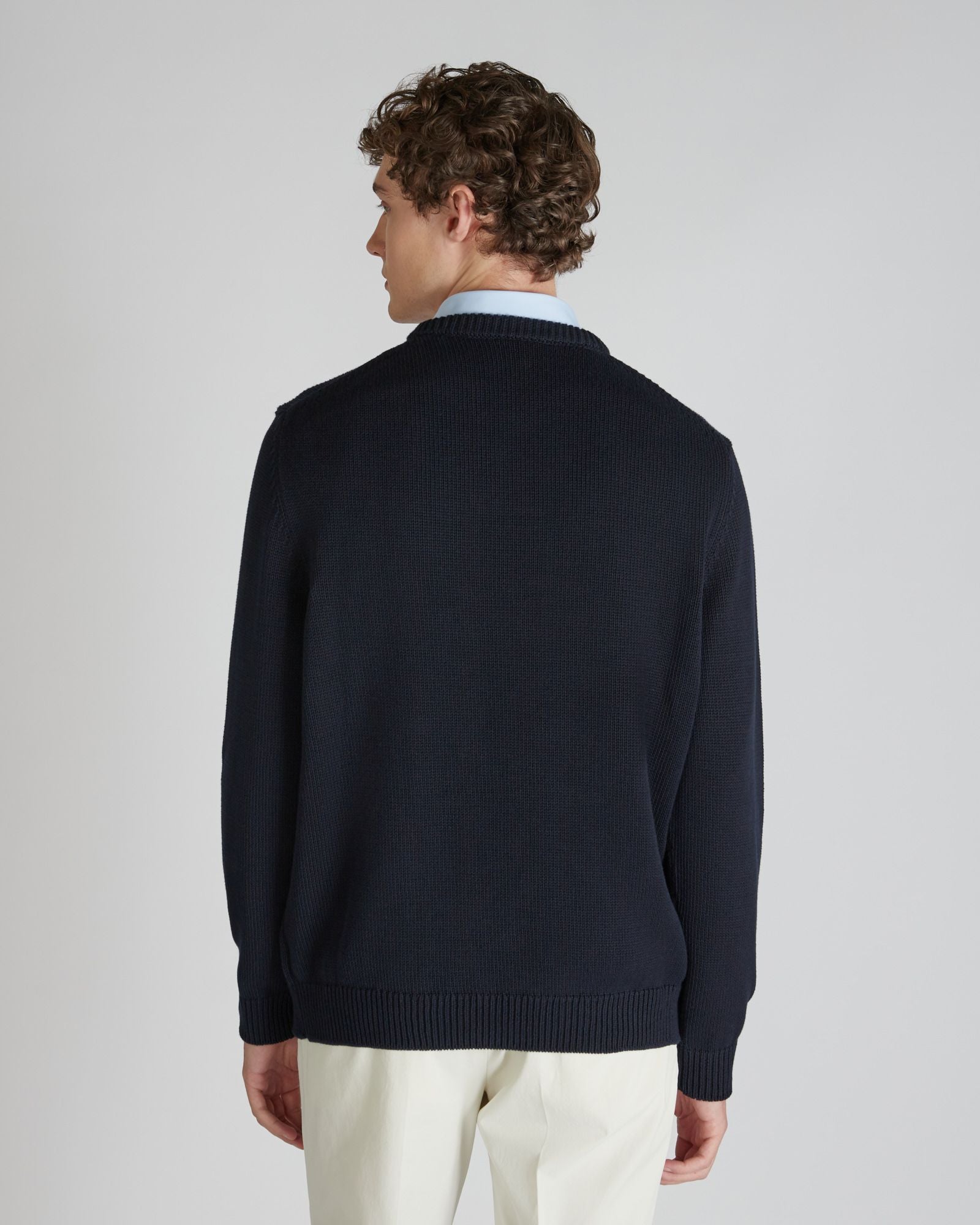An extremely versatile garment for the season, this sweater combines the minimal lines of the slim-fit crew neck with the natural characteristics of cotton. The quality is all to be found in the quality of the chosen fibre: an organic cotton, produced through a certified process that guarantees the safety of people and the environment and the minimisation of harmful chemicals at all stages of production.