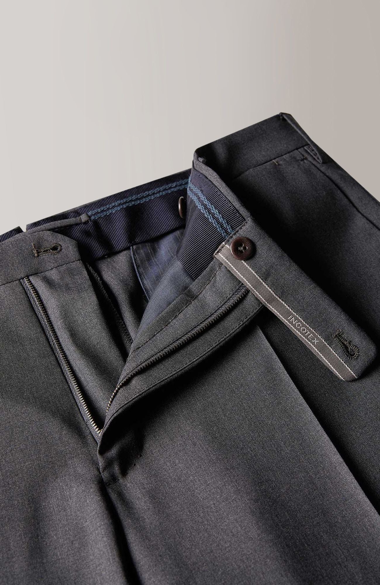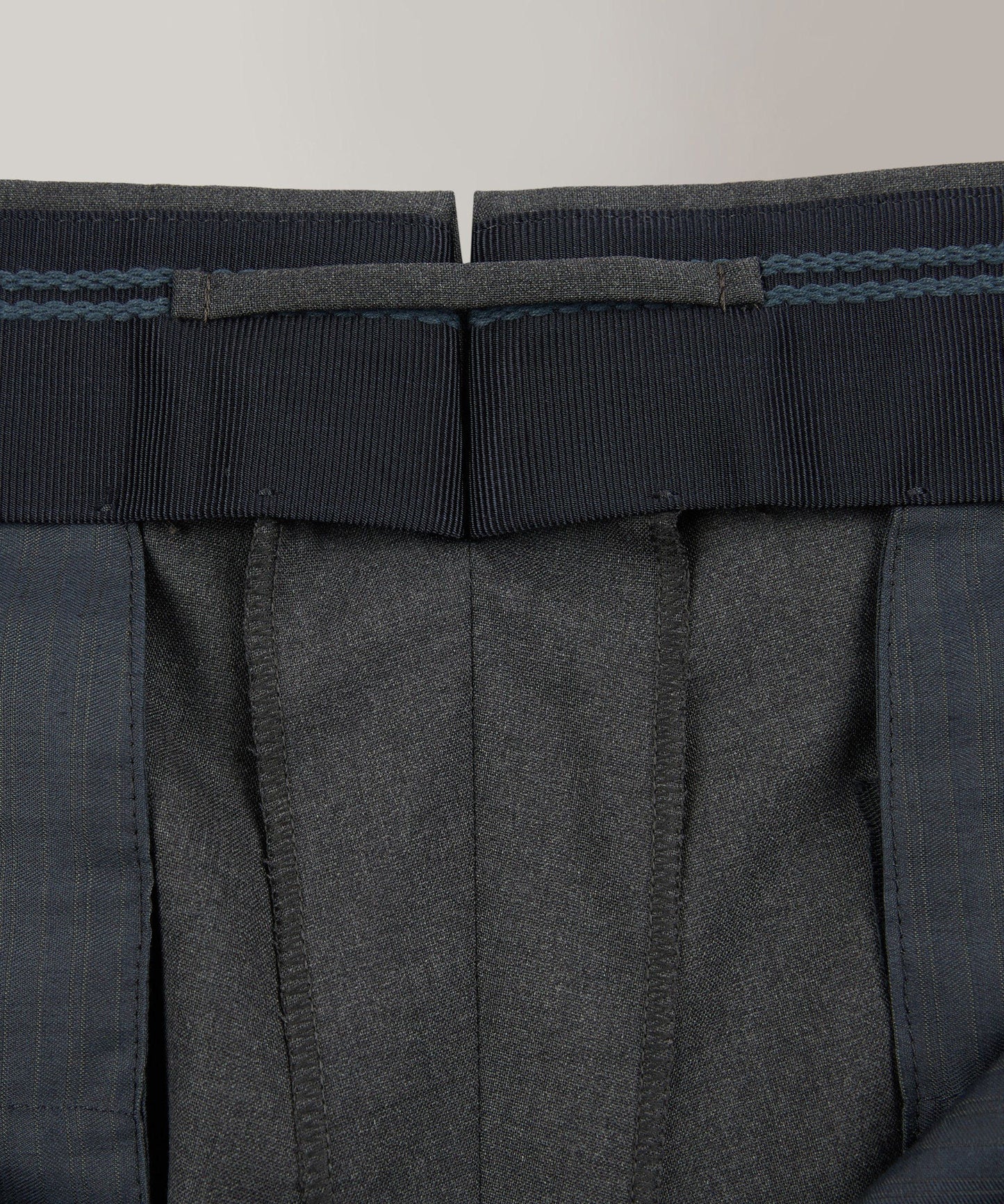 • The trousers have front American-style pockets with coin pockets on the front left and buttonless double-welt back pockets.