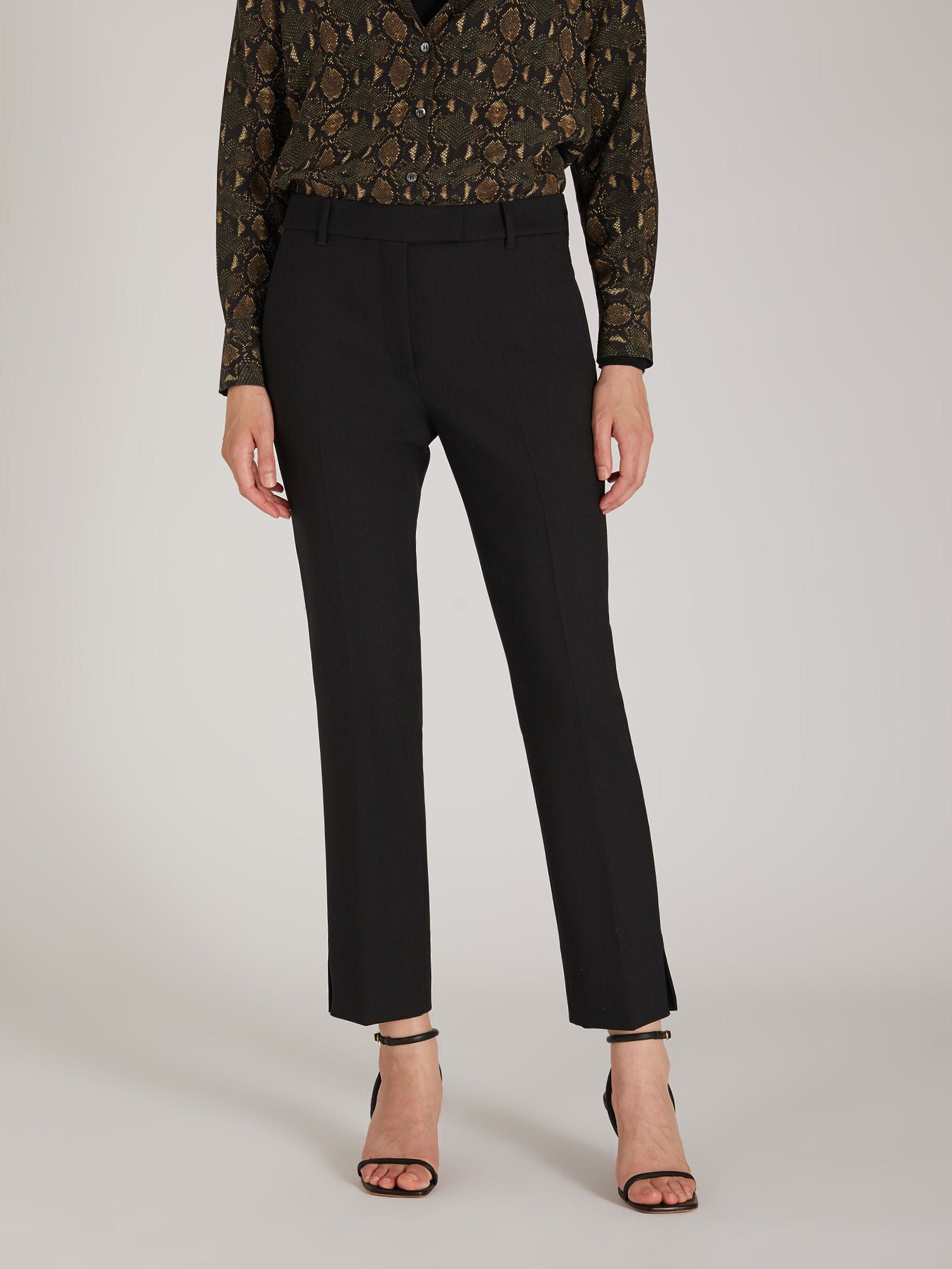 • The trousers have slash front pockets, single-welt rear pockets, an extendable belt, a hem with a side split, and tailored stitching at the hem and pockets. The model is 1.80m tall and wears a size 42