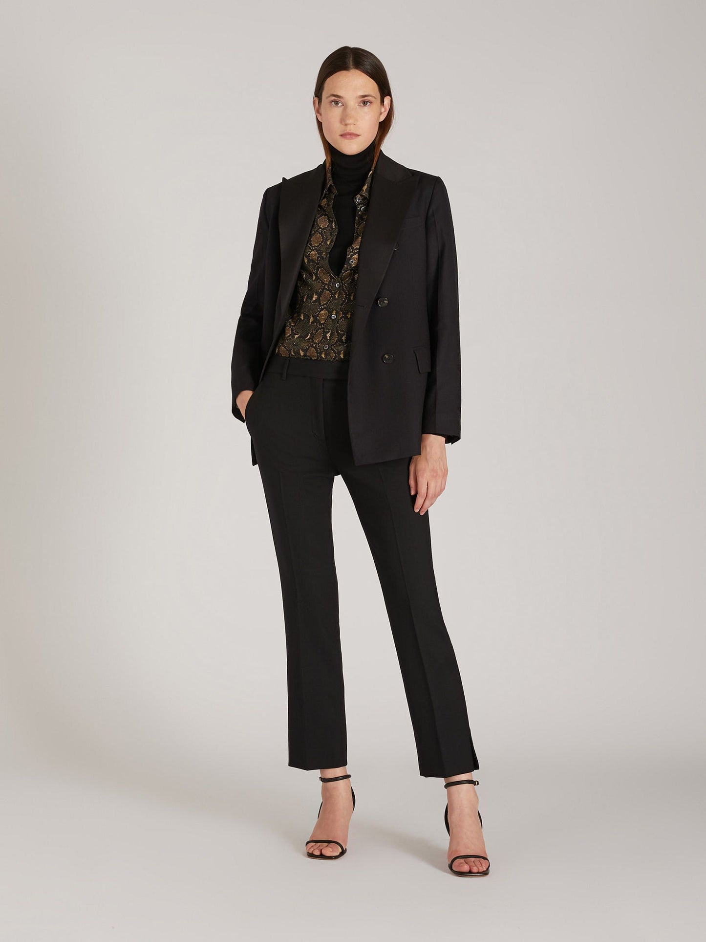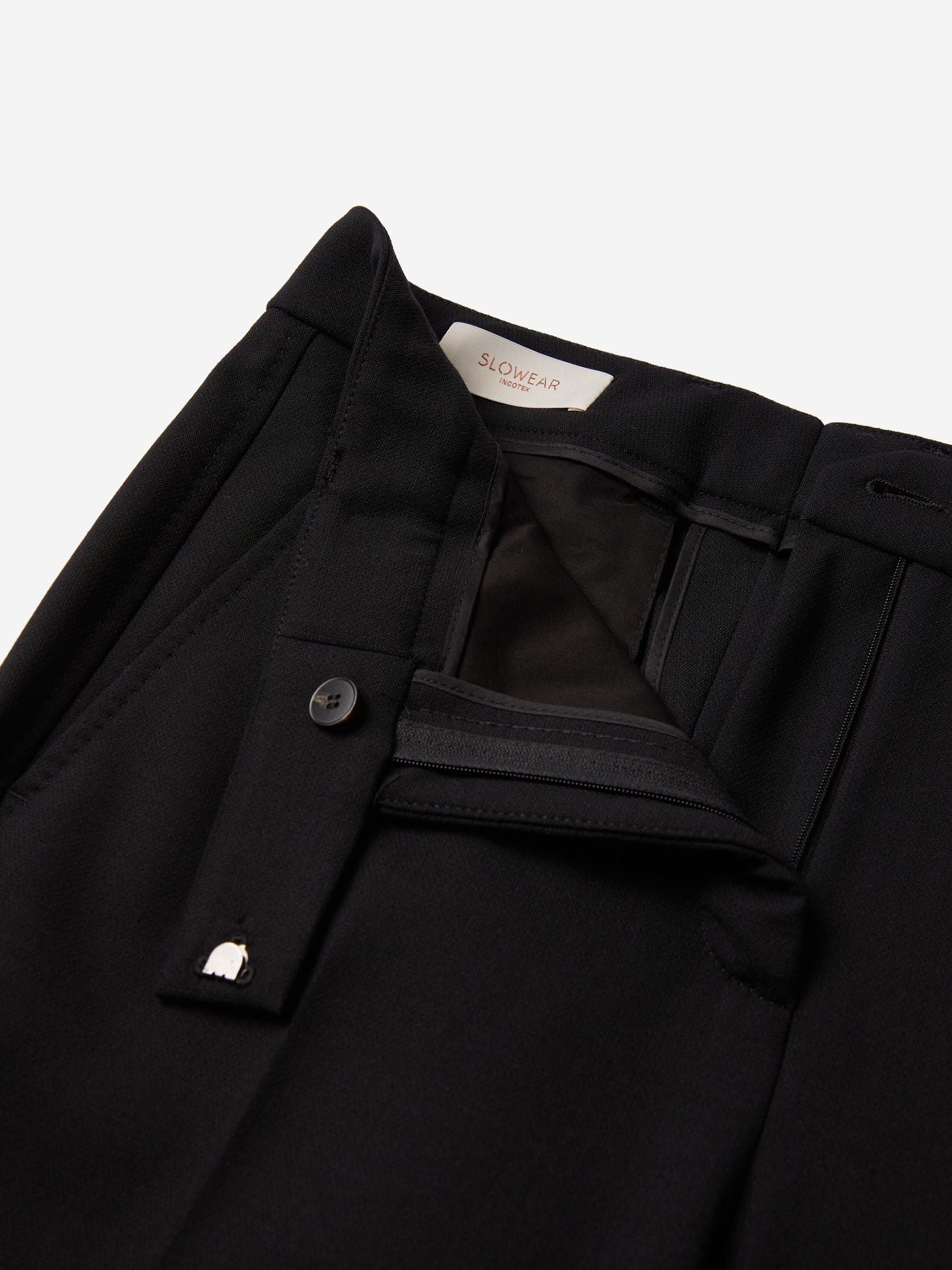 Two-way stretch wool is a fabric that combines the natural and much-loved characteristics of wool, above all its softness and warmth, with the comfort of the stretch component. The wool used for this trousers, with its clean and minimal lines, has also been produced through a certified process that guarantees the safety of people and the environment at all stages of production. The trousers can be combined with the blazer in the same fabric.