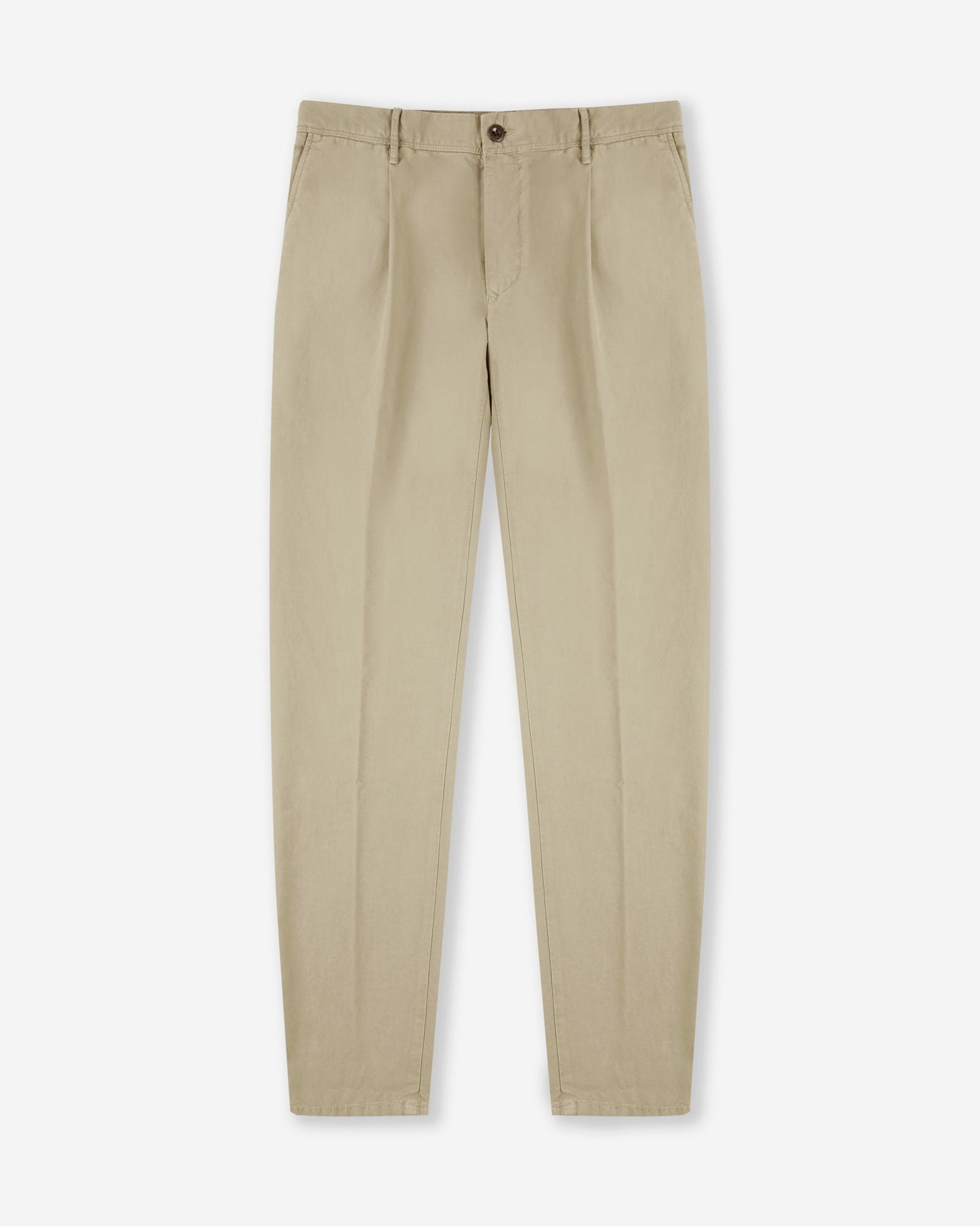 The trousers have front slash pockets, front pleats and back flap buttoned pockets. The trousers are delivered hemmed. The model is 1.80 m tall and is wearing a size 34.