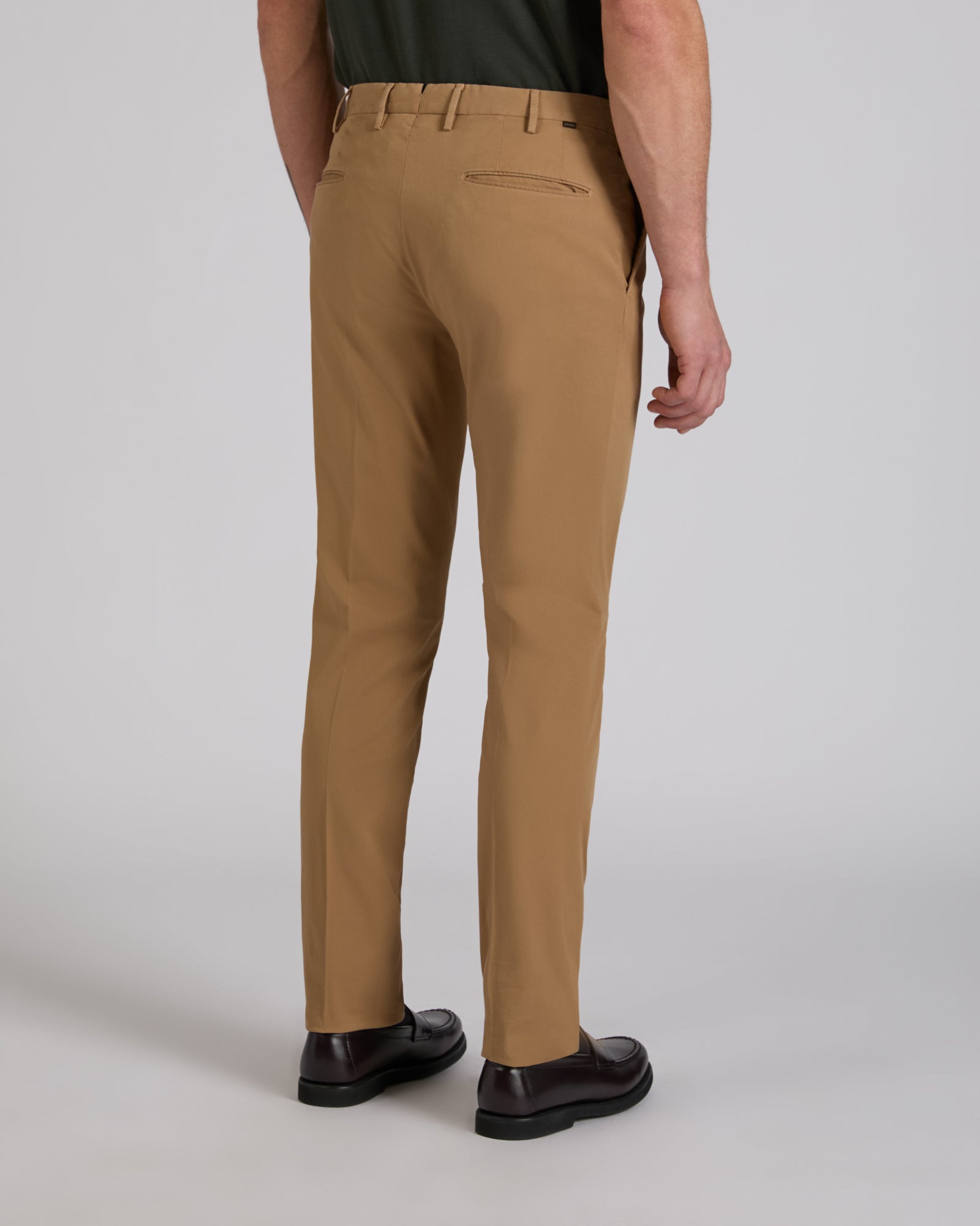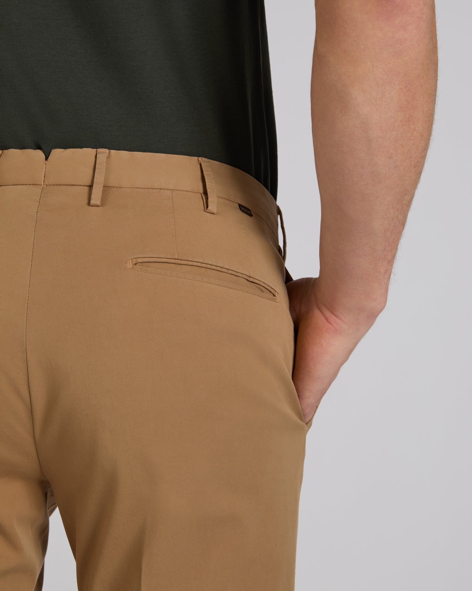 - The trousers feature a self-locking zip, belt extension with hidden button and second internal button, front slash pockets, coin pocket on the belt, and double-welt back pockets.