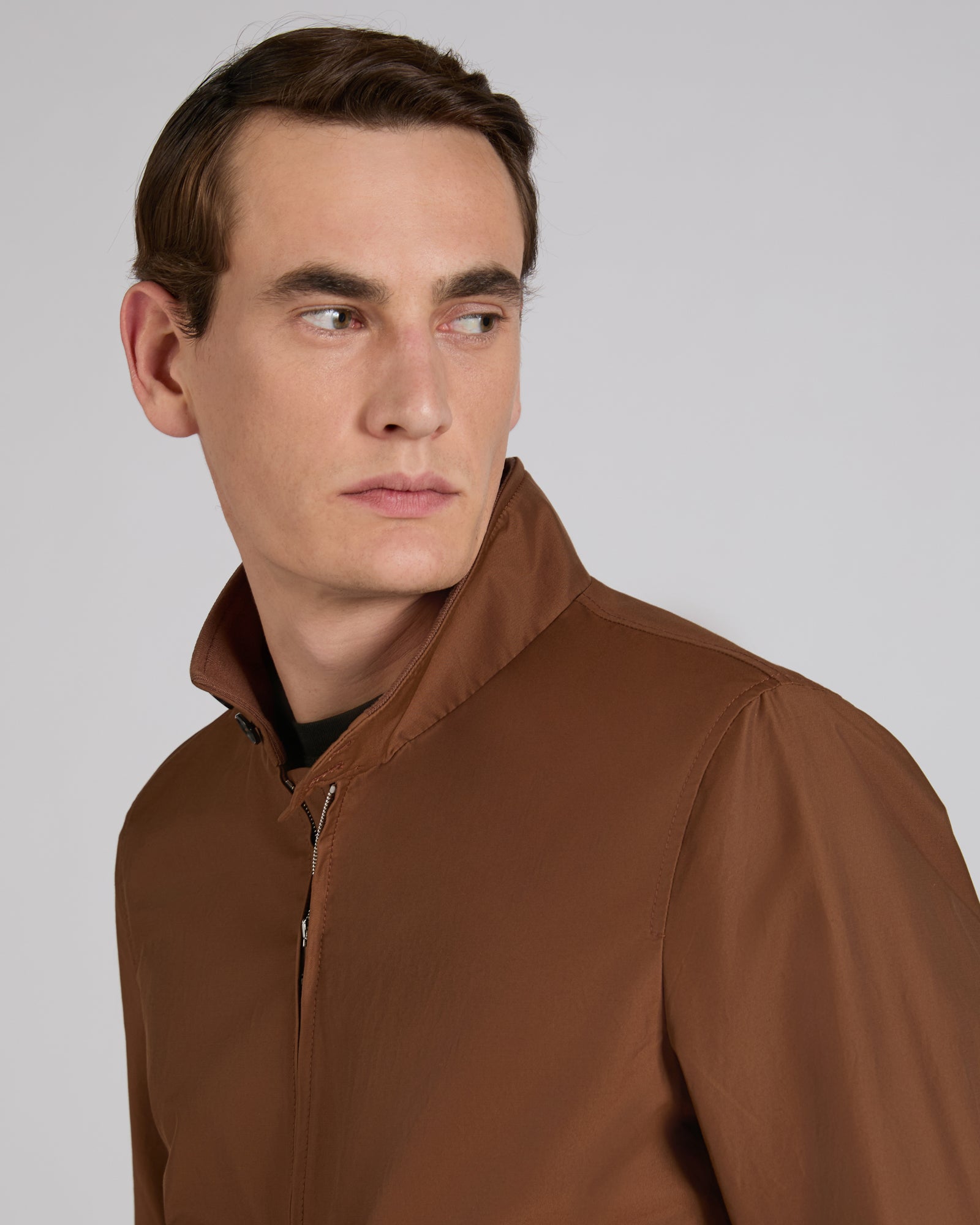 A blouson with a sartorial spirit yet an authentically casual character, designed to accompany the transitional seasons with style. Its essential and refined construction is combined with a functional attitude, making it a versatile garment perfect for everyday wear. The fabric is a fine blend of cotton and nylon, further enhanced by a water-repellent polyurethane coating that provides light protection against the elements while preserving a pleasant feel.