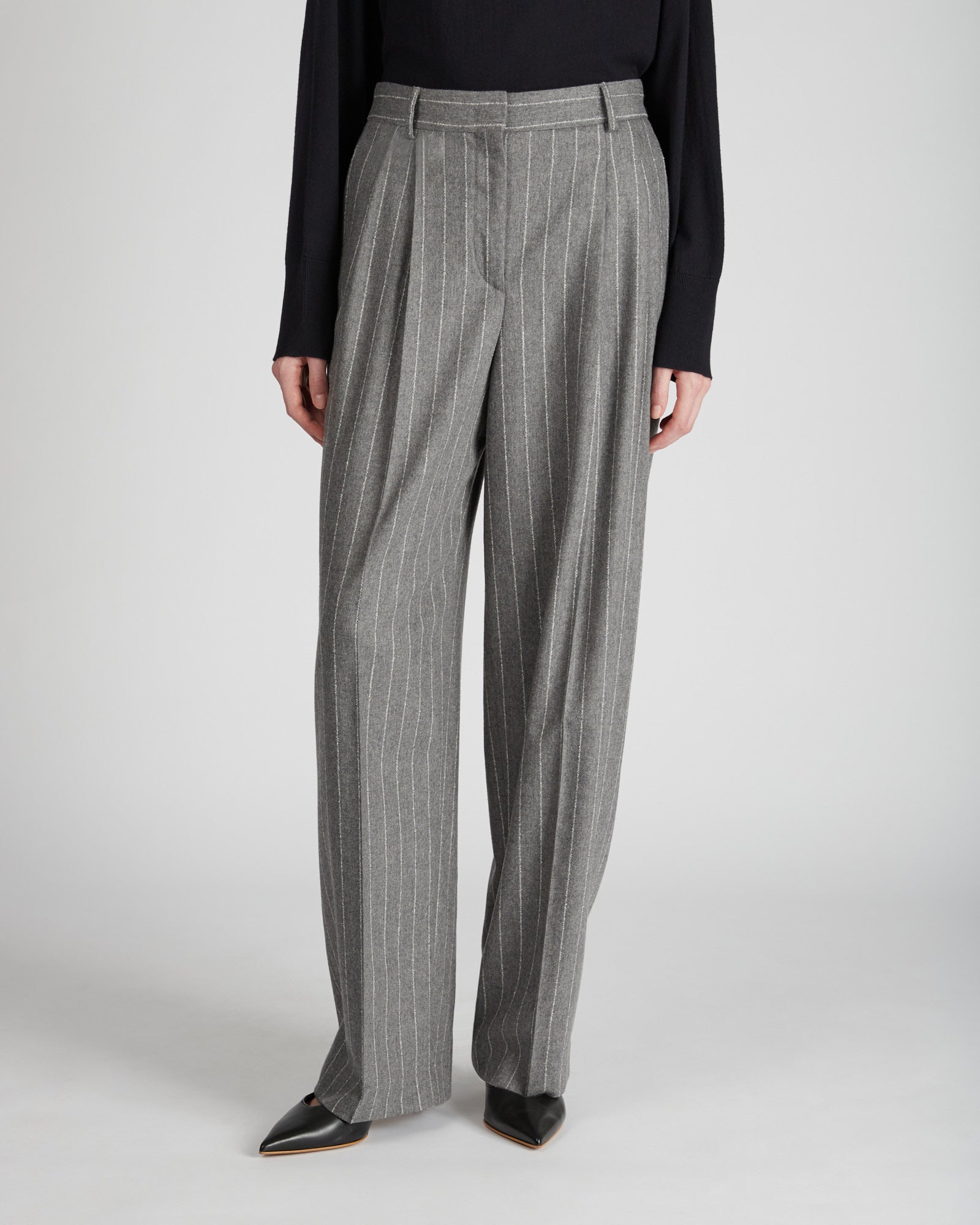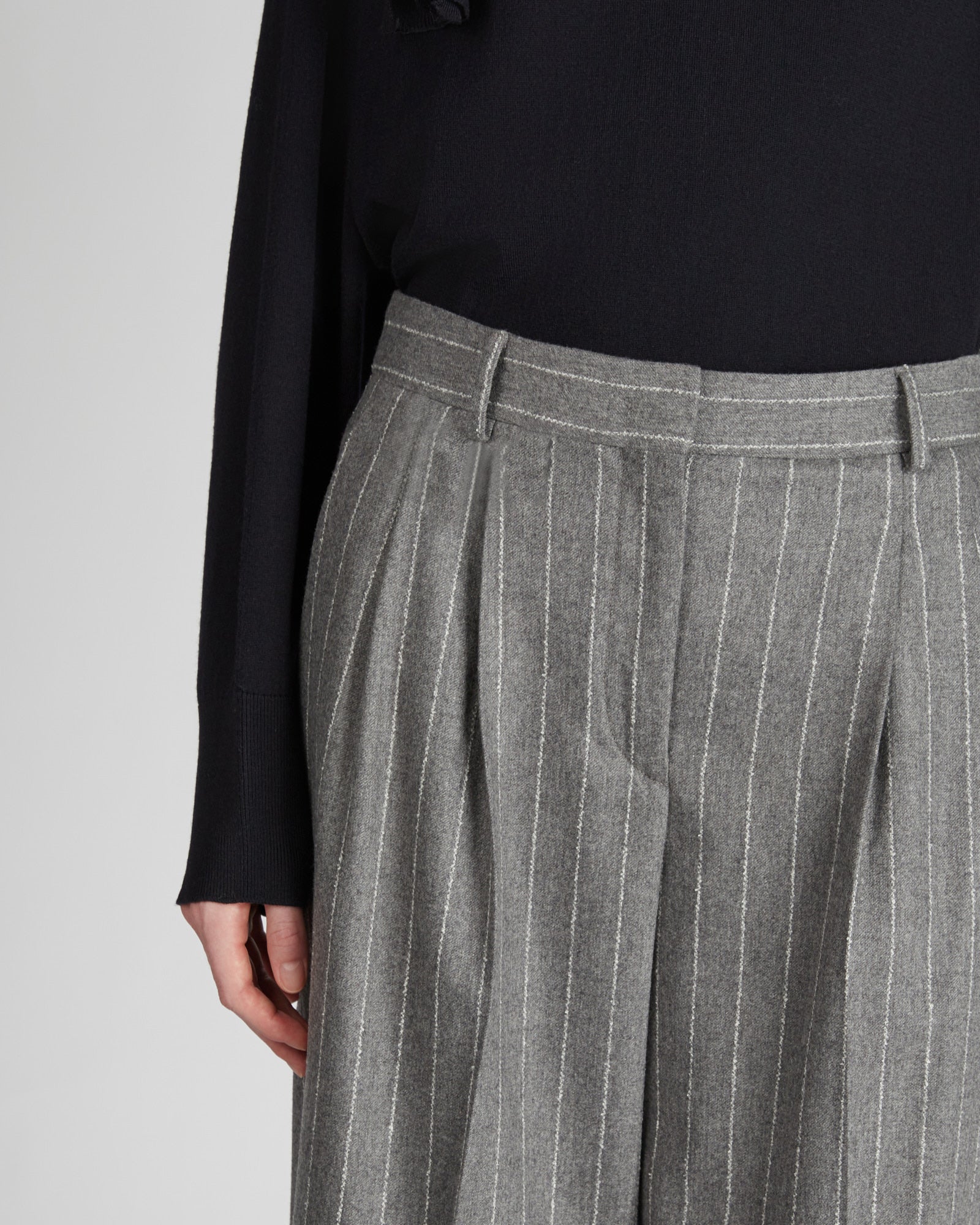 Originally borrowed from the male wardrobe, the pinstripe is now also a firm favourite in elegant upmarket women's wear. Here it is used on trousers with large volumes and an original belt construction, in a soft and warm flannel produced through a certified process that guarantees the minimisation of chemicals at all stages of production. The trousers can be combined with the blazer made of the same fabric, for an original and sophisticated look.