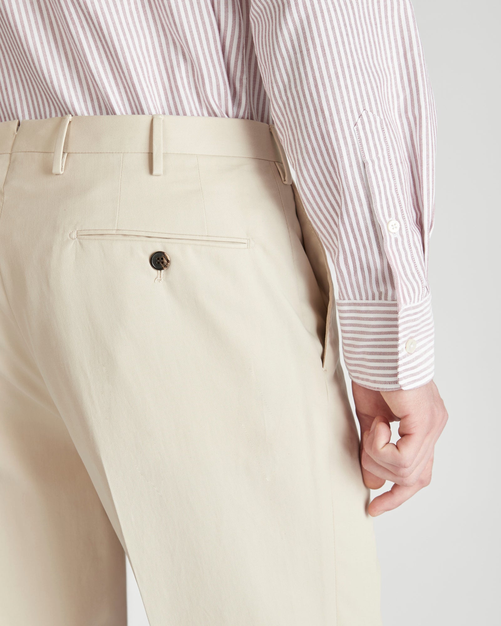 - The trousers feature front slash pockets and double welted buttoned back pockets.