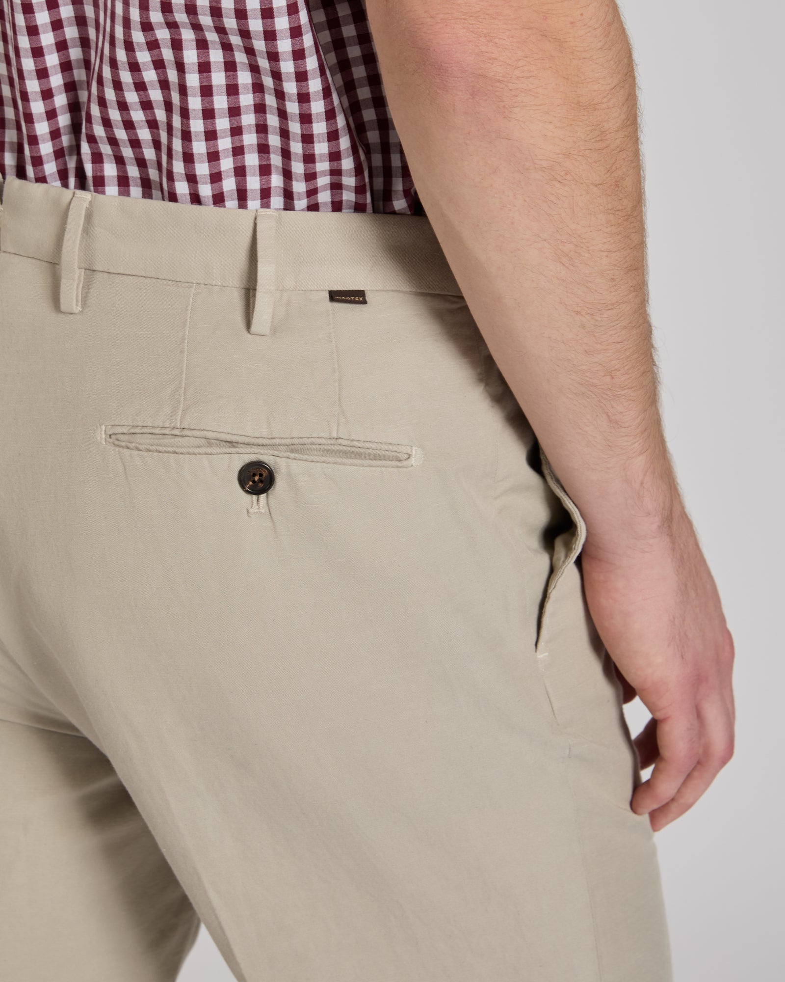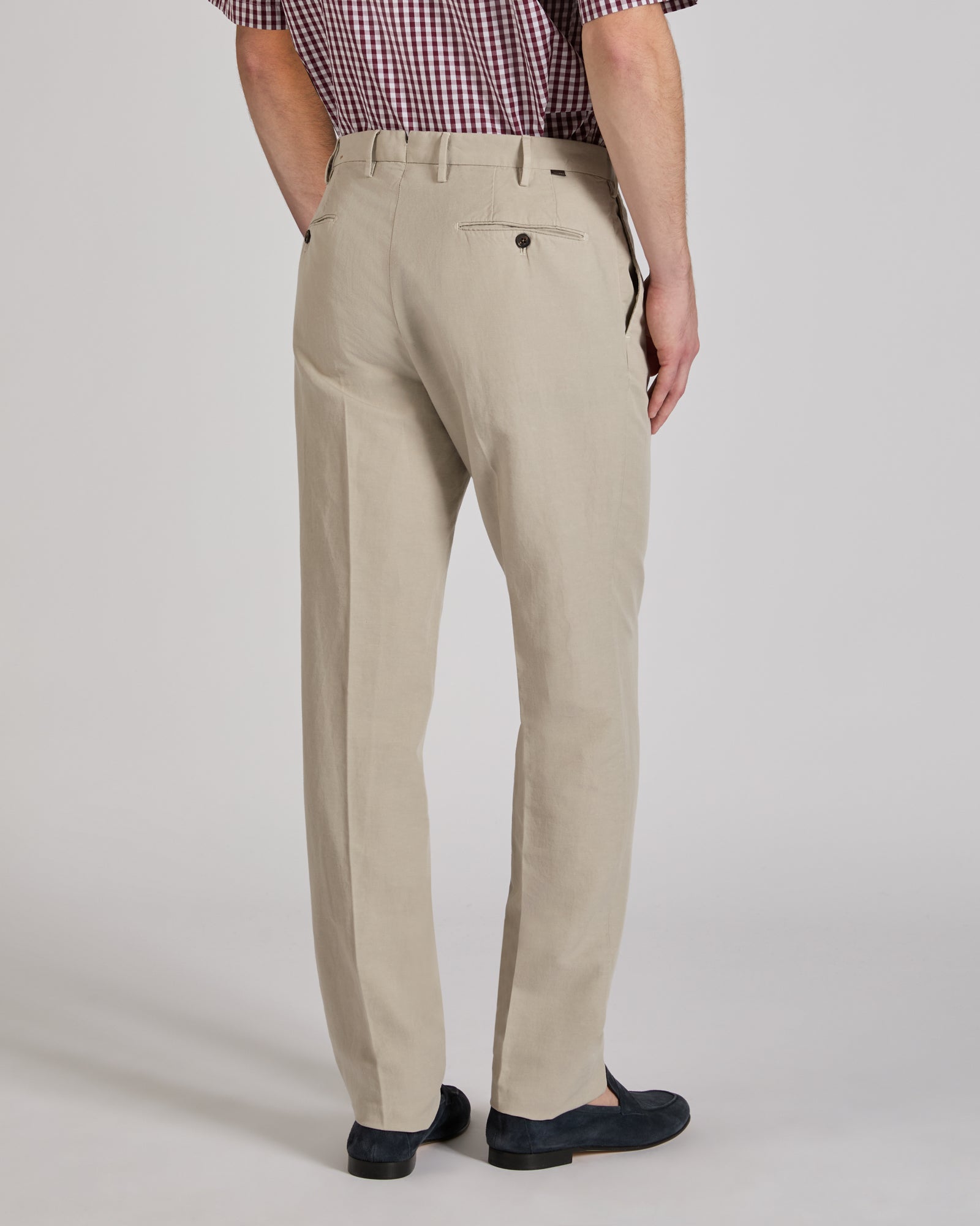 Chinolino is an innovative fabric created from a premium blend of linen and cotton: the breathable qualities of linen are combined with the softness of cotton to create cool, summery trousers. Now an iconic part of the brand's range, this refined fabric is particularly valued by our connoisseurs for its lightweight yet soft and cool feel. Here it is used on Model 39, a historic regular fit style from our collections.