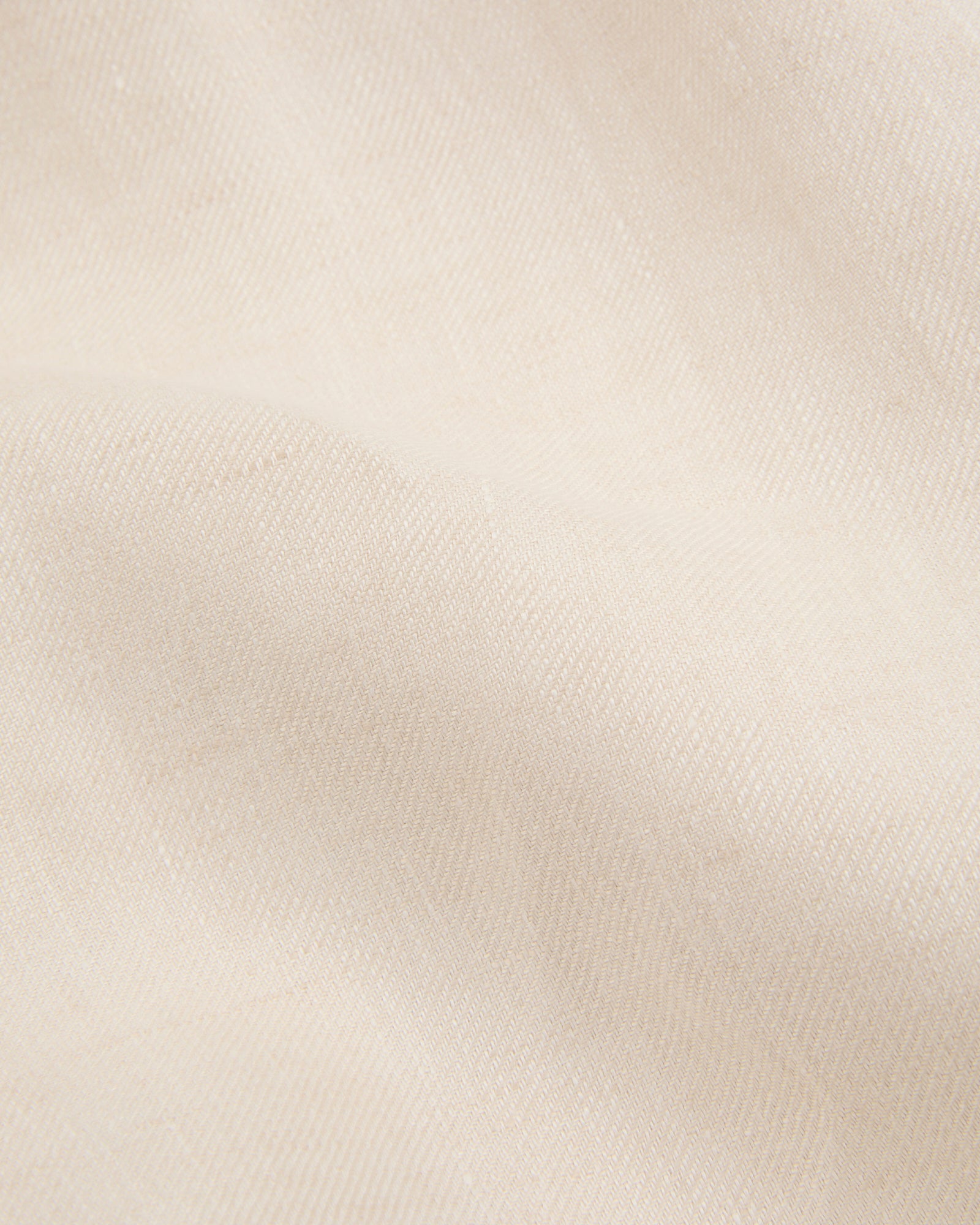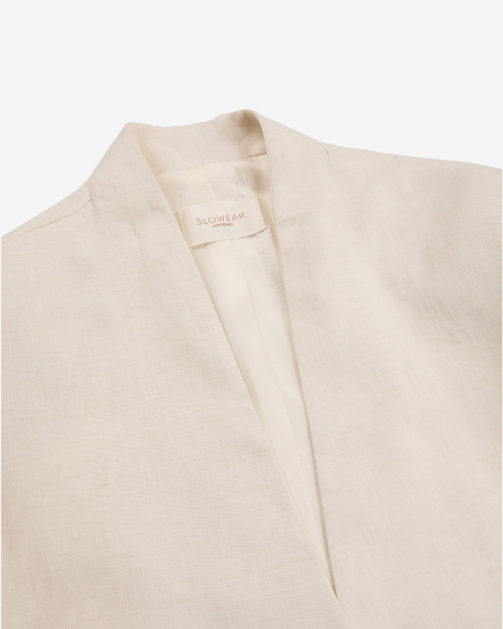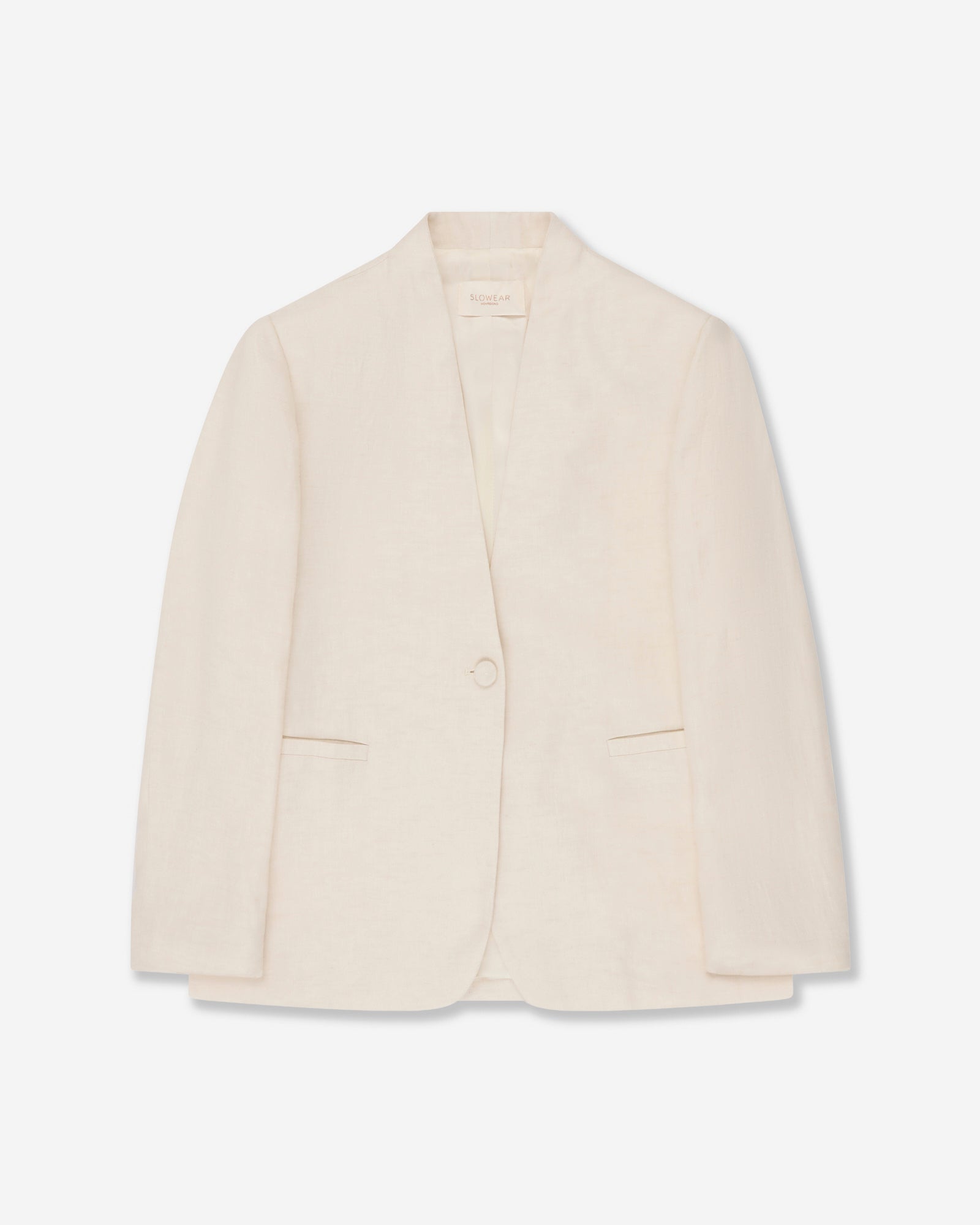 Linen is one of the world's oldest textile fibres. Centuries of innovation and research have consolidated its prominent role in women's dress. Much favoured for its subtly iridescent appearance, it is lightweight yet resilient and extremely pleasant to wear throughout the day. Here it is used on a refined regular-fit blazer design, defined by highly appealing tailoring details: a more structured shoulder thanks to the internal shoulder pad, the absence of lapels for a clean, elegant line, a button covered with the same fabric, and macramé lace at the sleeve hem, easily removable for greater versatility of wear. The jacket can be combined with trousers and Bermuda shorts made of the same fabric, for a refined suit effect.