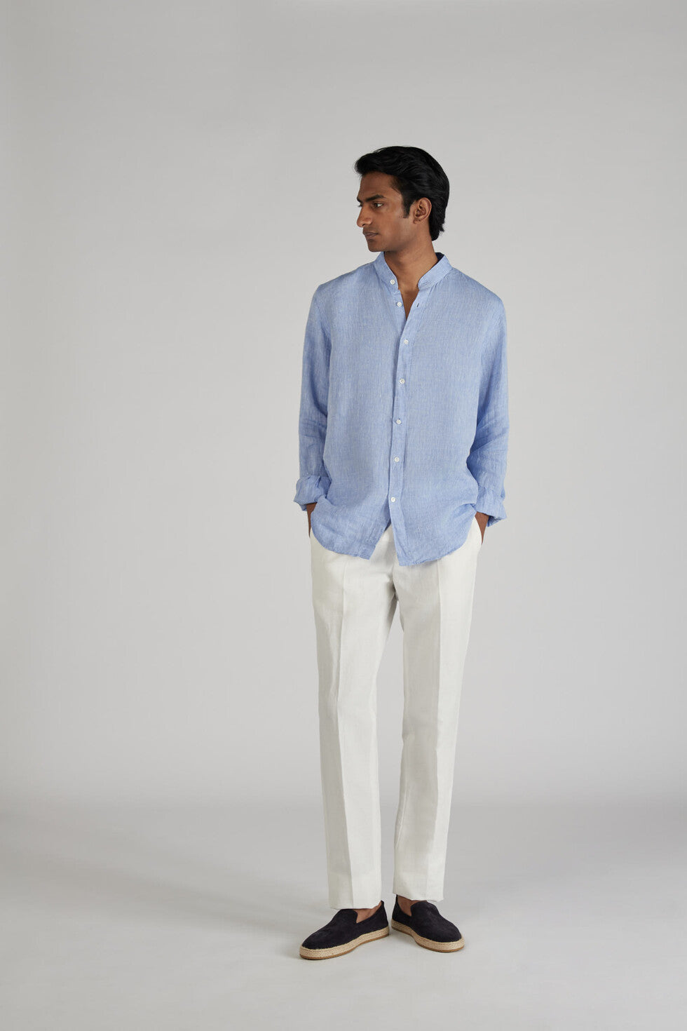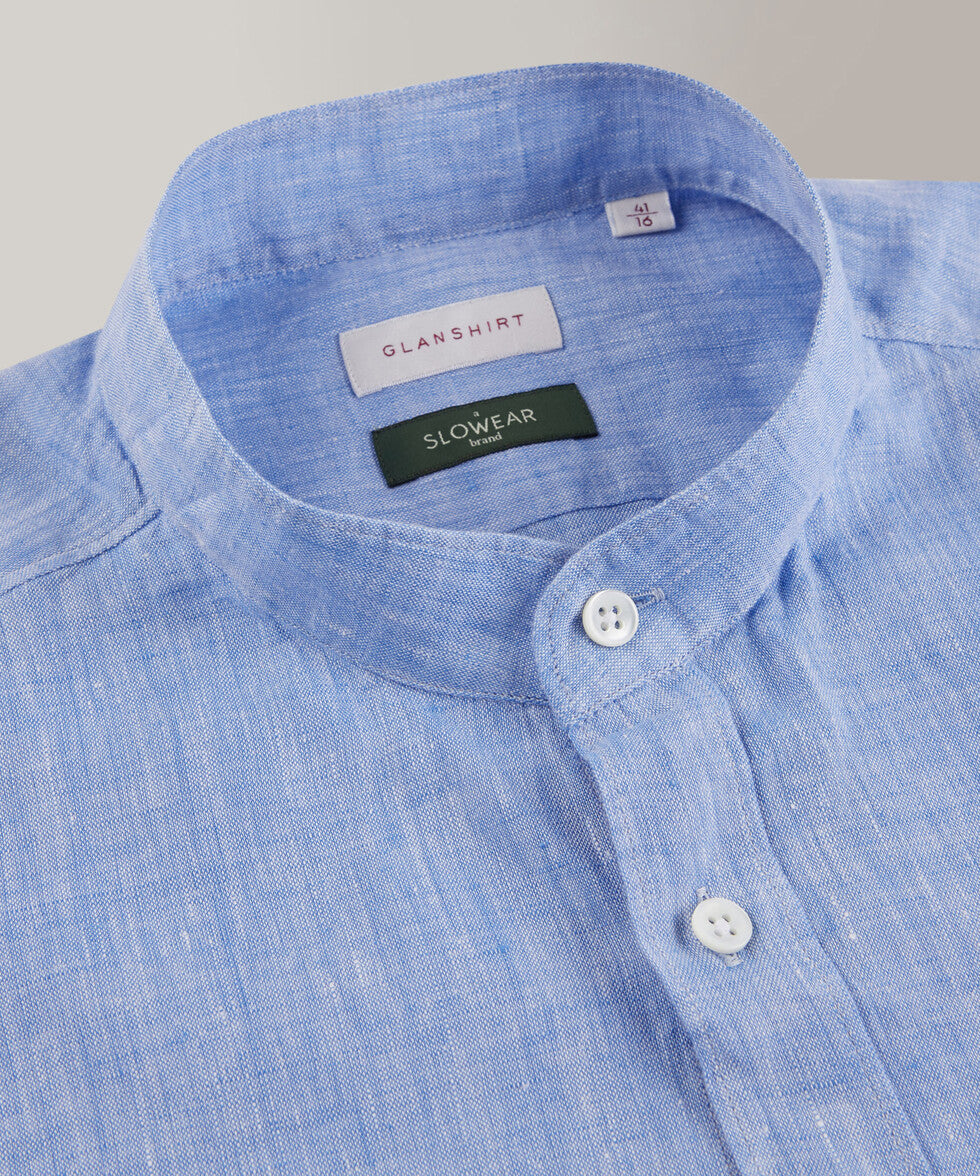 Linen is one of the world's oldest textile fibres. Centuries of innovation and research have ensured its role as one of today's premium shirt fabrics: lightweight yet durable, with a slightly iridescent appearance, very pleasant to wear throughout the day. Extremely refined and with a summery feel, its combination with a regular fit model, featuring a Mandarin collar.