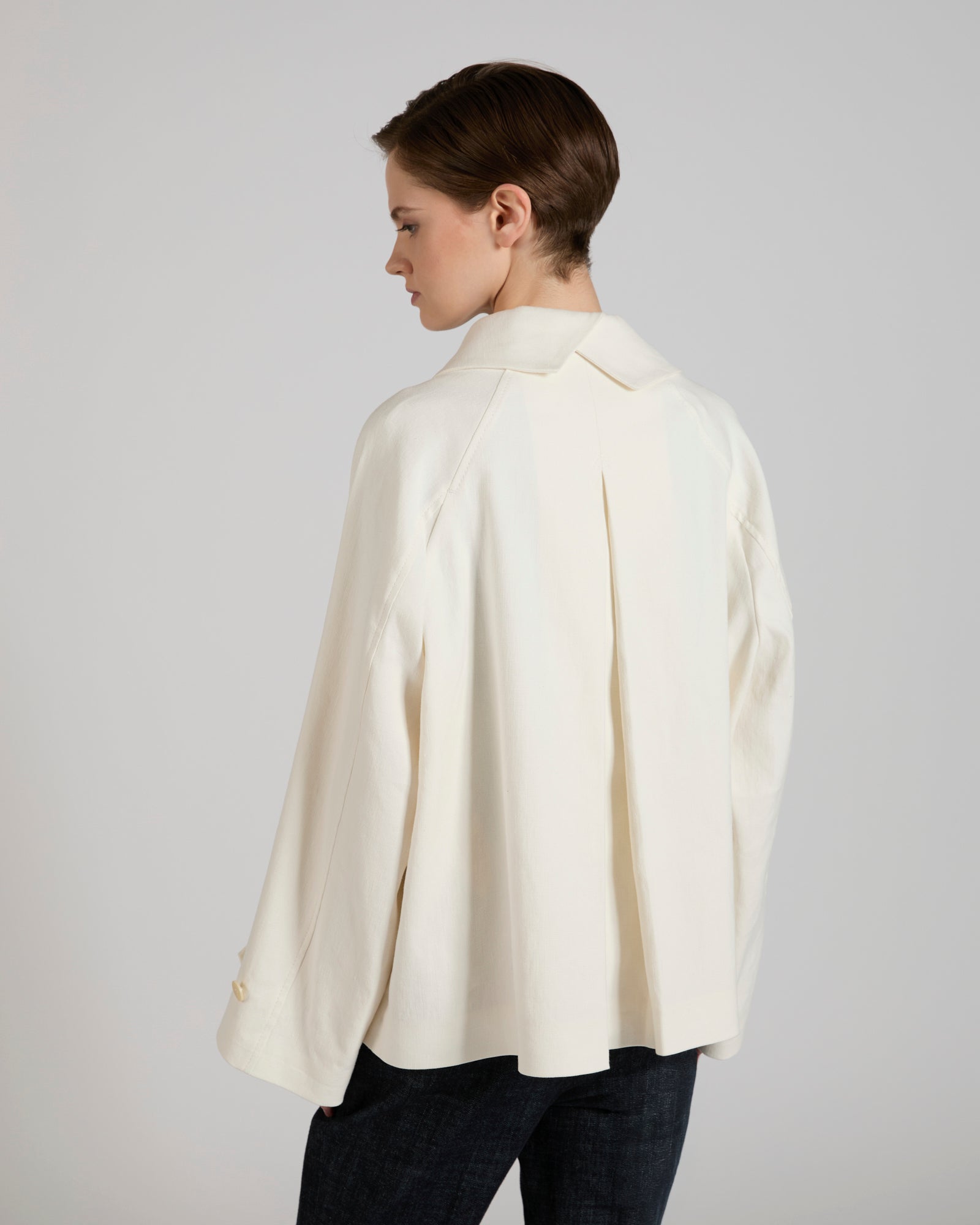 This short pea coat elegantly interprets the concept of early-season outerwear, combining structured lightness and sophisticated simplicity. The wide and modern line is emphasised by the generous back pleat, which lends movement and character to the silhouette, maintaining a balance between volume and clean lines. The garment is made of cotton and linen panama, a fabric with an airy and natural weave, chosen for its cool feel, compact lightness and delicate strength.