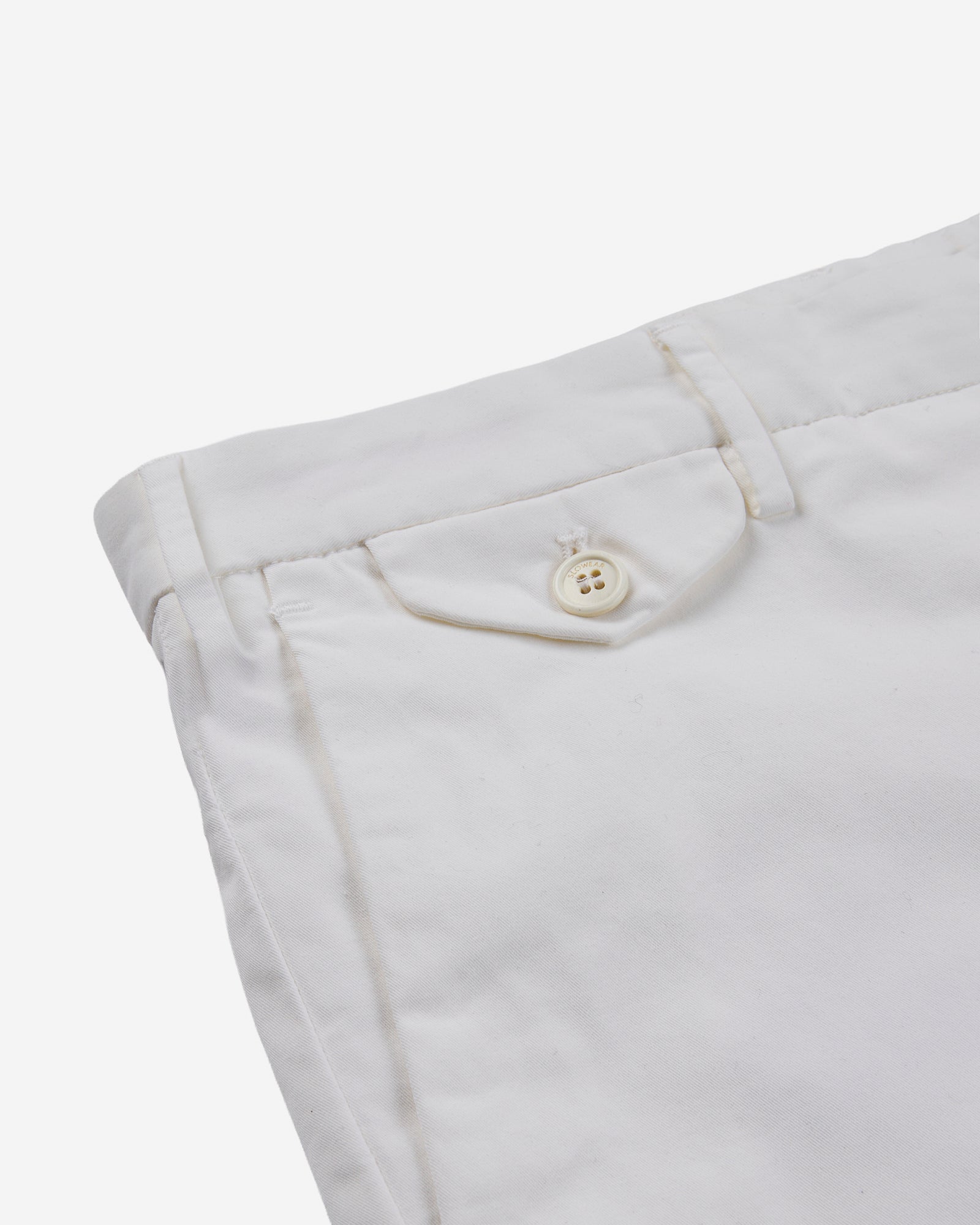 • The trousers have front slash pockets, a coin pocket with flap and button, and single-welt back pockets.