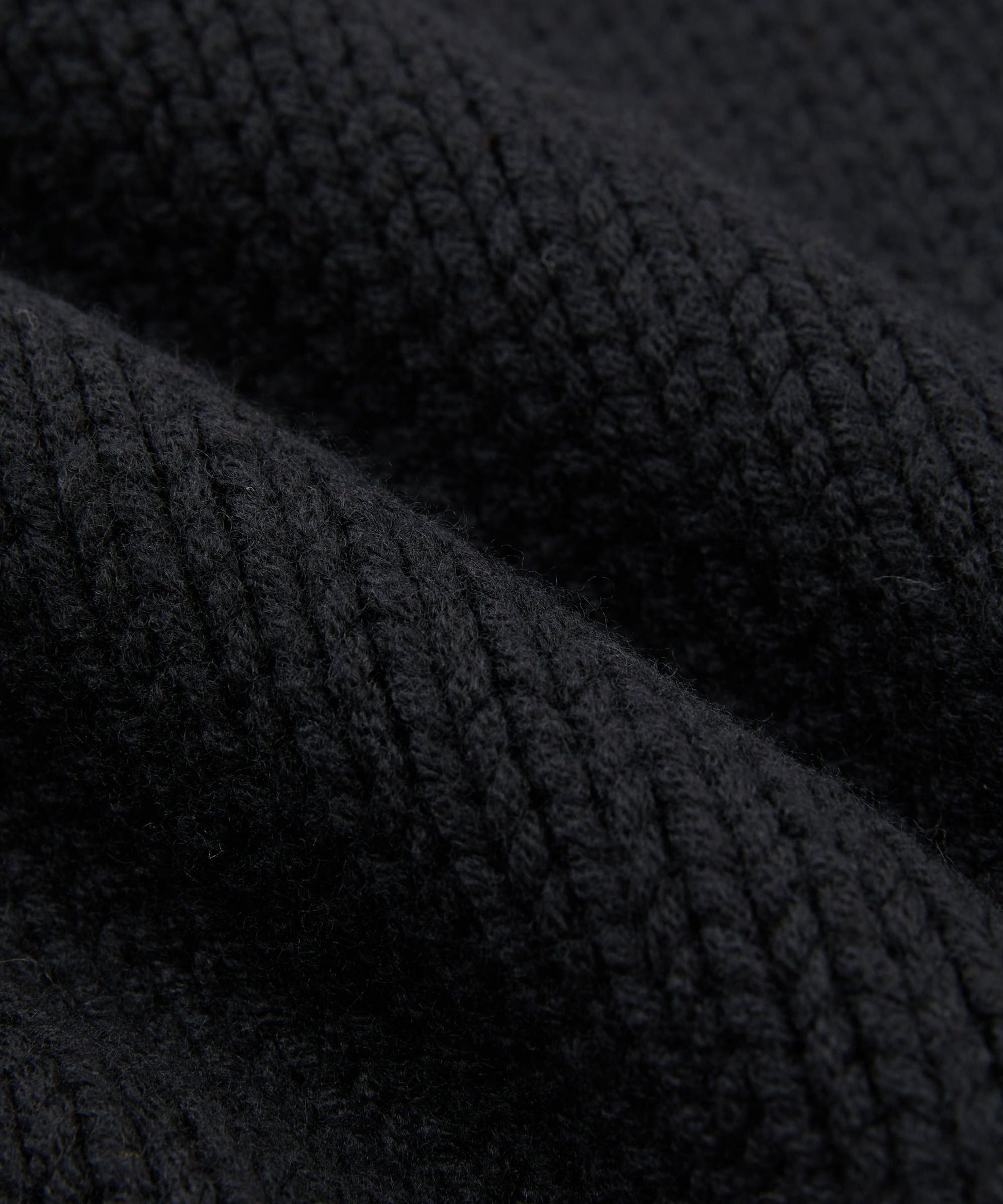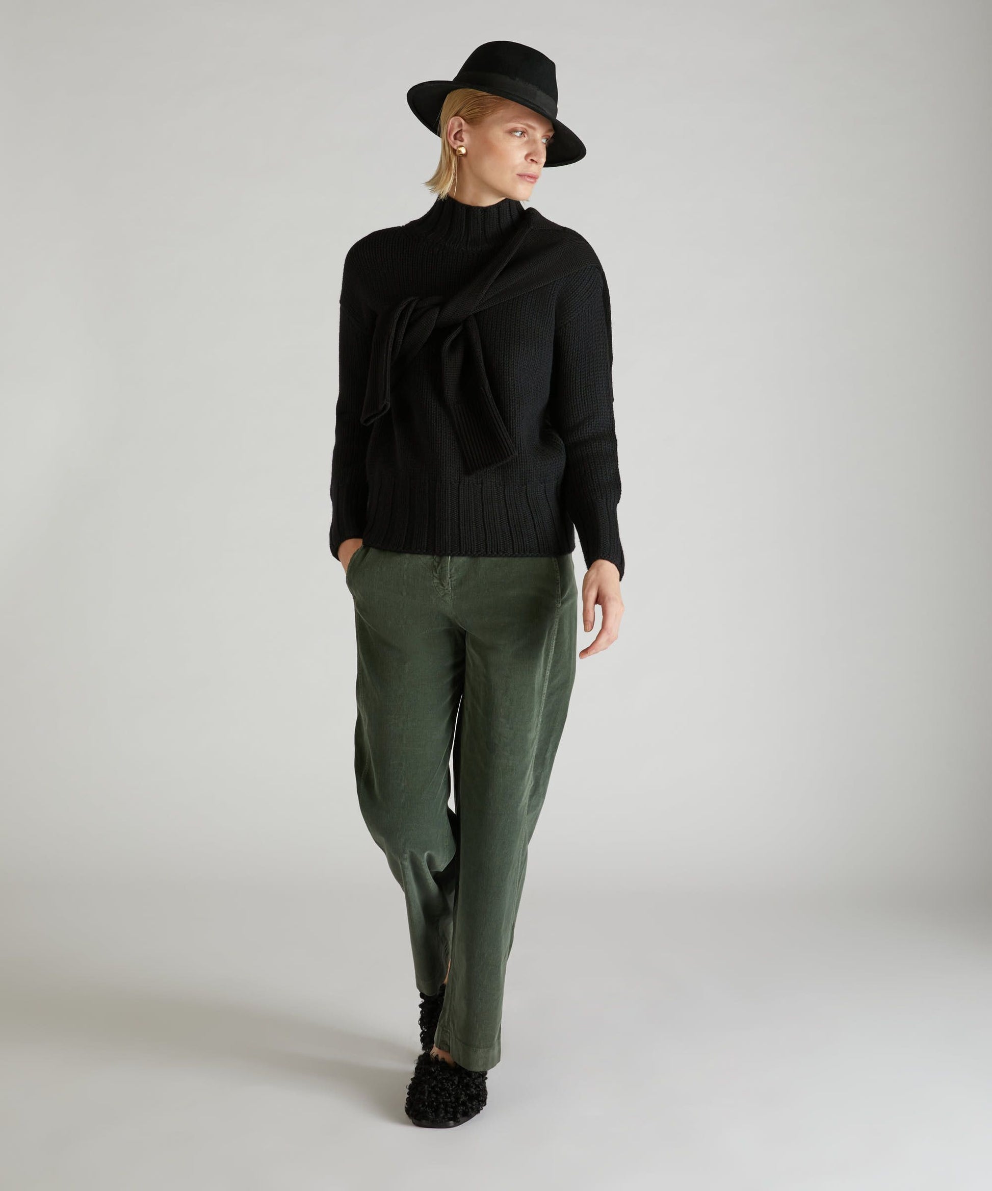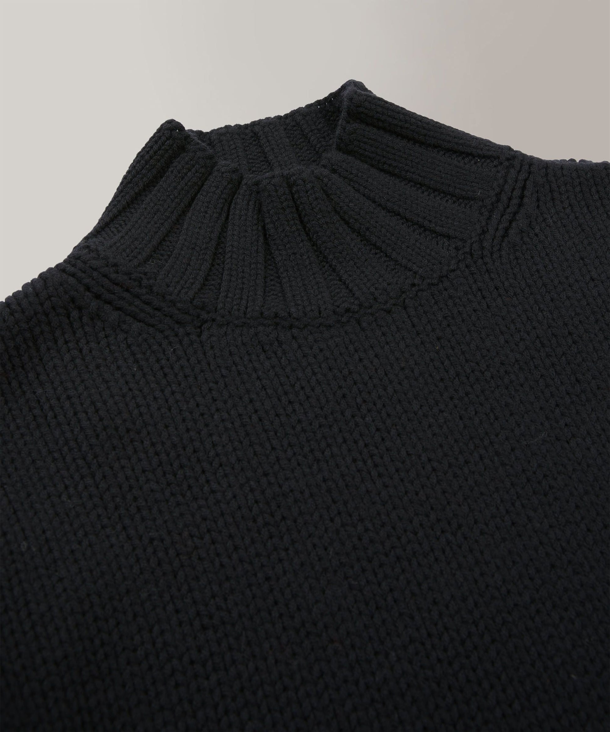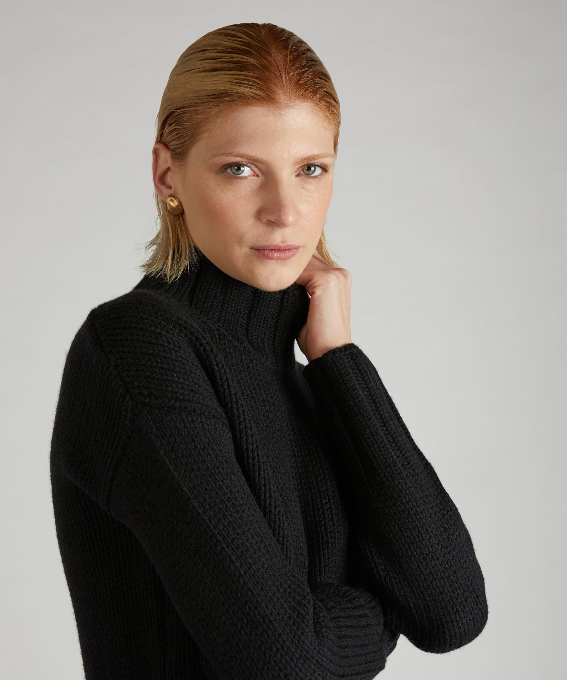 The polo neck is surely one of the classics of knitwear: versatile and timeless with a unique allure. This model has fine ribbed detailing at the neck, hem and cuff, for an original contrast with the stockinette detailing on the front and back.