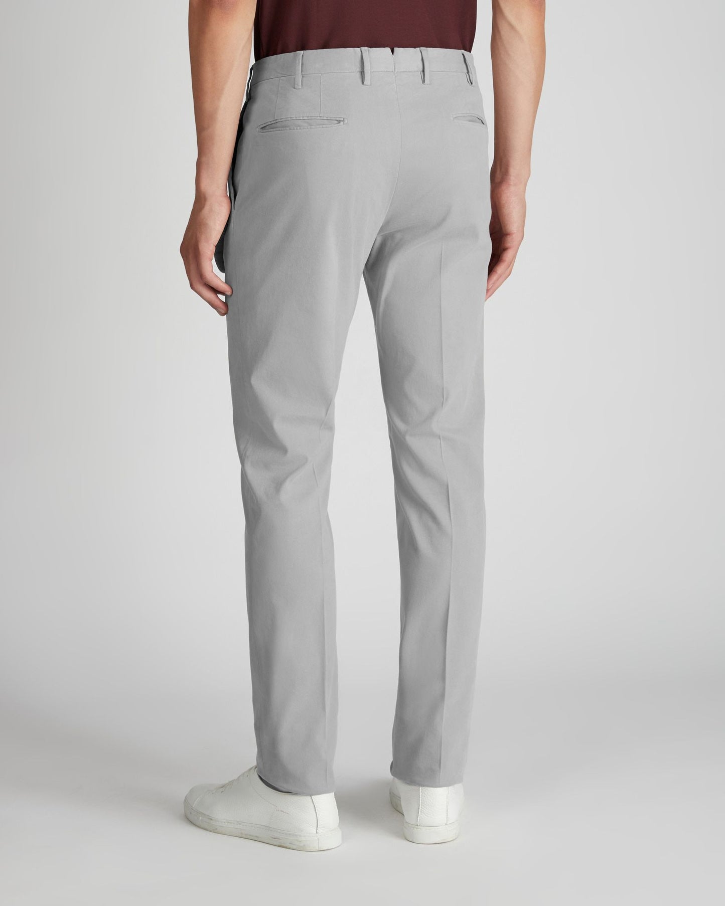 - The trousers have front slash pockets and double-welt back pockets.