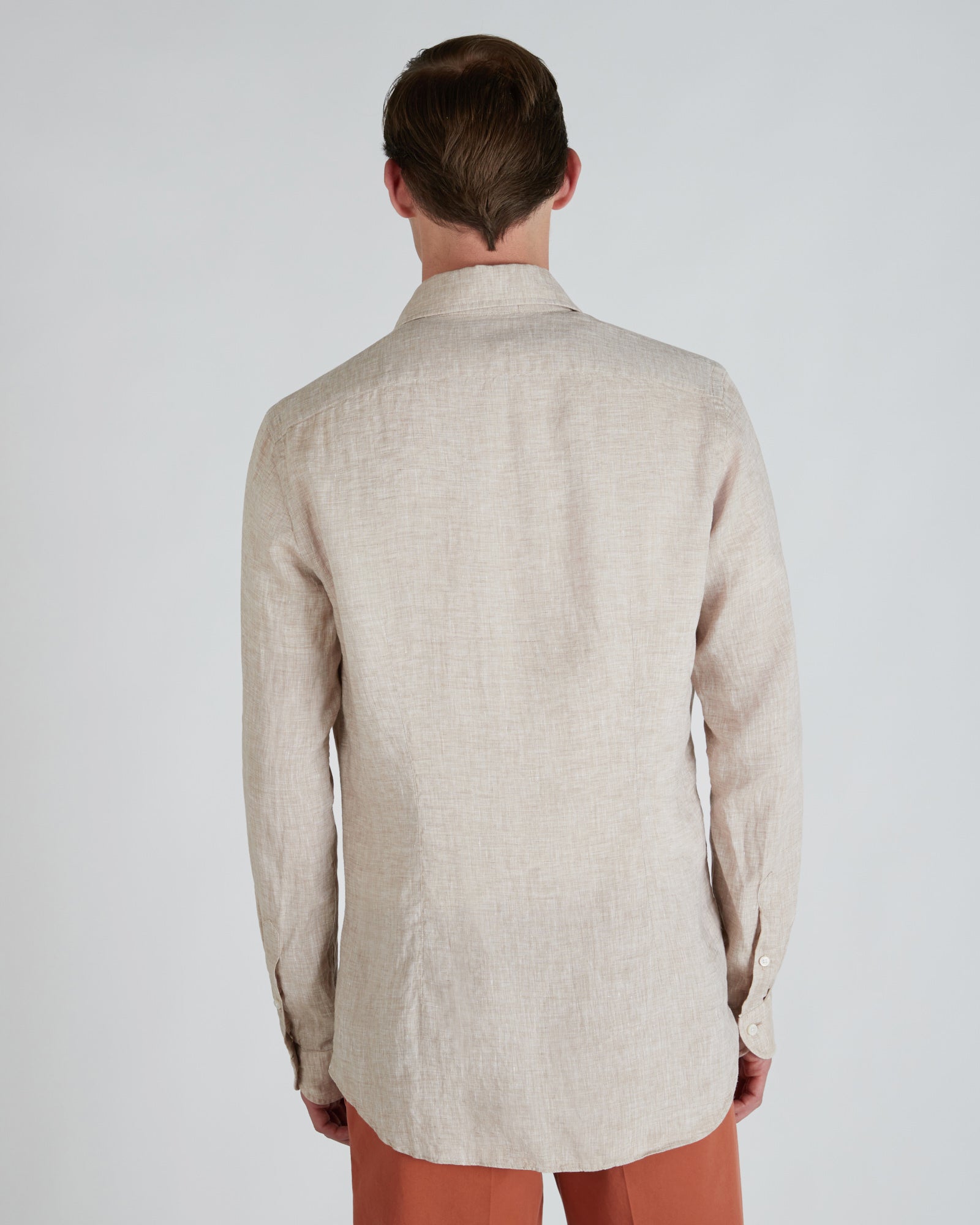 Linen is one of the world's oldest textile fibres. Centuries of innovation and research have ensured its role as one of today's premium shirt fabrics: lightweight yet durable, with a slightly iridescent appearance, it is very pleasant to wear throughout the day. Here it is used on a regular-fit shirt and proposed in refined shades, a perfect expression of summer lightness.