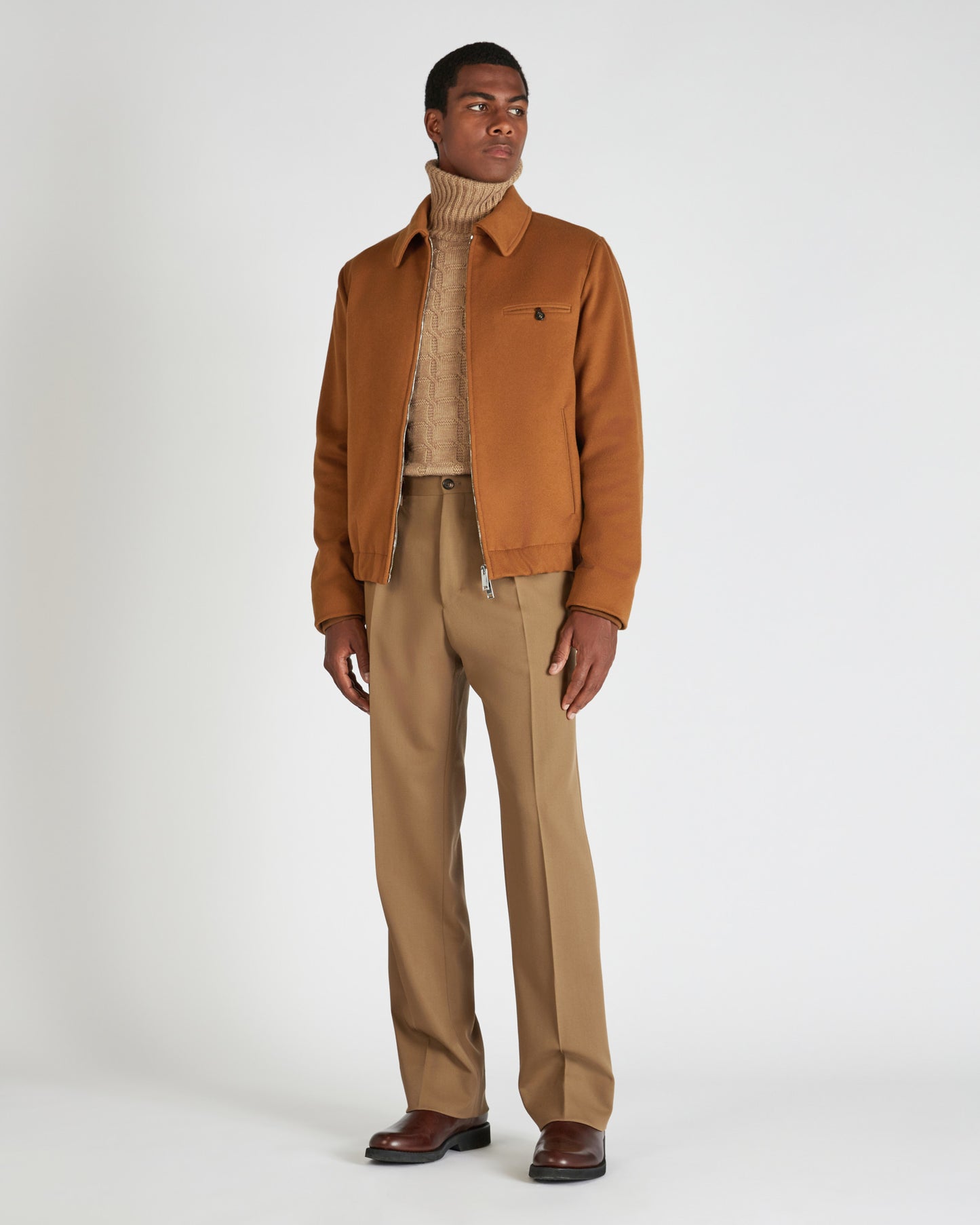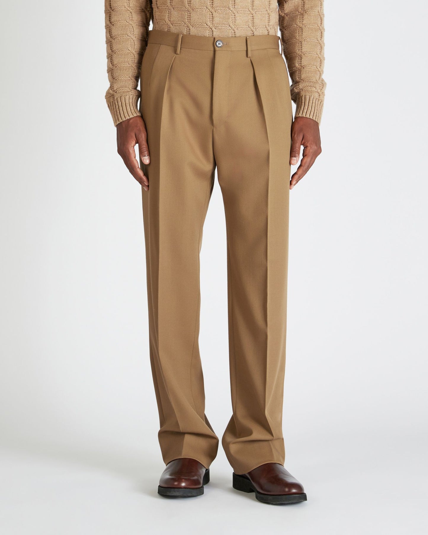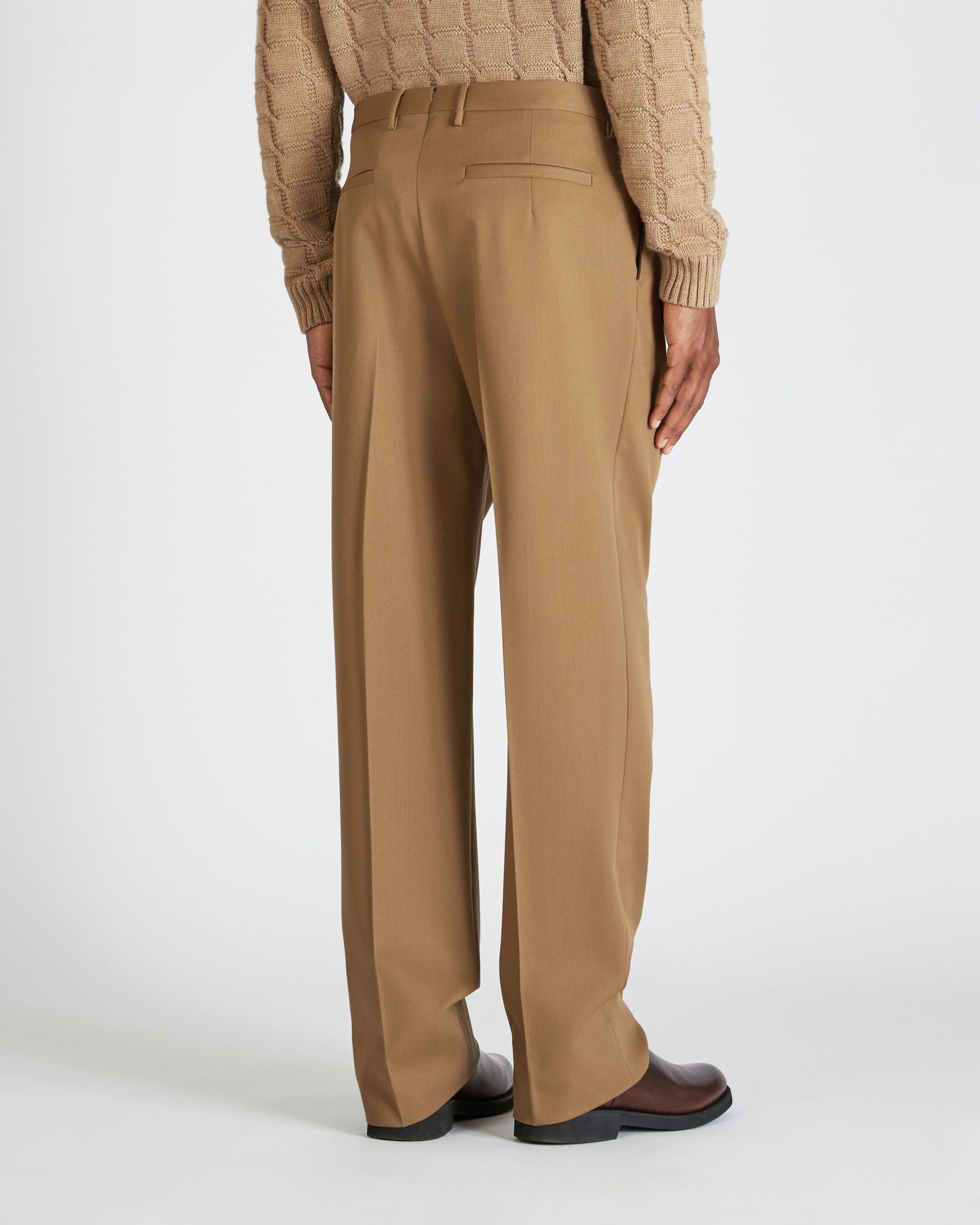 Refined and understated, these tailored trousers are the epitome of relaxed elegance. Crafted from fine wool gabardine, they offer a pleasant natural stretch that ensures freedom of movement without compromising the garment's structure. The design is enhanced by a relaxed fit that creates soft volume, perfect for a contemporary, versatile look. The French pleat adds a refined detail that nods to traditional tailoring while maintaining a modern allure.