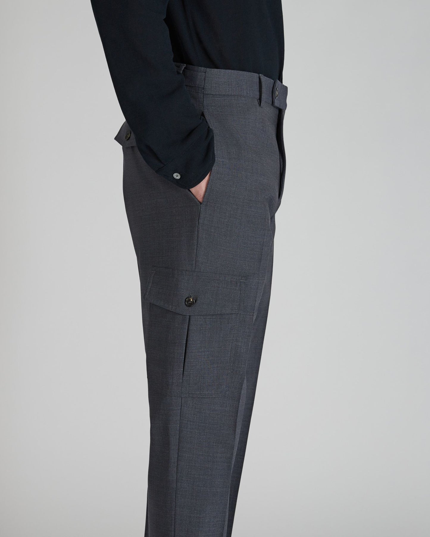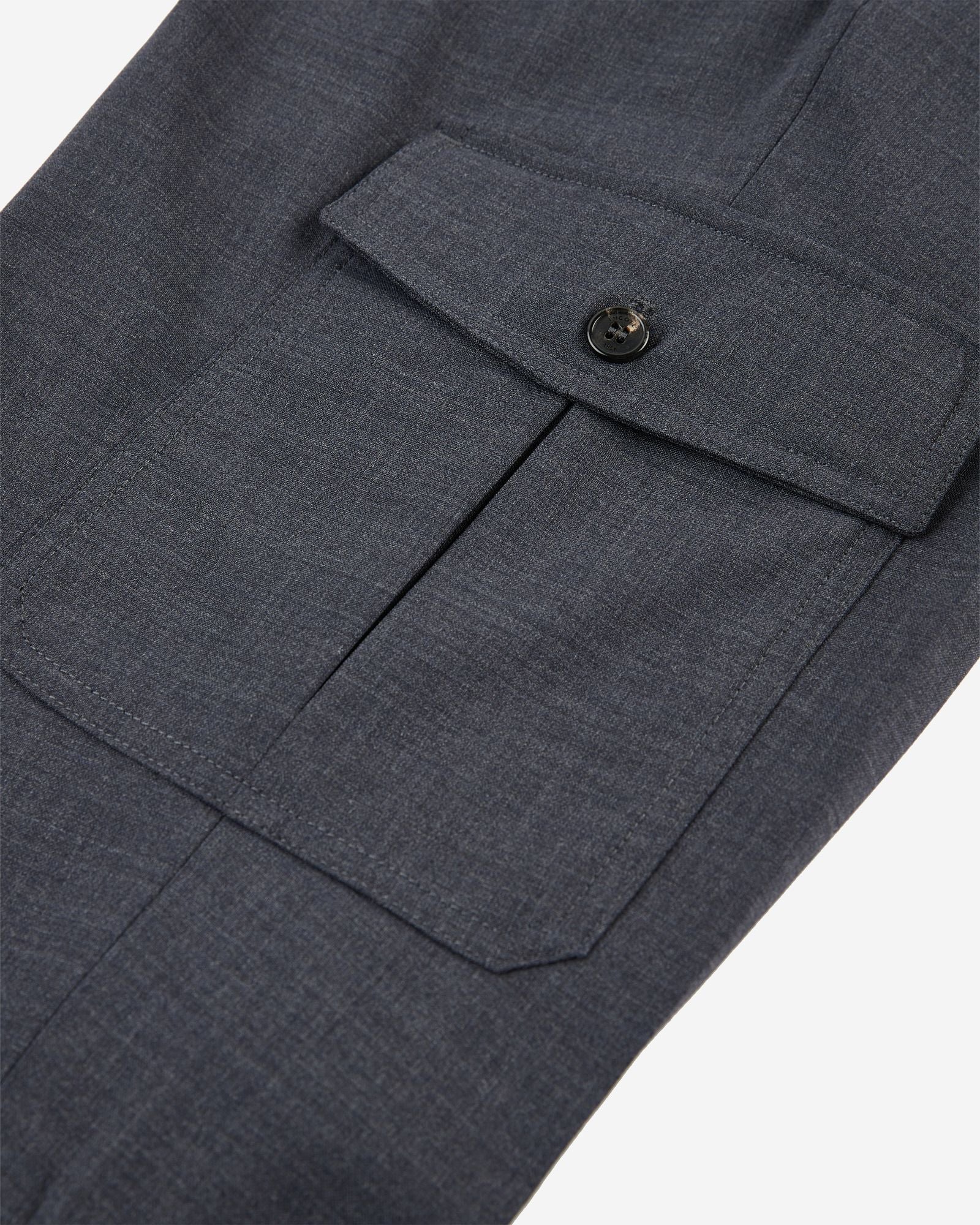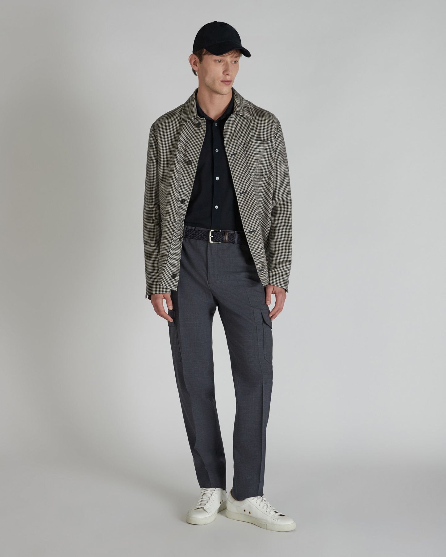 These trousers offer an original combination between a workwear-derived model, revisited with a sartorial approach, and a summer fabric with exclusive features. The model is a cargo trouser that is characterised by the iconic bellows pockets along the leg and an original belt construction, with button and loops. The fabric is a super lightweight and stretch wool canvas that is extremely comfortable and produced through a certified process that guarantees the safety of people and the environment and the minimisation of harmful chemicals at all stages of production.