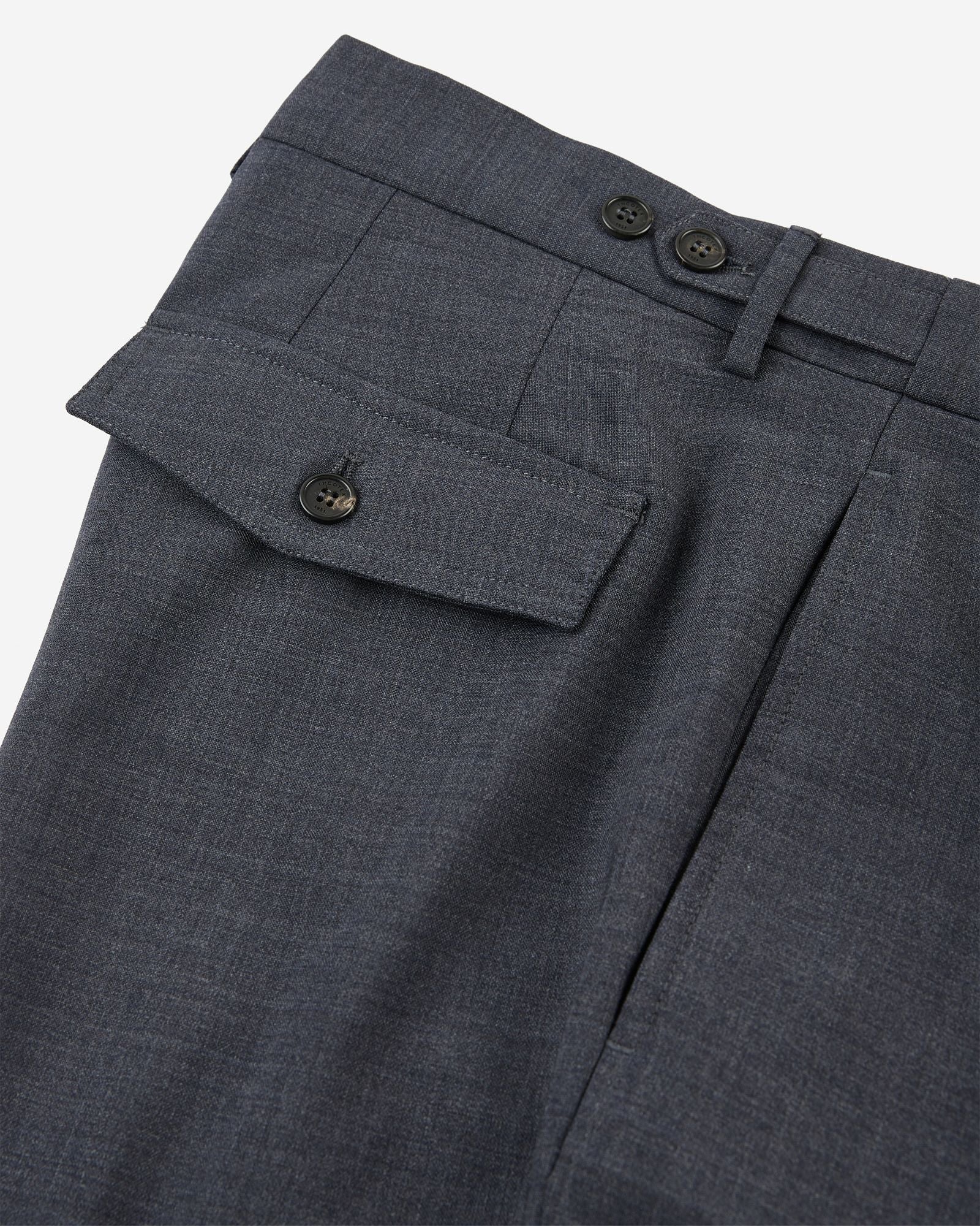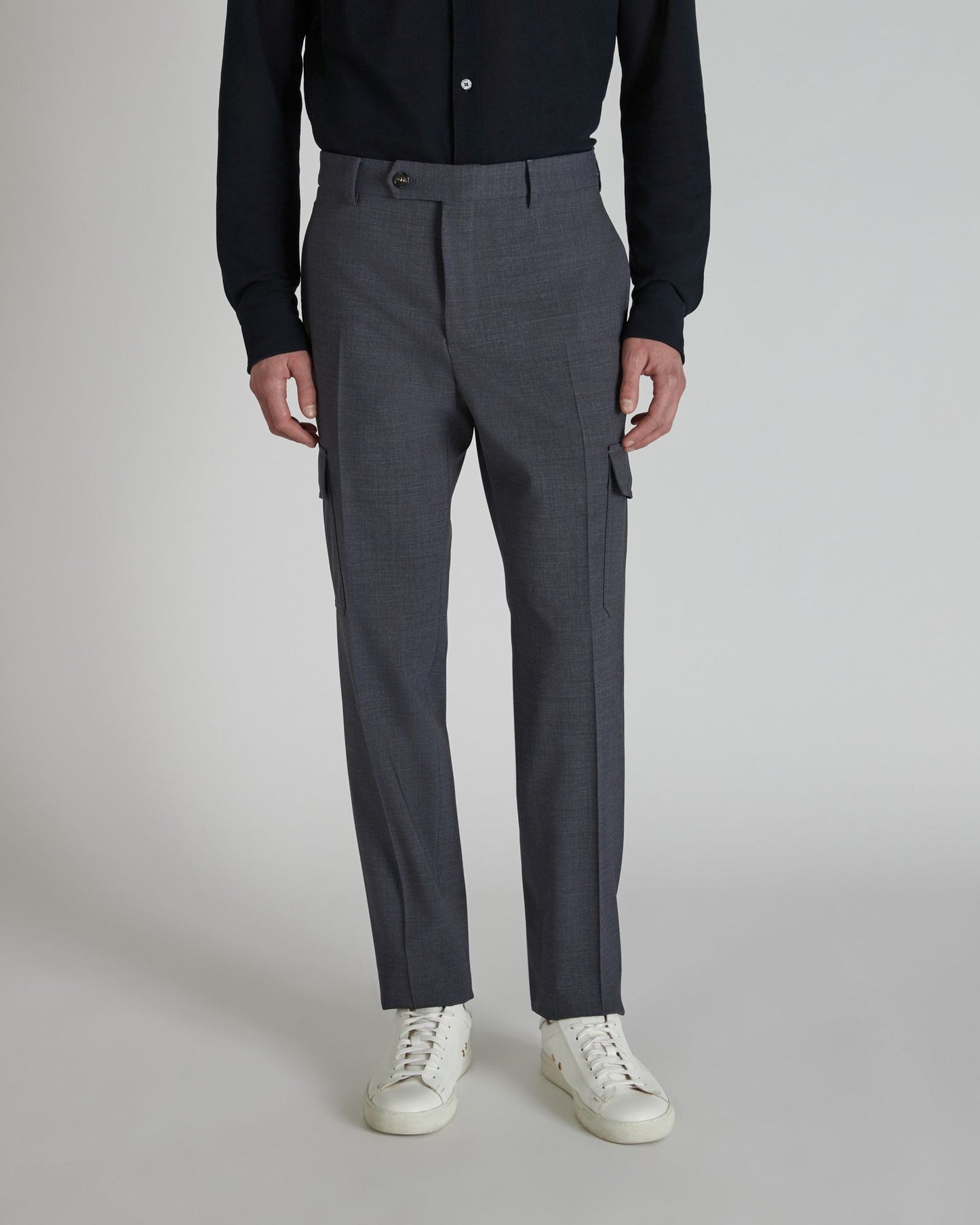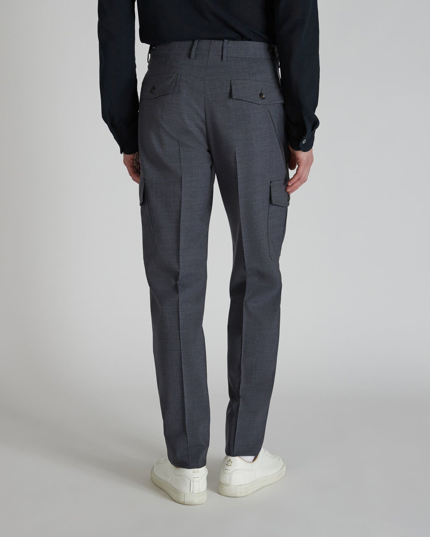 These trousers offer an original combination between a workwear-derived model, revisited with a sartorial approach, and a summer fabric with exclusive features. The model is a cargo trouser that is characterised by the iconic bellows pockets along the leg and an original belt construction, with button and loops. The fabric is a super lightweight and stretch wool canvas that is extremely comfortable and produced through a certified process that guarantees the safety of people and the environment and the minimisation of harmful chemicals at all stages of production.
