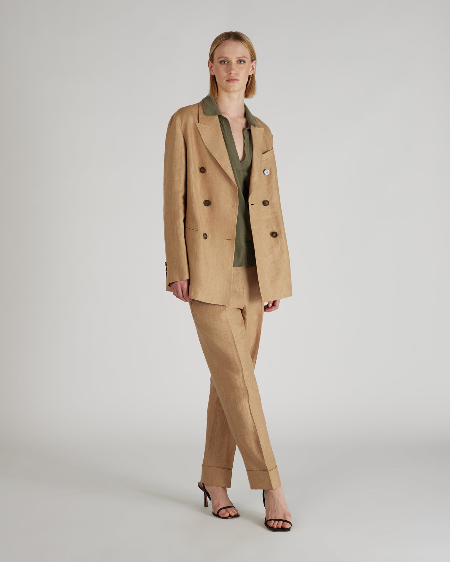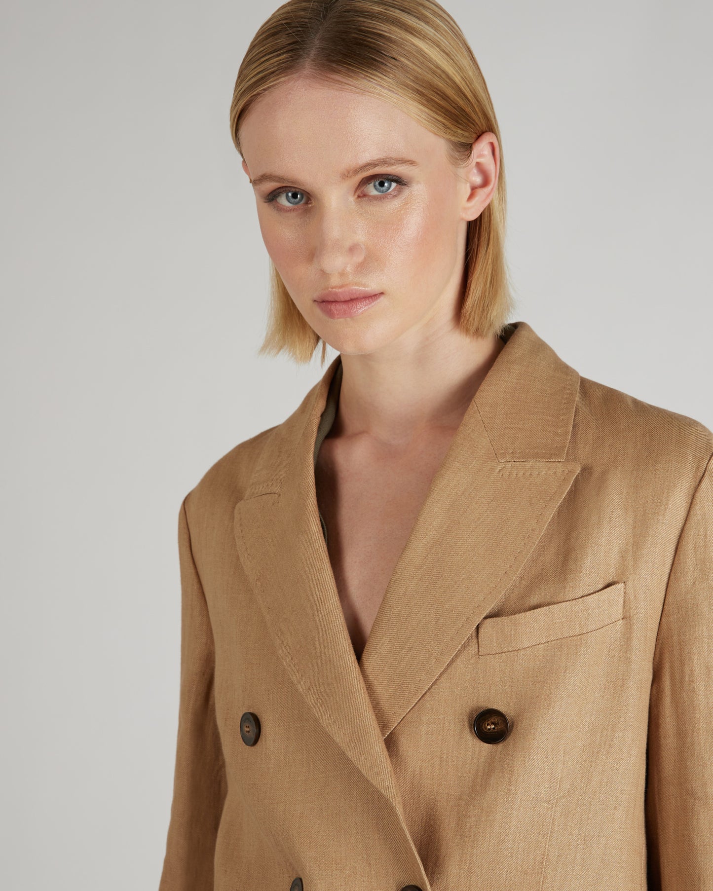 Linen is one of the world's oldest textile fibres. Centuries of innovation and research have consolidated its prominent role in women's dress. Much favoured for its subtly iridescent appearance, it is lightweight yet resilient and extremely pleasant to wear throughout the day. Combined with the timeless appeal of the iconic double-breasted garment, it forms a wardrobe staple. The jacket can be combined with trousers made of the same fabric, for a refined suit effect.