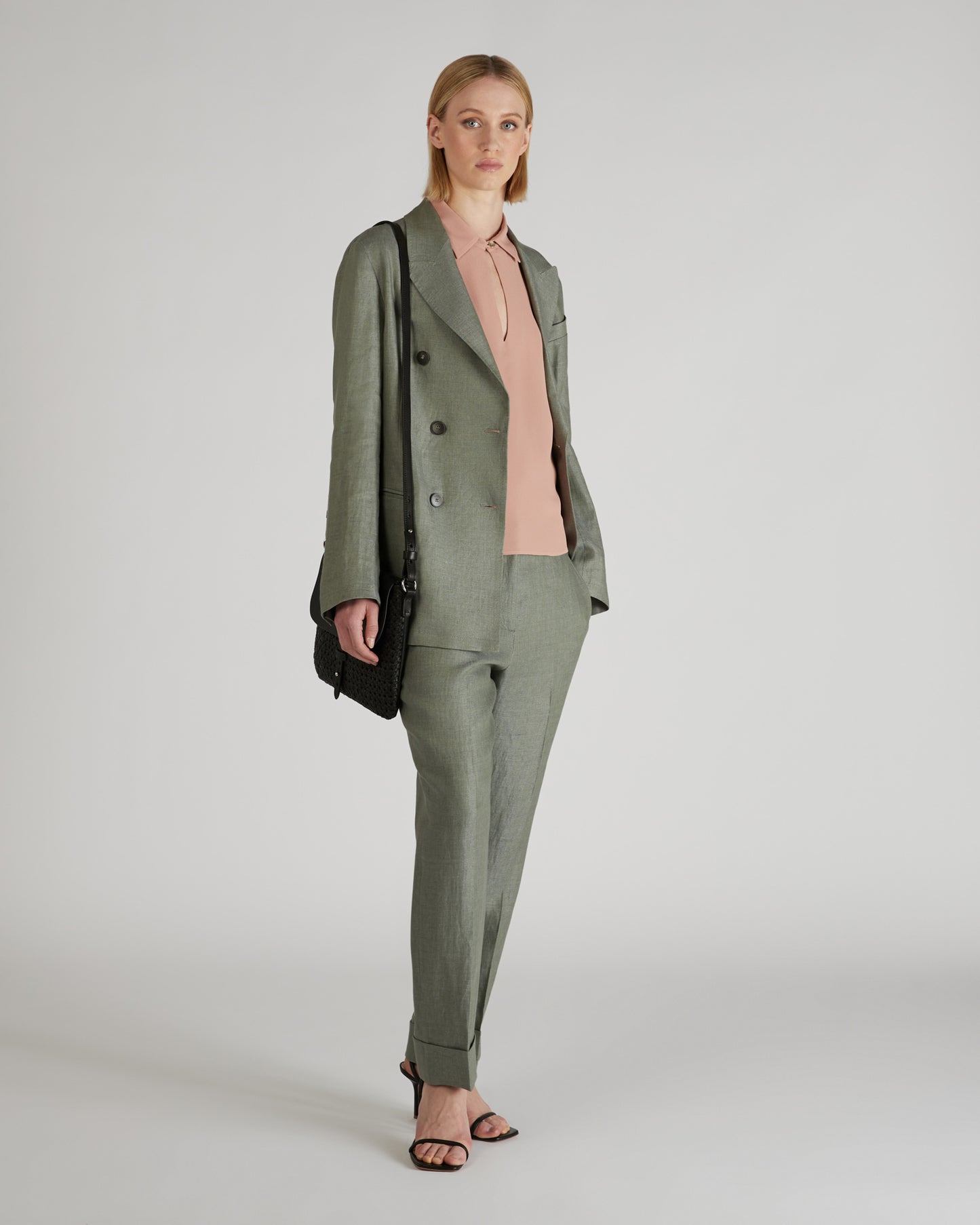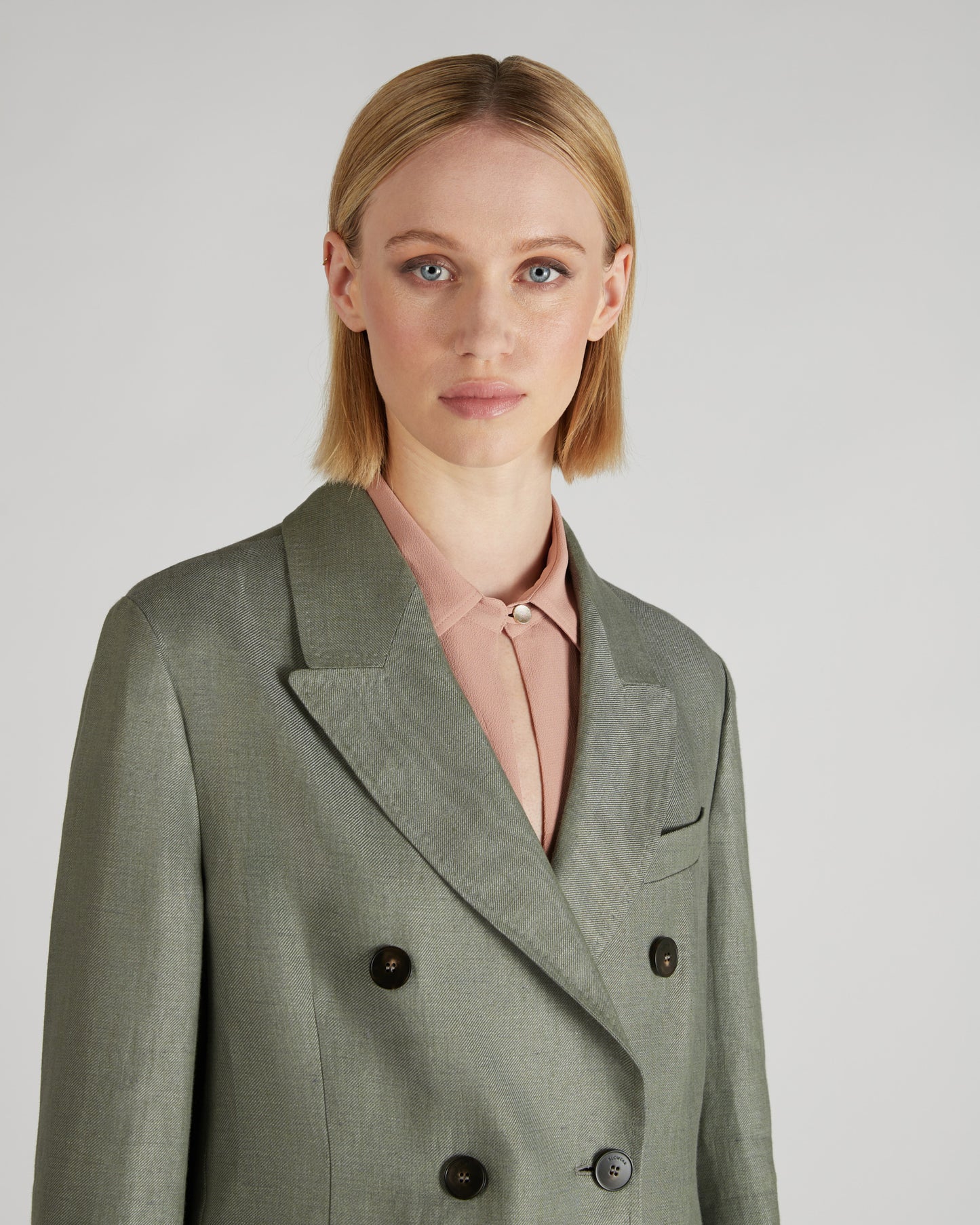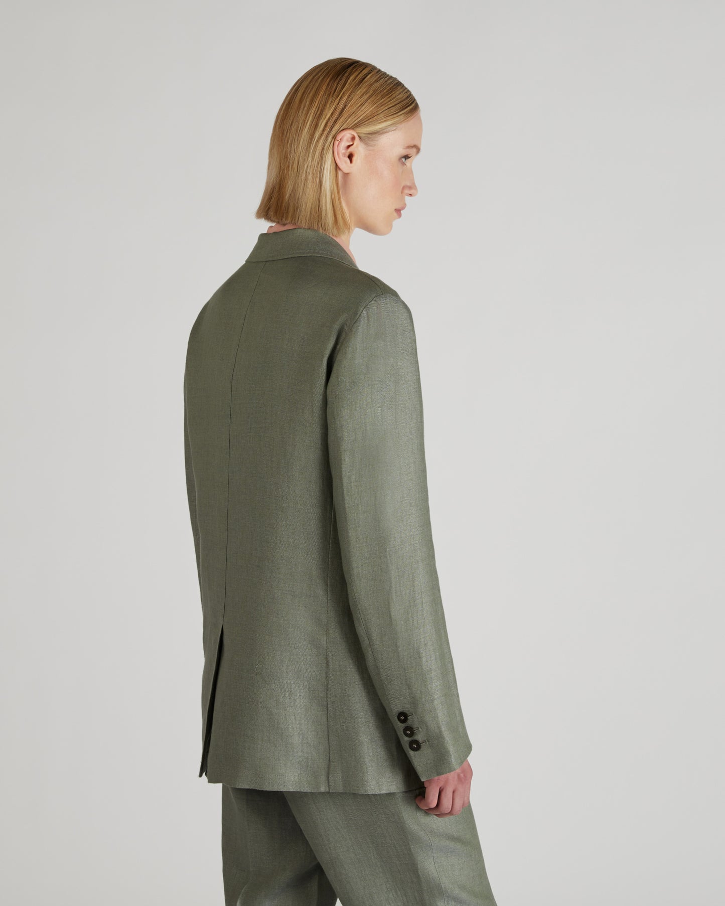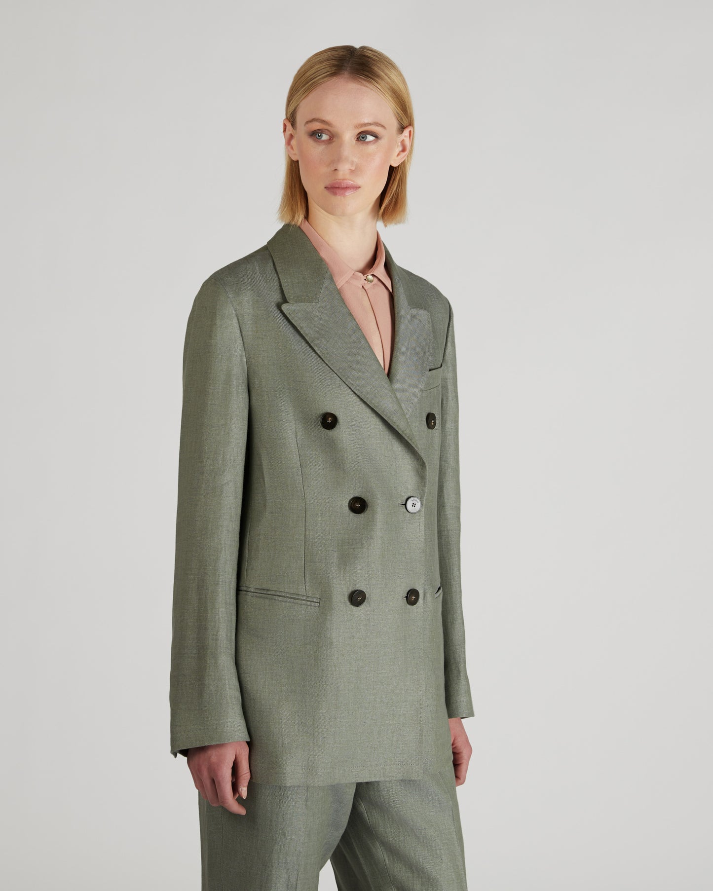 Linen is one of the world's oldest textile fibres. Centuries of innovation and research have consolidated its prominent role in women's dress. Much favoured for its subtly iridescent appearance, it is lightweight yet resilient and extremely pleasant to wear throughout the day. Combined with the timeless appeal of the iconic double-breasted garment, it forms a wardrobe staple. The jacket can be combined with trousers made of the same fabric, for a refined suit effect.