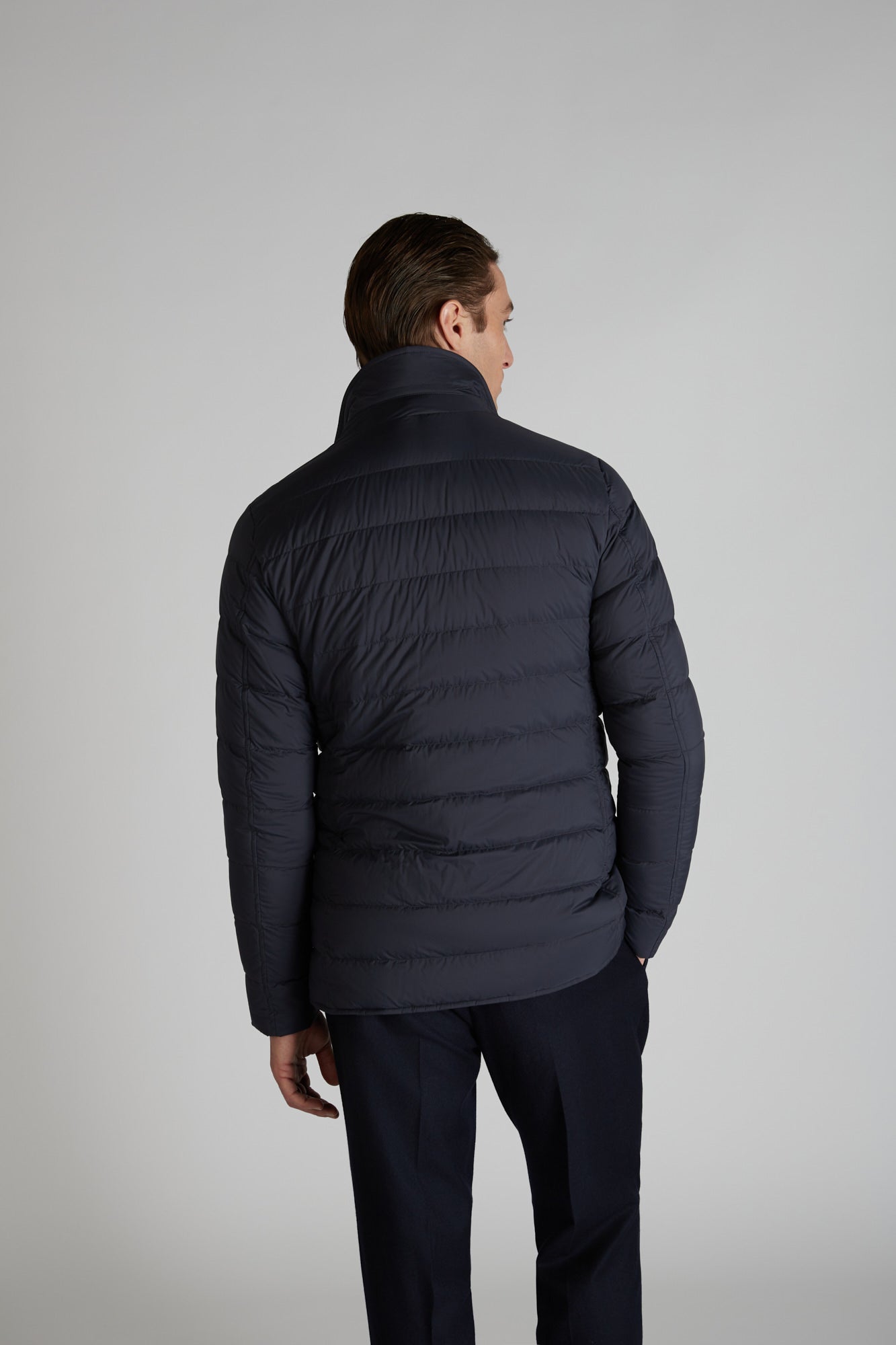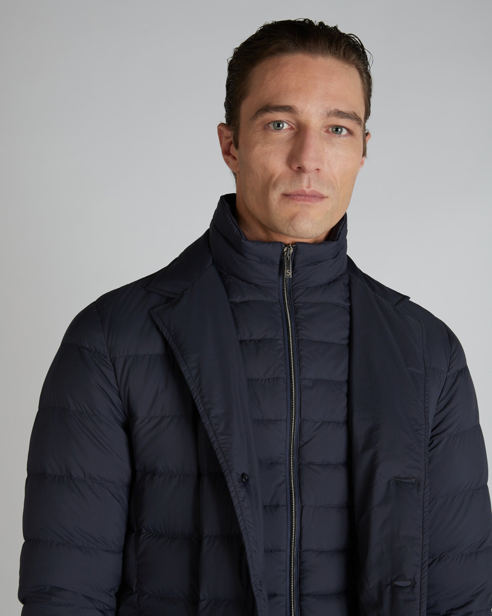 The very essence of the outerwear concept, this garment is the embodiment of refined style and technical performance. In the manufacturing details, reference is made to the traditional blazer of the male wardrobe, while the composition and choice of materials reflect the avant-garde of technical outerwear. On the outside, the blazer is made of a water-repellent technical fabric treated with a polyurethane resin to ensure maximum protection and water repellence. Inside, the padding is made using one of the most innovative technical processes and the best part of the down and goose feather. The garment also features a removable windproof waistcoat.
