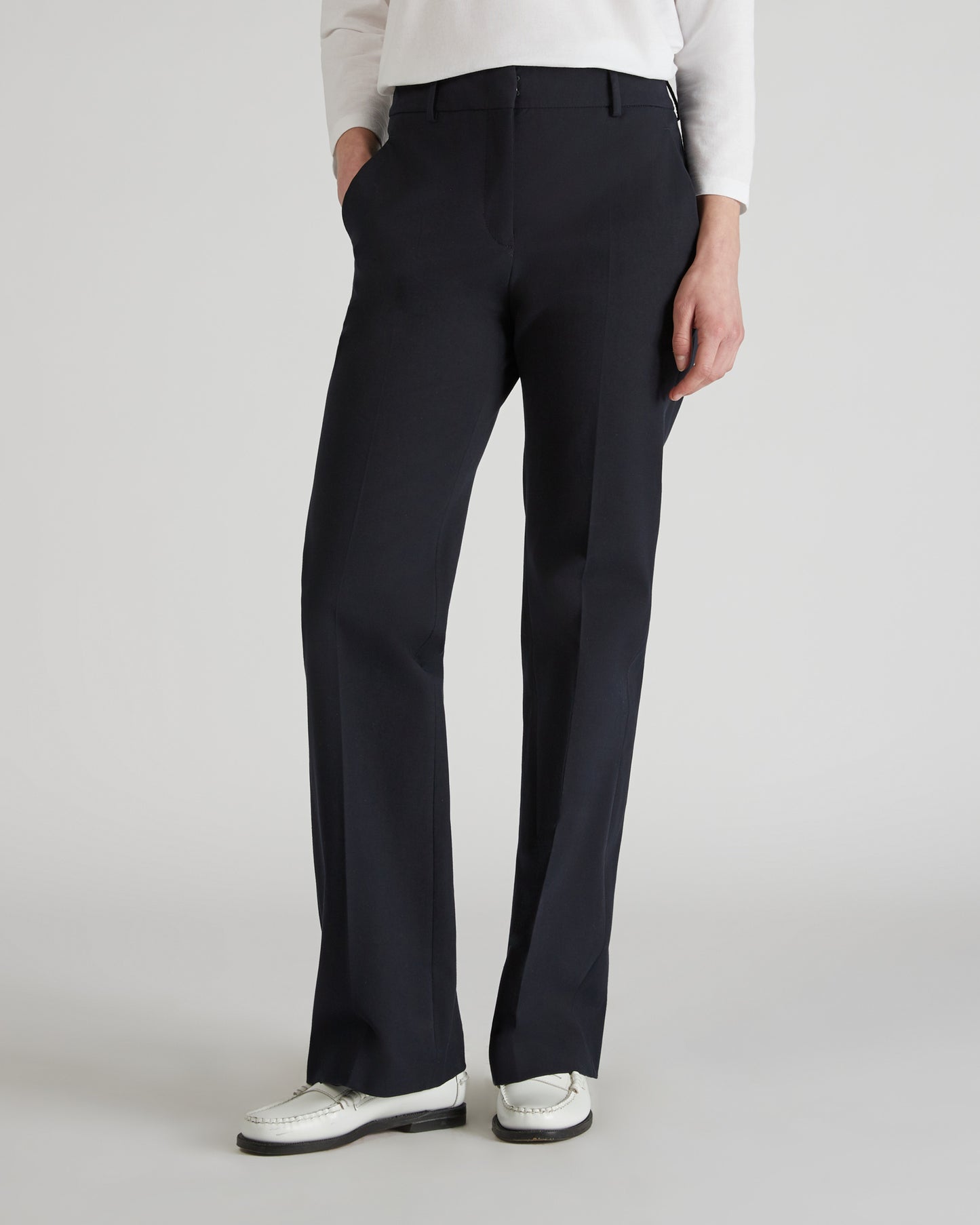 • The trousers have slash front pockets, single-welt back pockets and flared leg hems