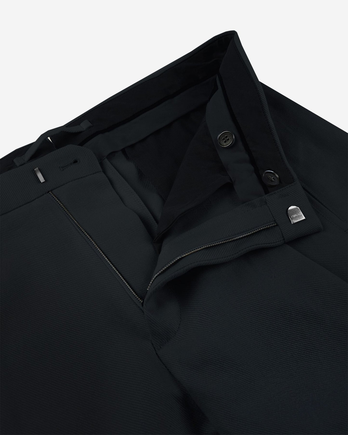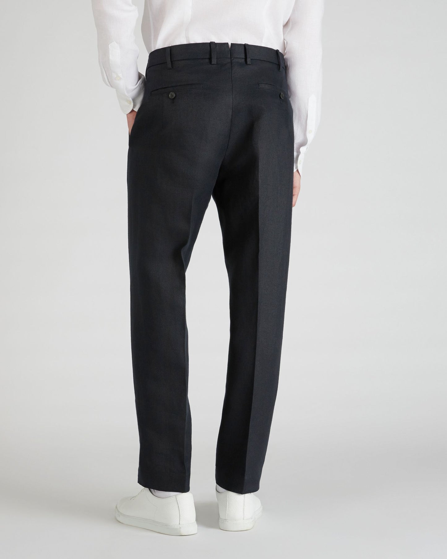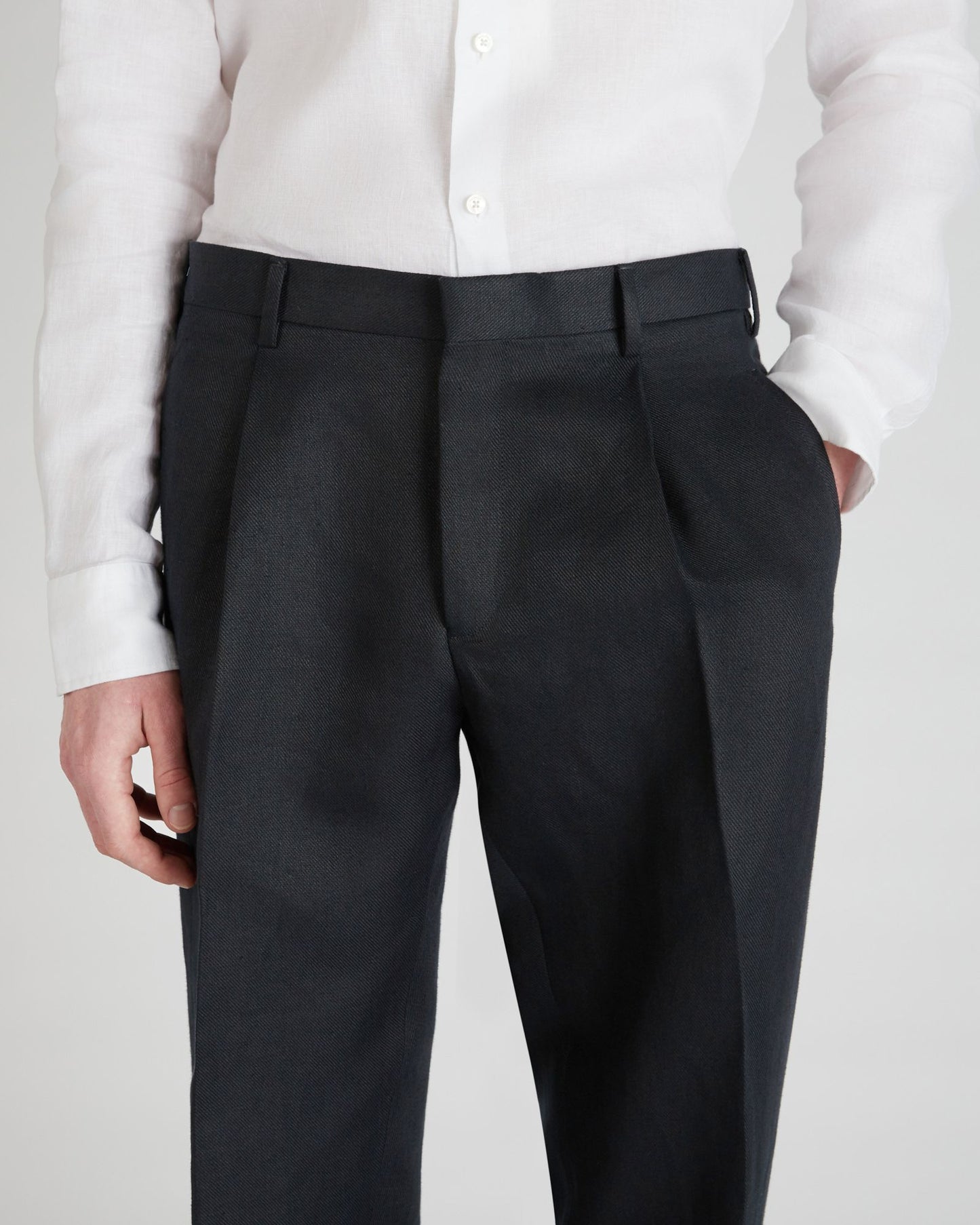 • The trousers have a front pleat, front welt pockets, and buttoned single-welt back pockets.