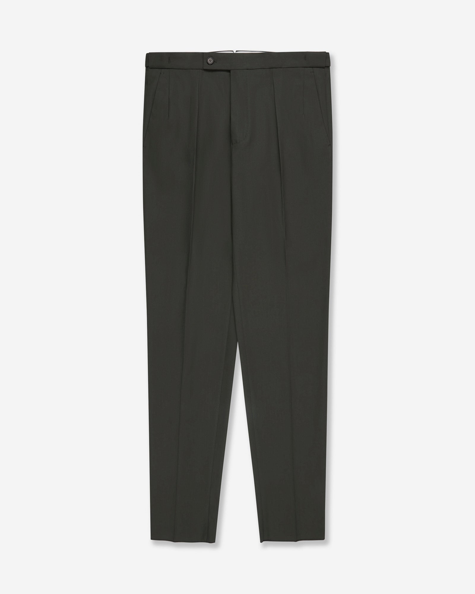 - Le pantalon présente une fermeture à glissière autobloquante, une ceinture prolongée angulaire avec crochet interne, une ceinture continue à l’arrière avec ajusteurs latéraux, des poches avant à l’italienne, des poches arrière avec rabat et un double pli sur le devant.