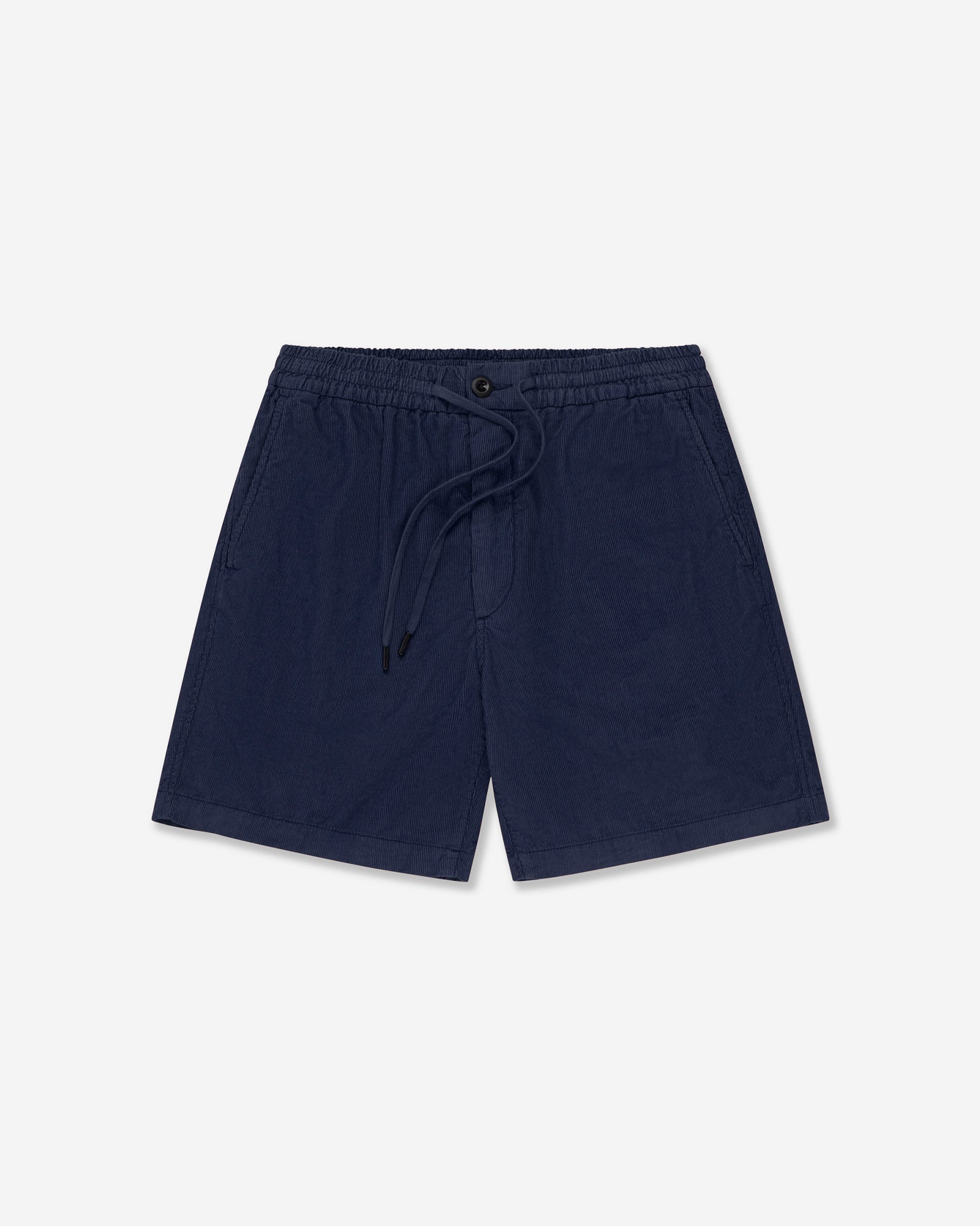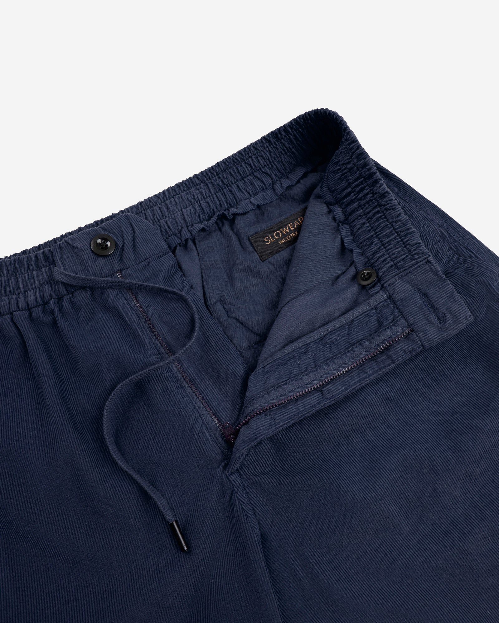 - Le pantalon présente une fermeture à glissière autobloquante, des poches avant à l’italienne, des poches arrière à double passepoil avec bouton, un élastique et un cordon de serrage apparent à la taille.
